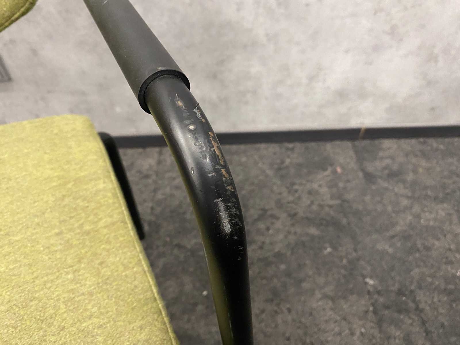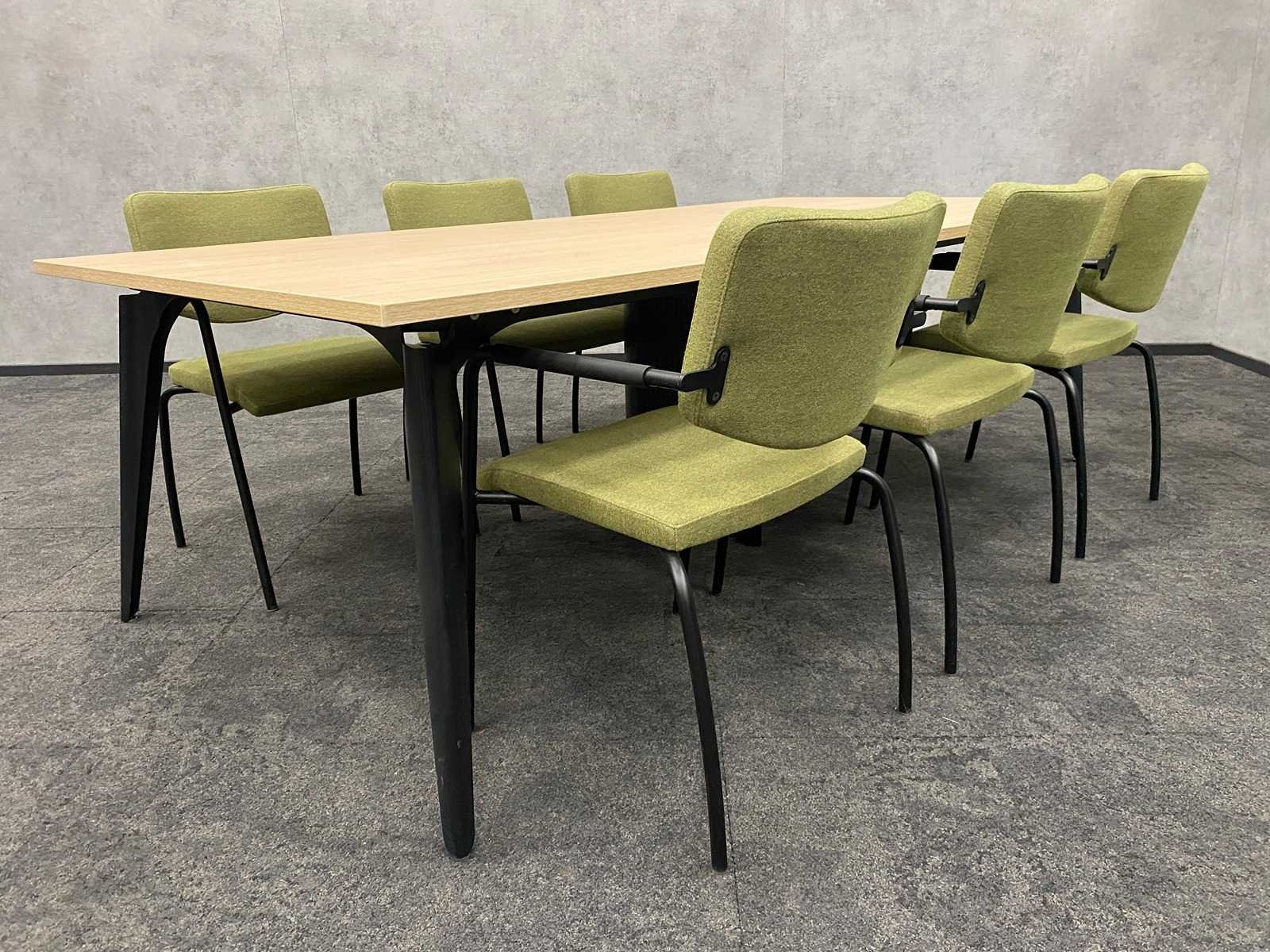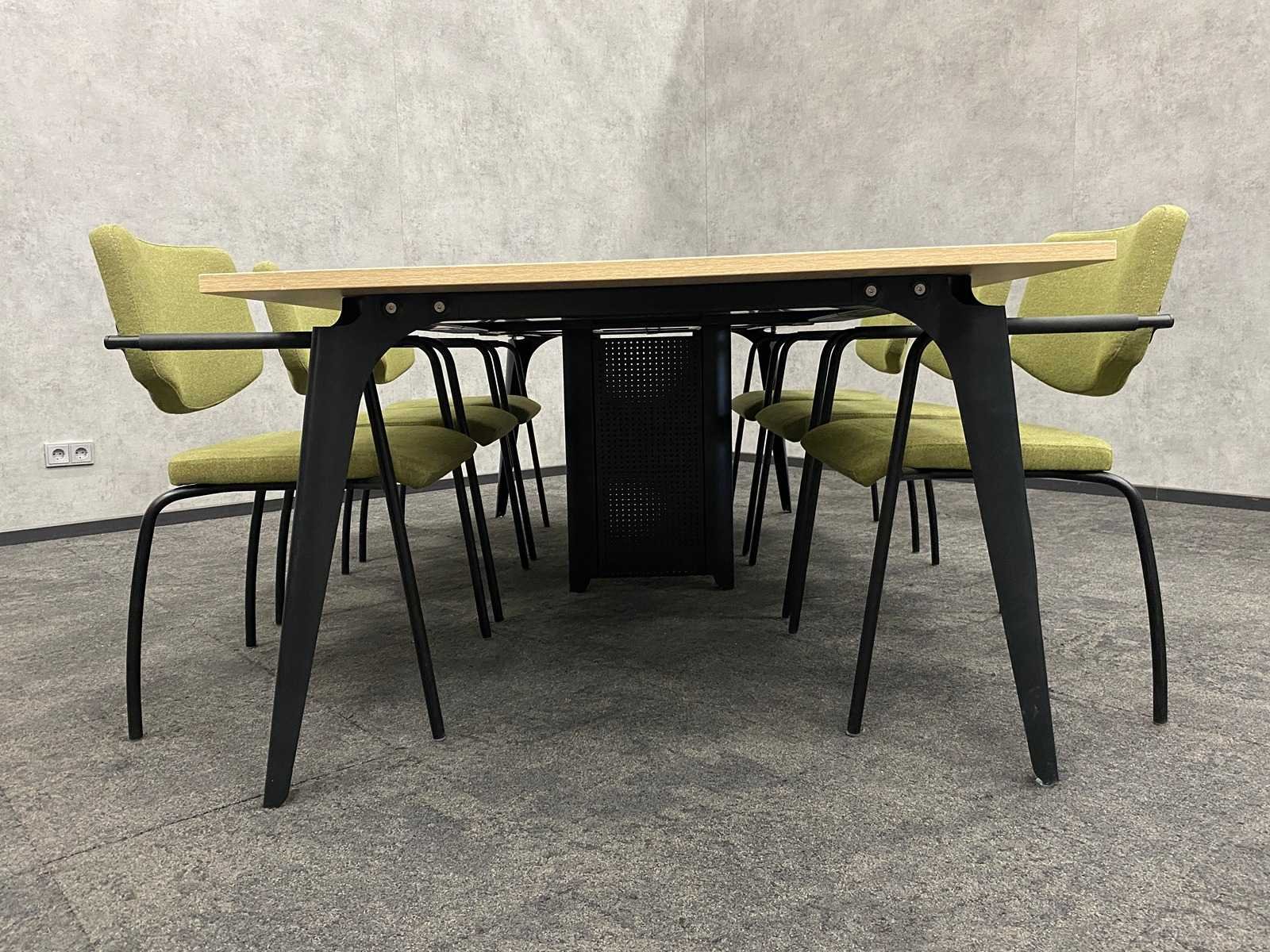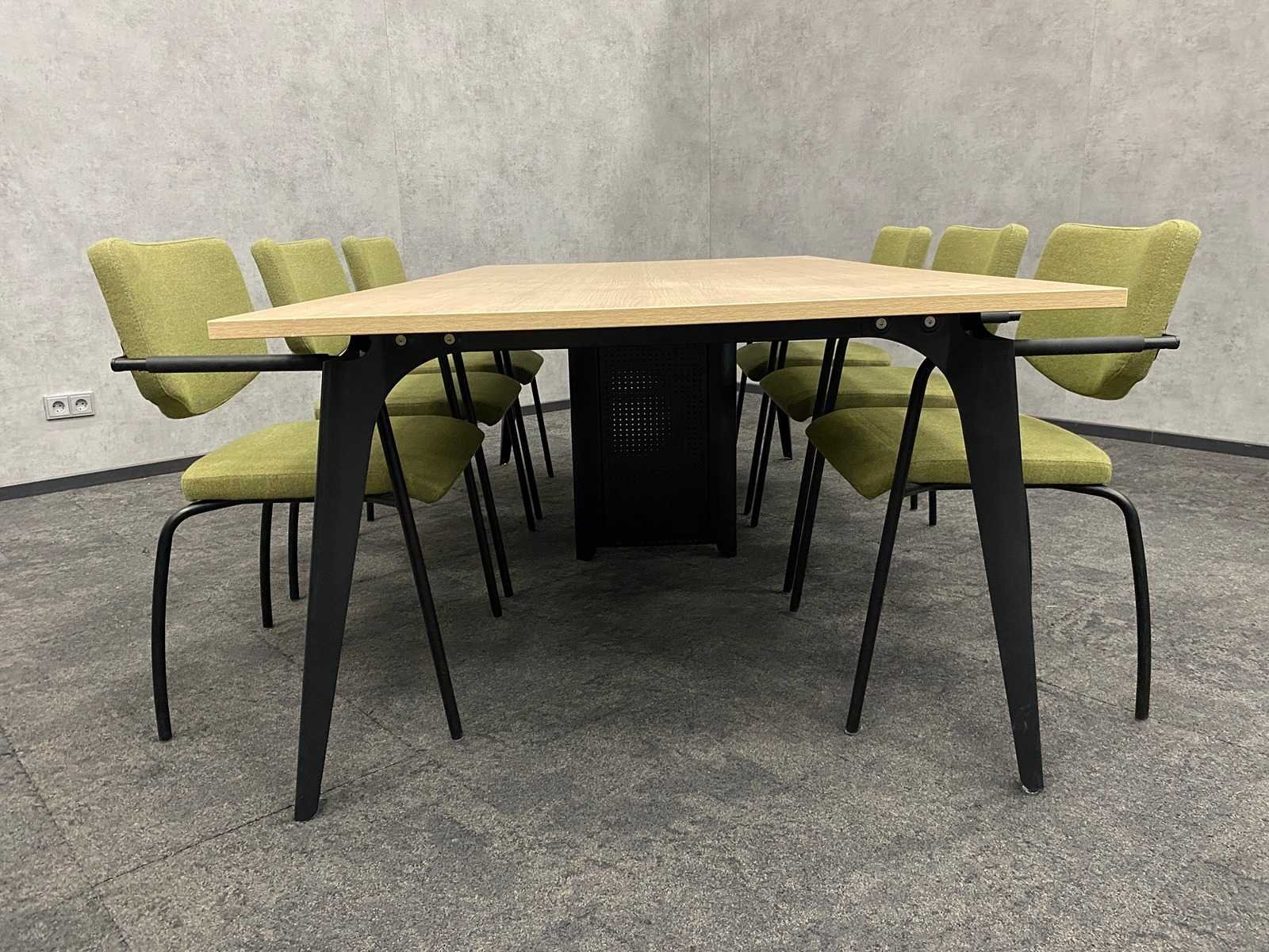 Kavel bestaande uit 6x nestelbare vergaderstoel en 1x vergadertafel. Nee Kleur: mosgroen, zwart, eiken Lengte: 240cm Breedte: 120cm Hoogte: 77cm