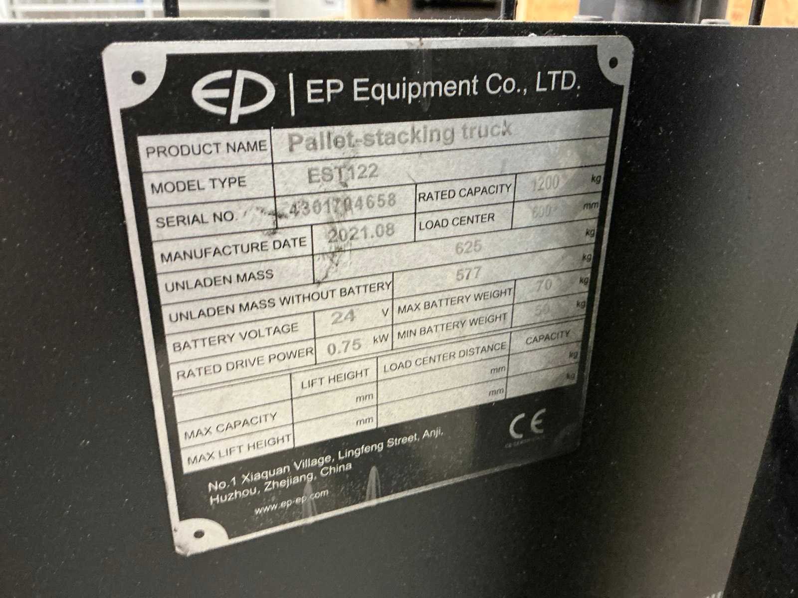Nee Merk: EP Type: EST122 Bouwjaar: 2021 Serienummer: 4301704658 Hefvermogen: 1200kg Hefhoogte: 3300mm Lepellengte: 1150mm Afgelezen urenstand: 62 Minimale doorrijhoogte: 2270mm