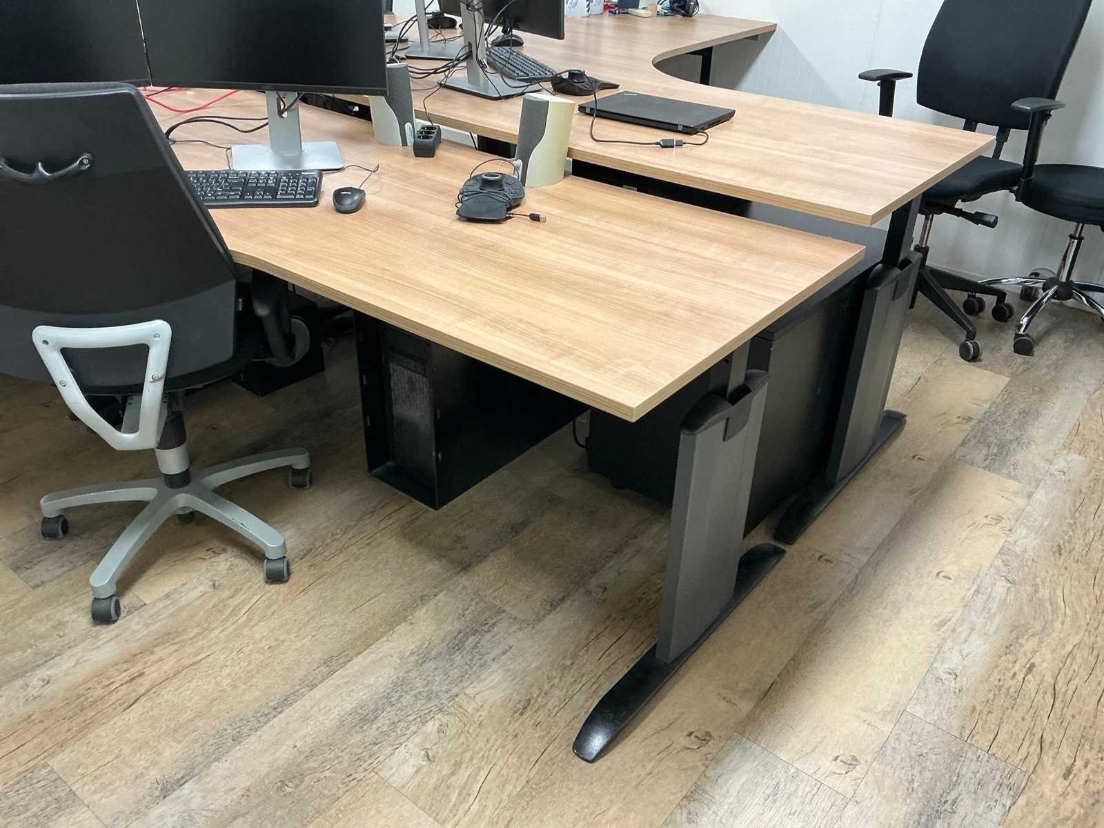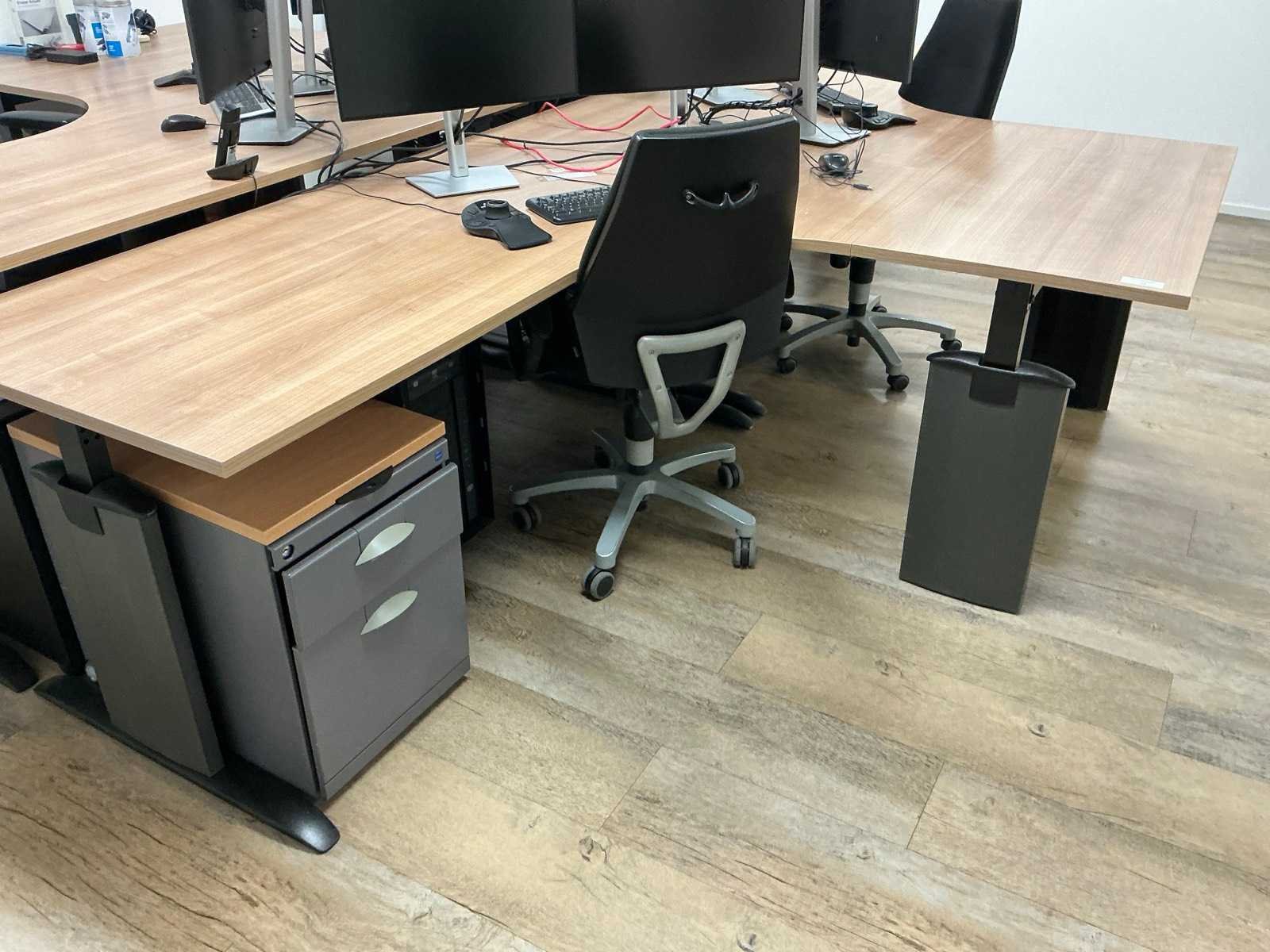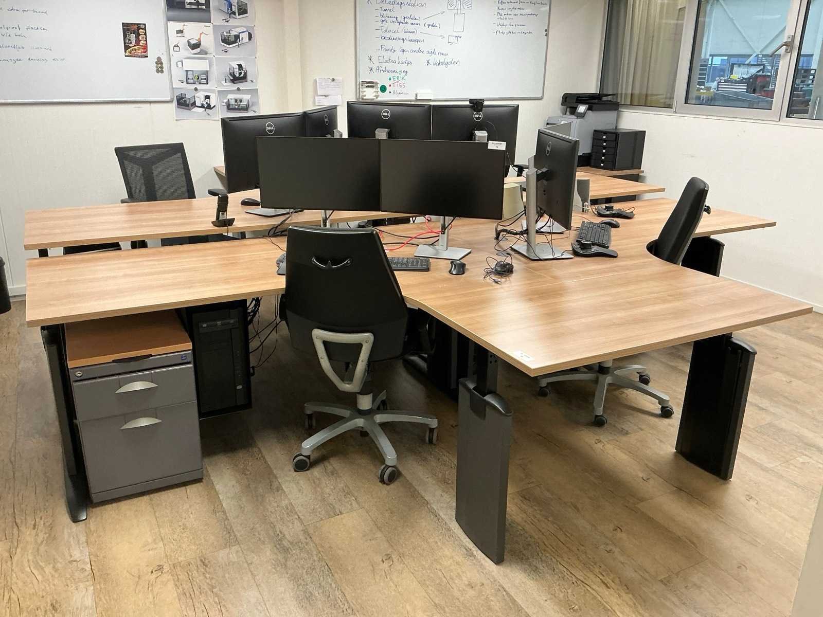 Vier werkplekken inclusief stoelen, 3 ladenblokken, 2 whiteboards en 2 jaloeziedeurkasten. Exclusief computers. Afmeting per bureau zonder aanbouwdeel: 180x120 cm. De bureaus staan gekoppeld en dienen gedemonteerd te worden. Nee Lengte: 360cm Breedte: 360cm
