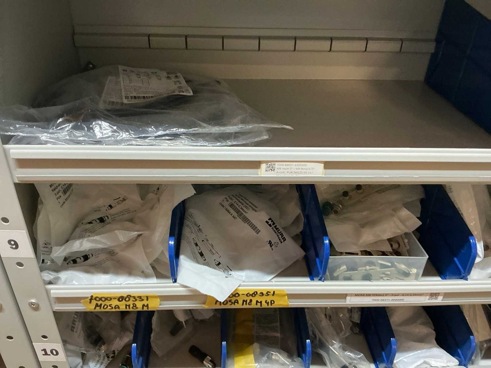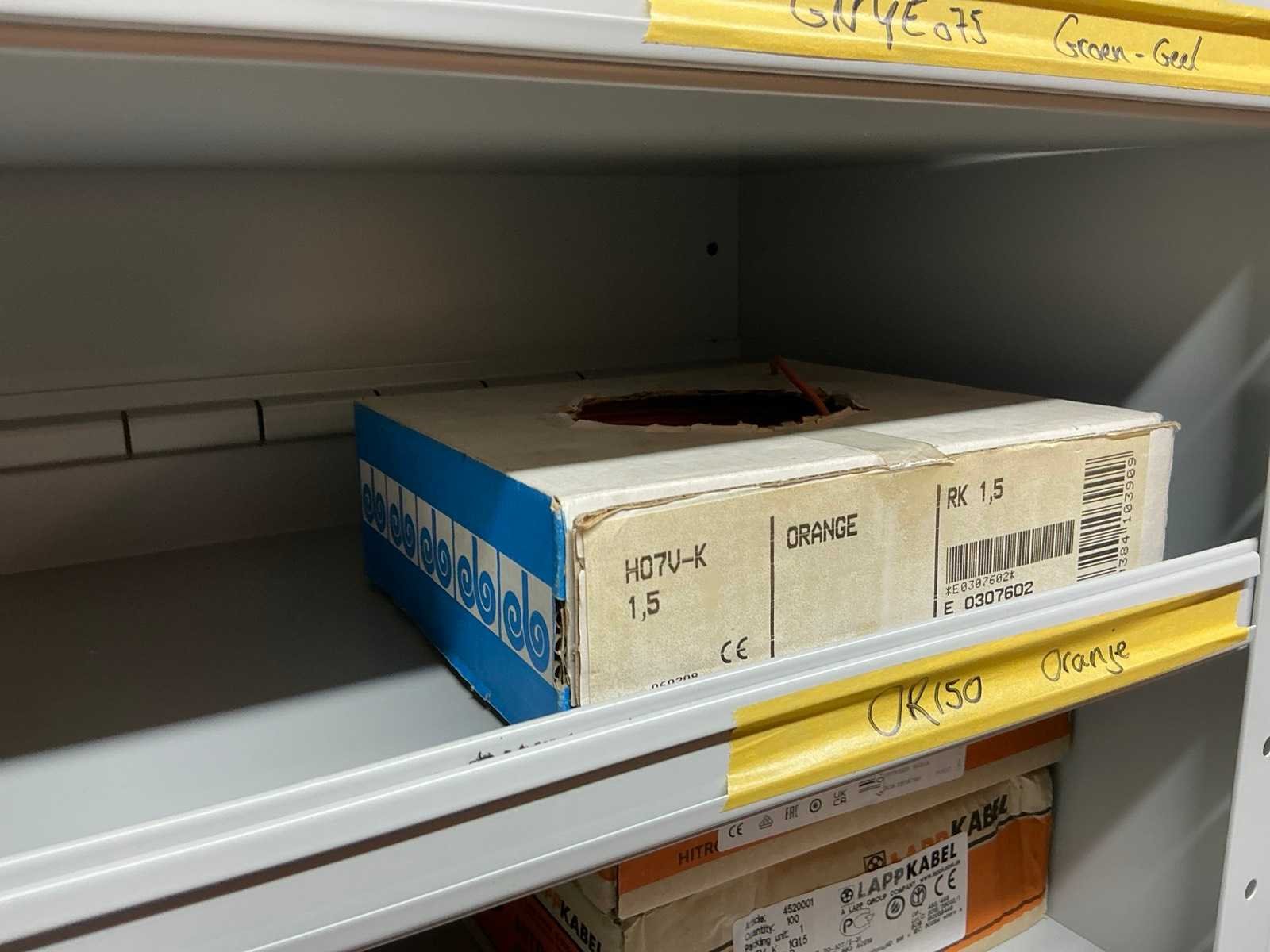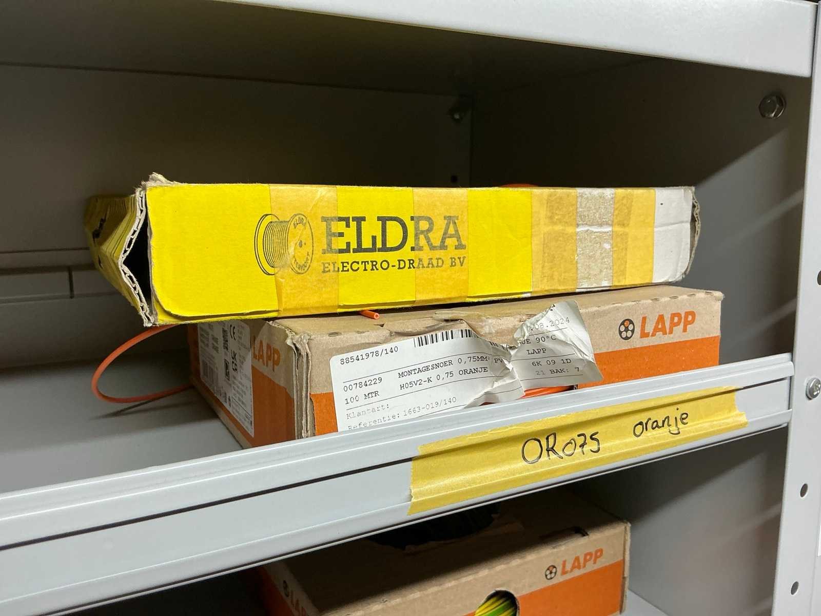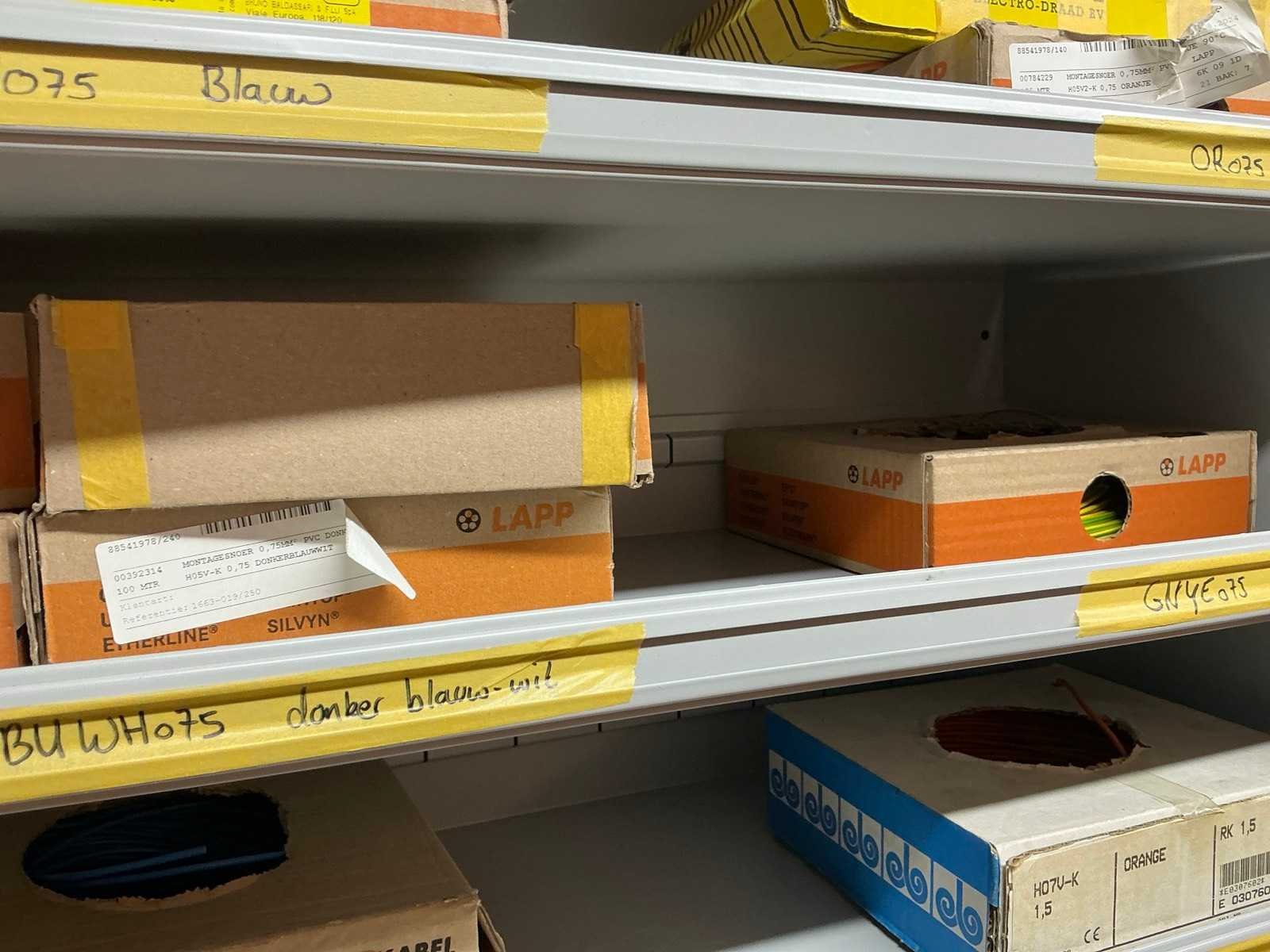Partij kabel en robotconnectoren in stalen vakkenkast (2x)