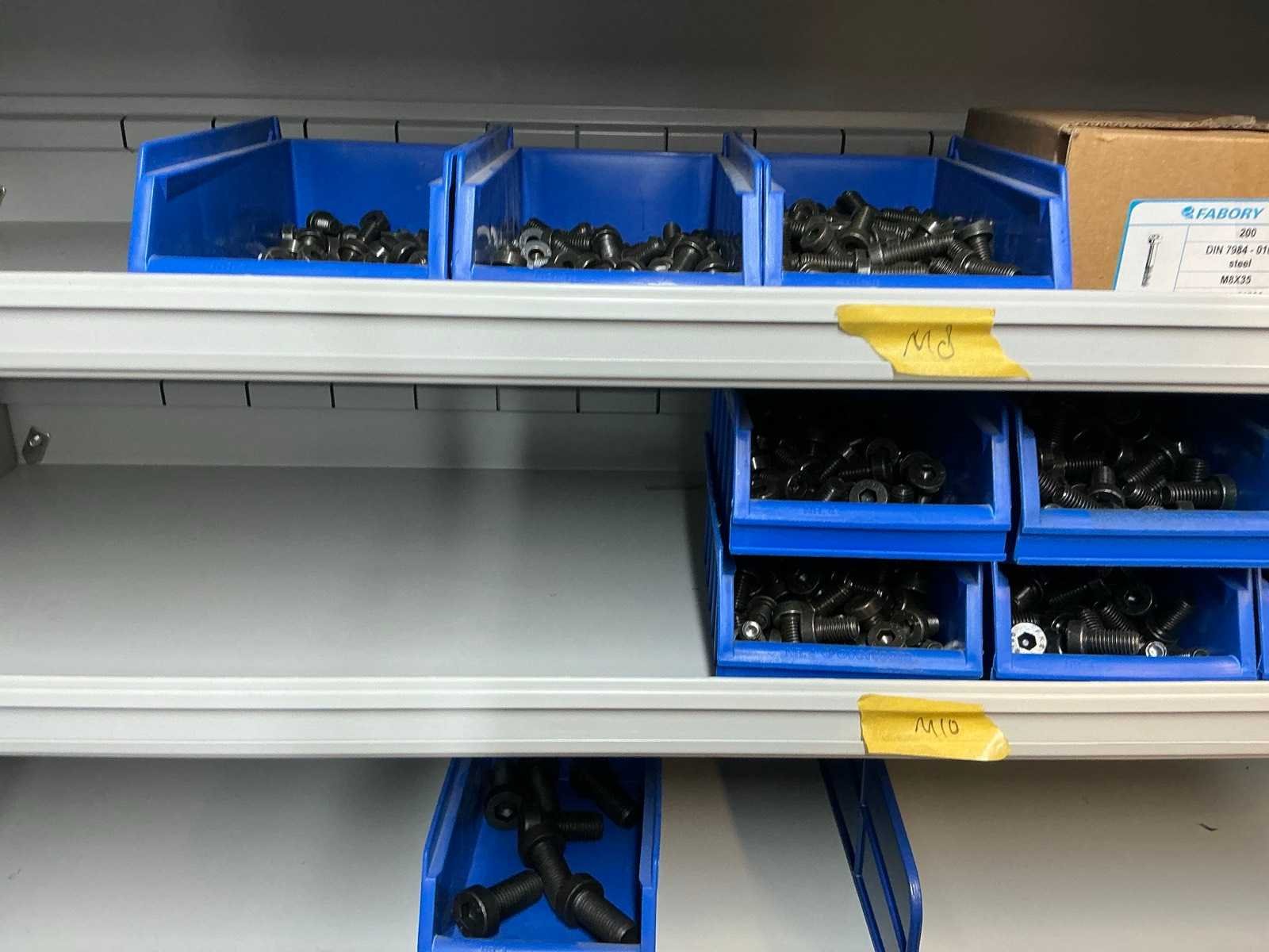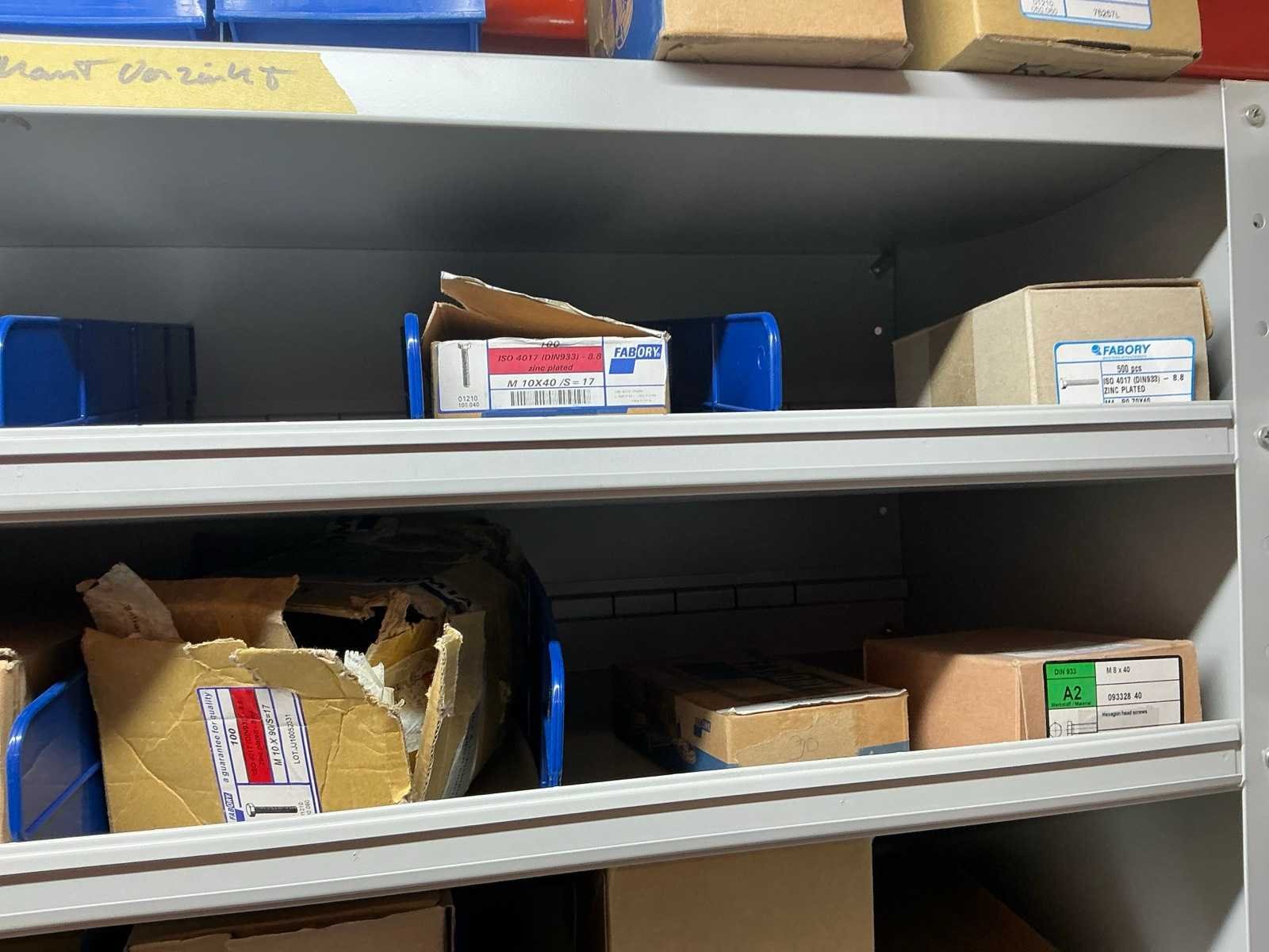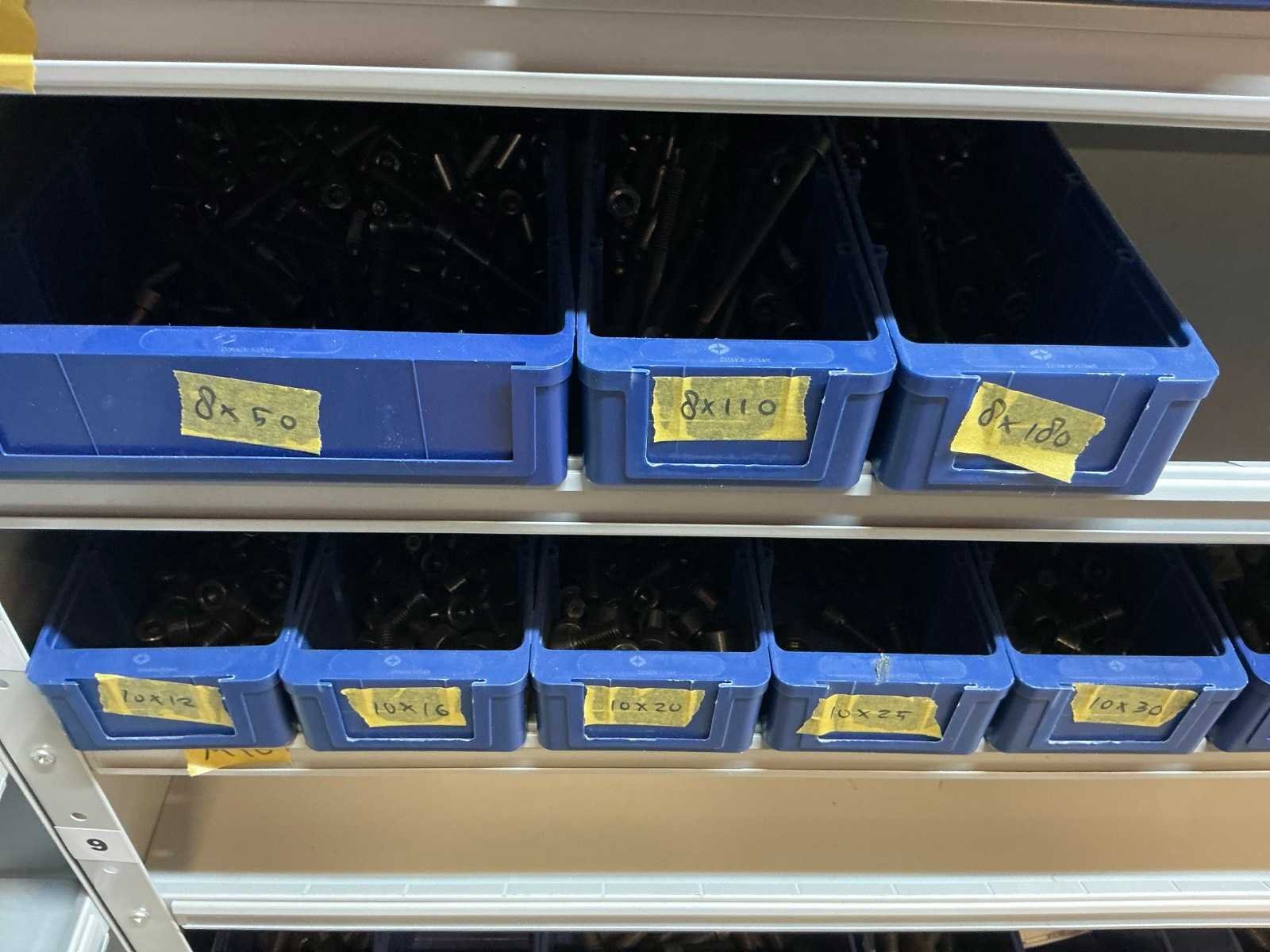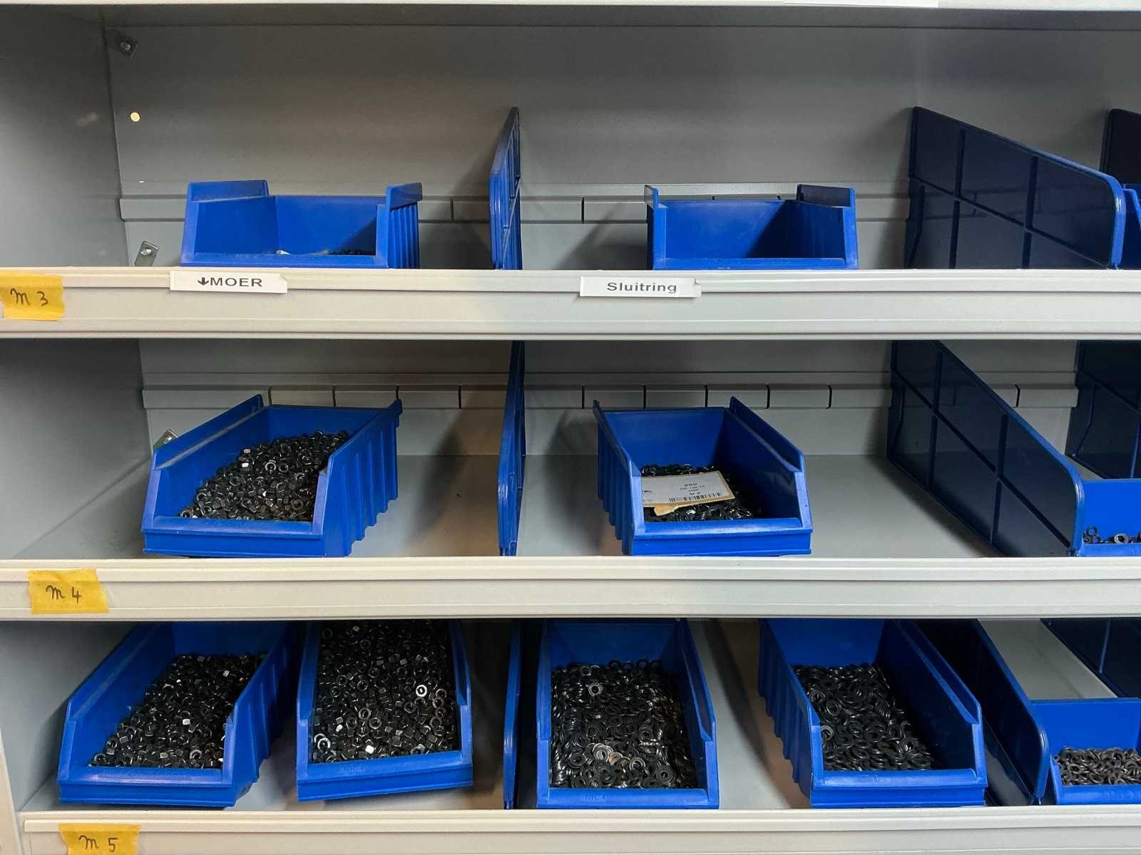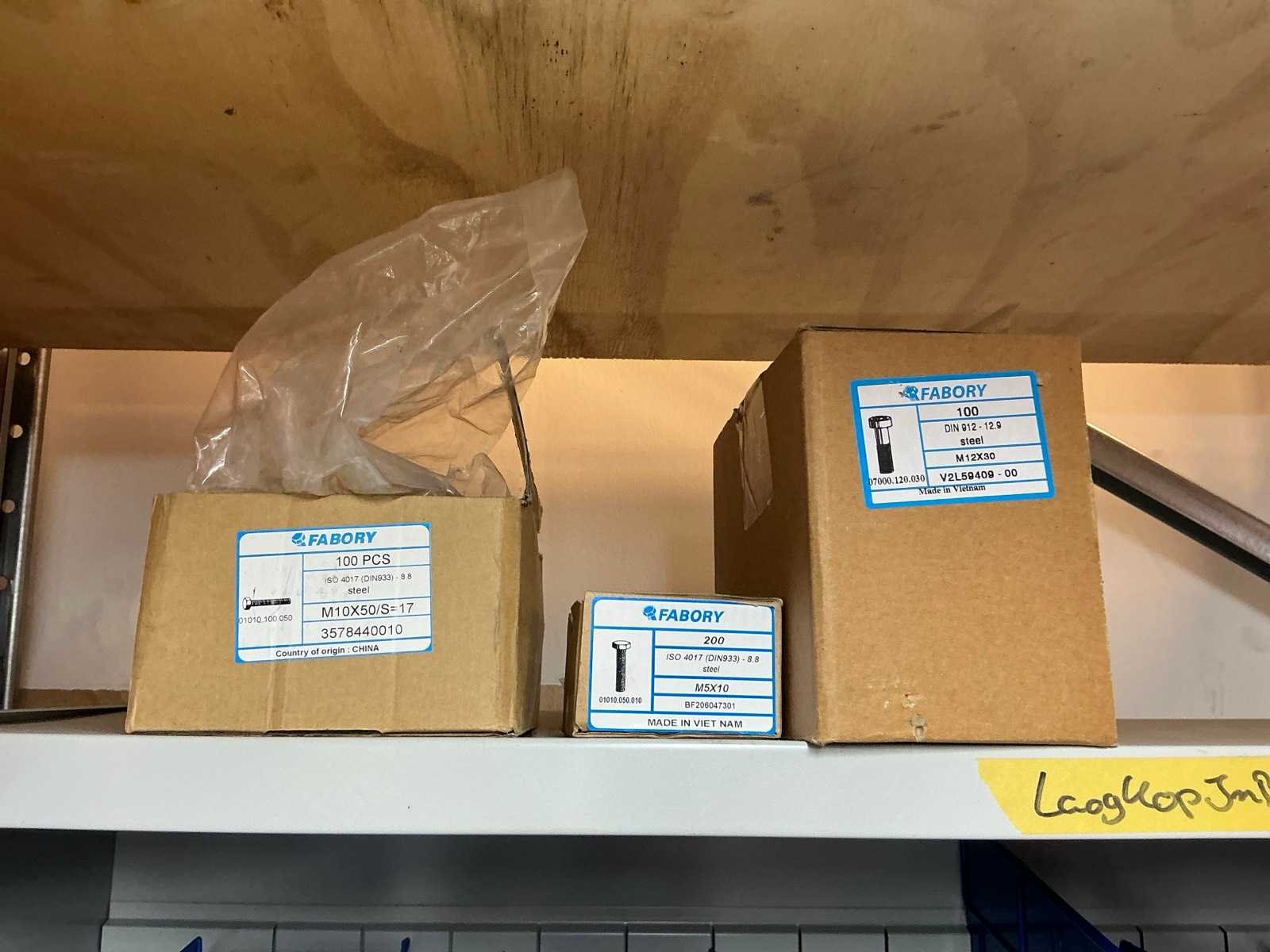 Afmeting per kast: 100x30x199 cm. Inhoud voornamelijk zwart stalen inbus bouten en moeren Nee
