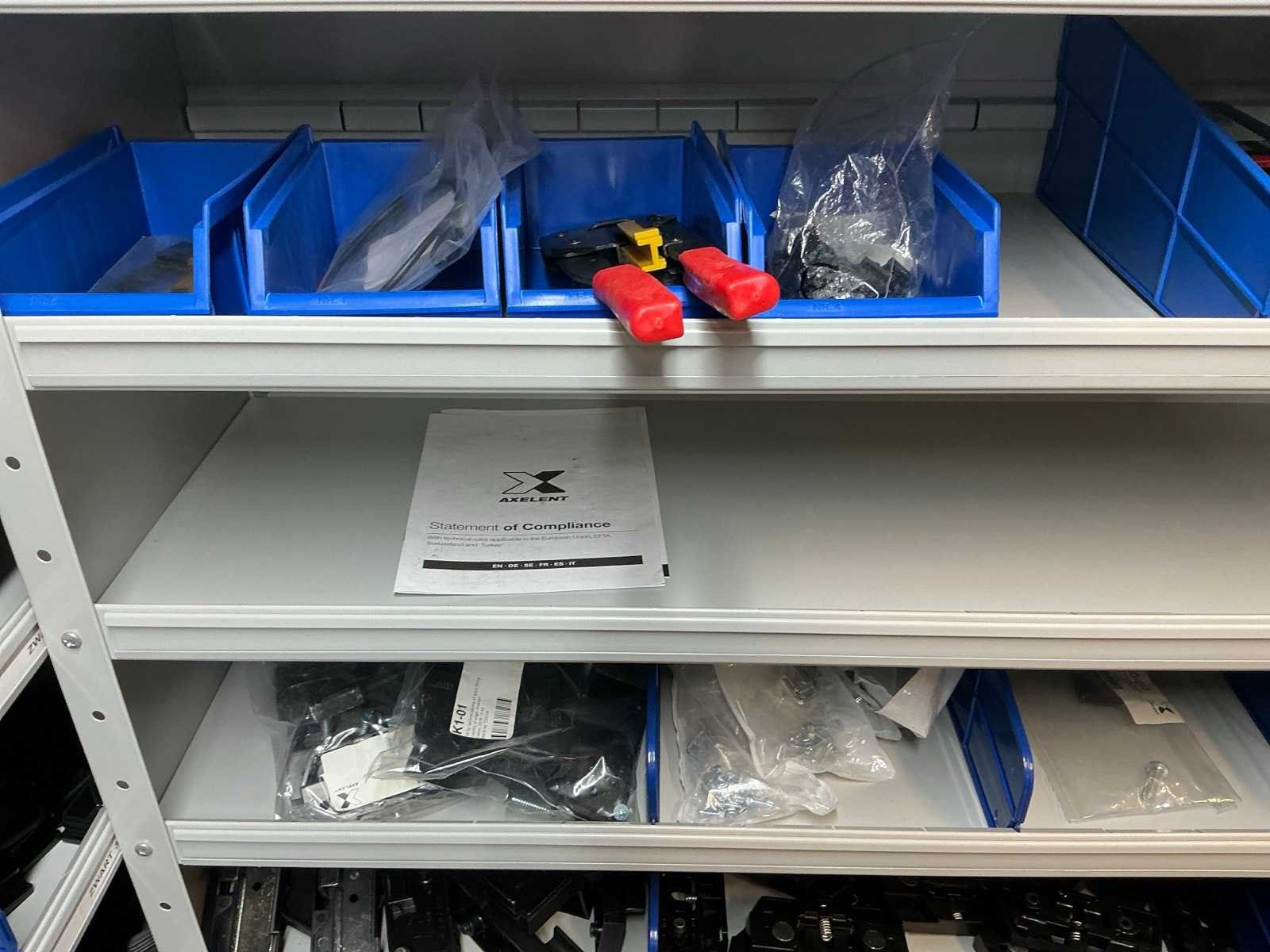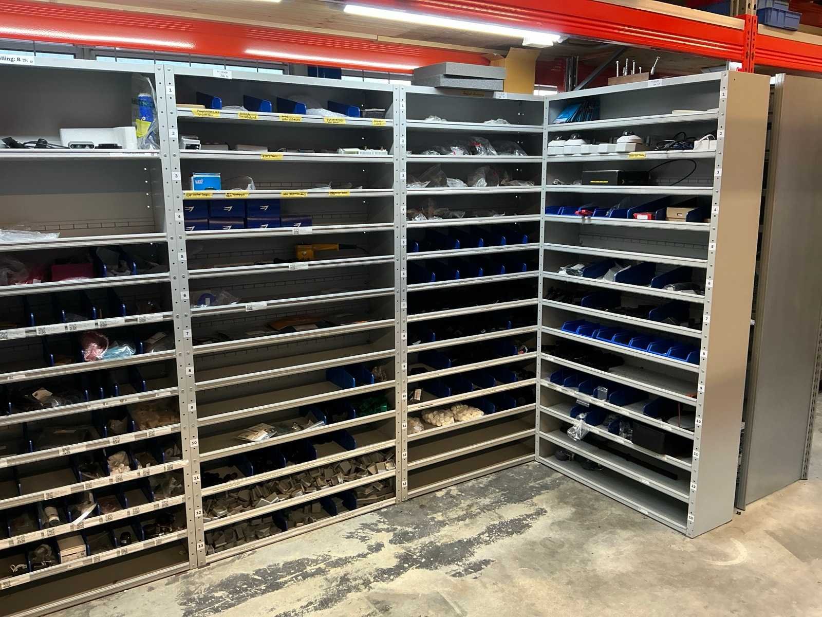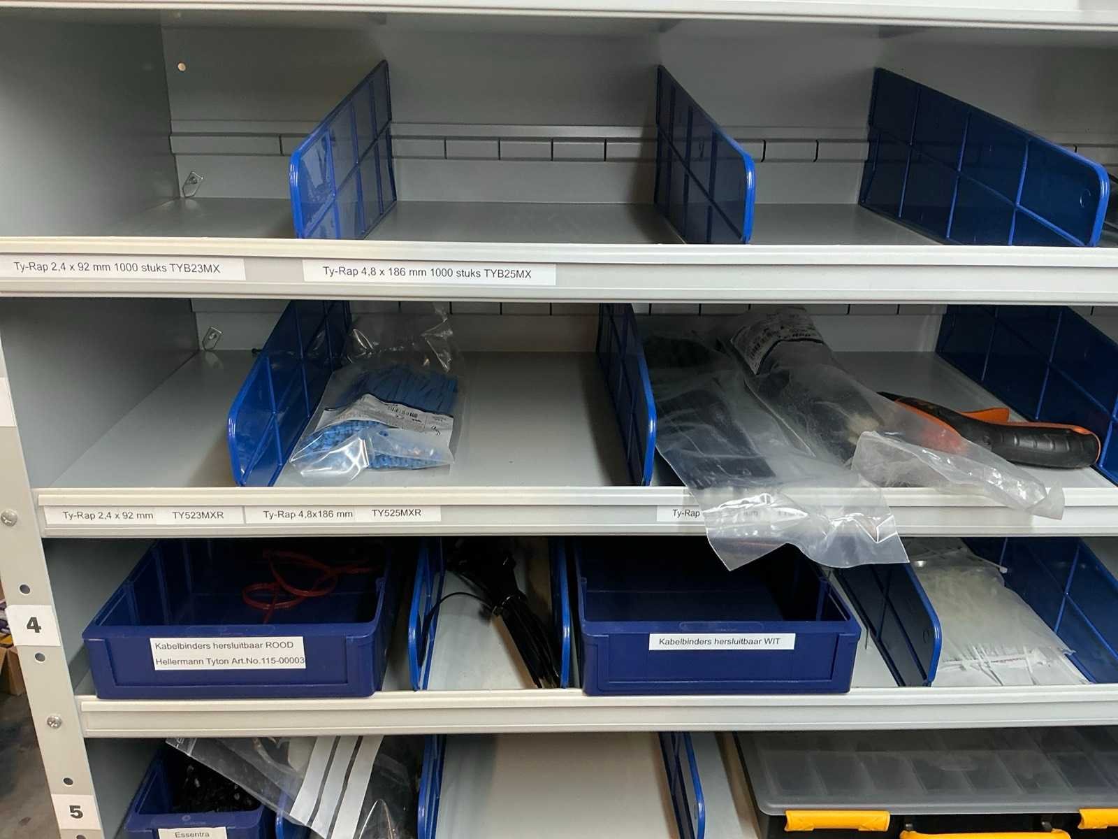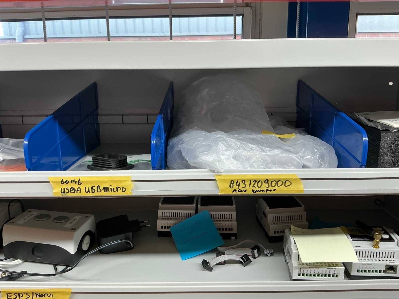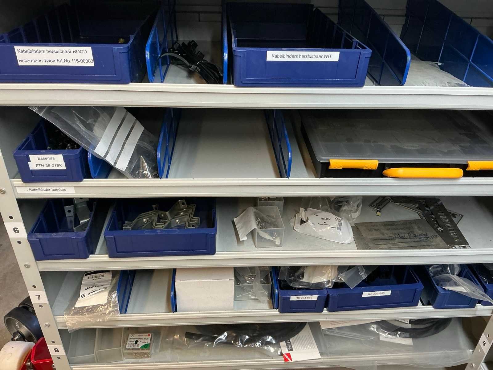 Stalen vakkenkast met elektrotechnische robotonderdelen (5x)