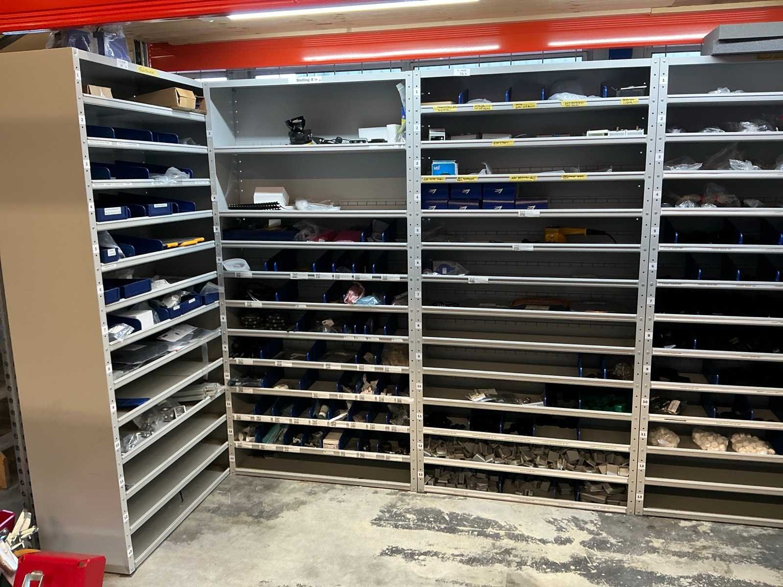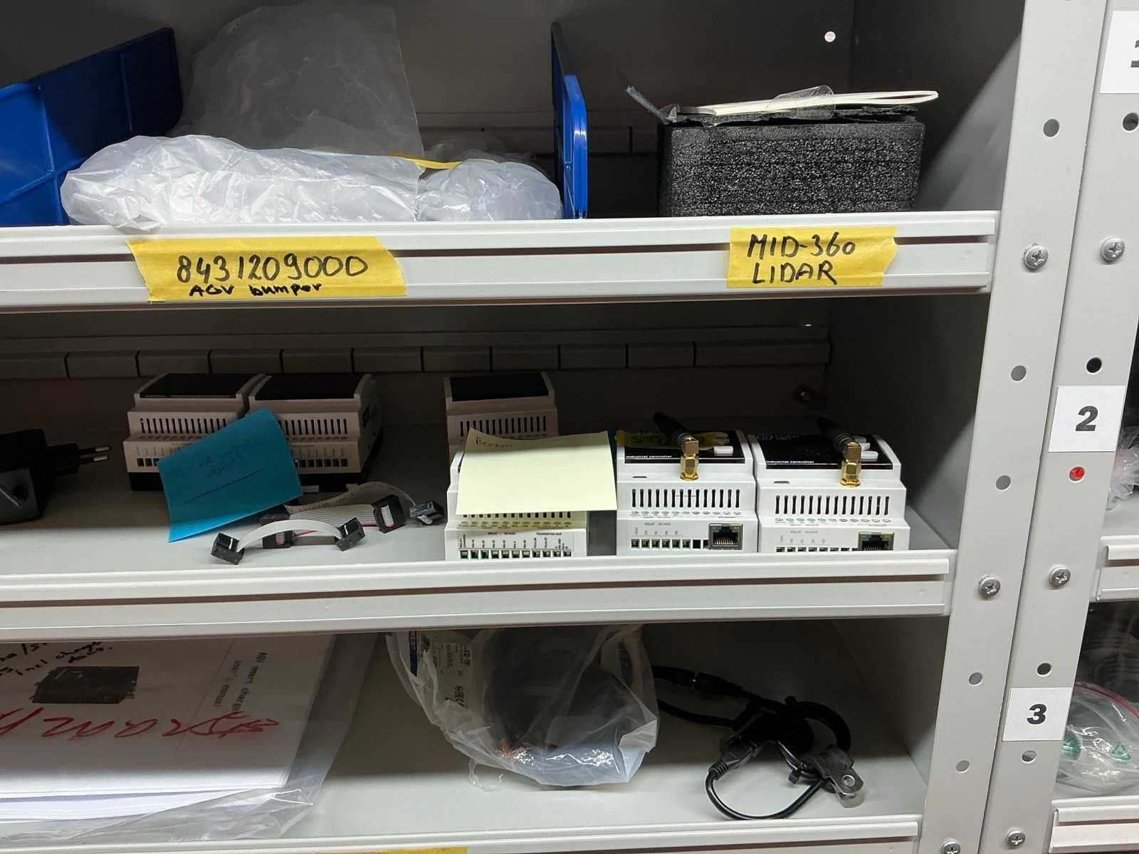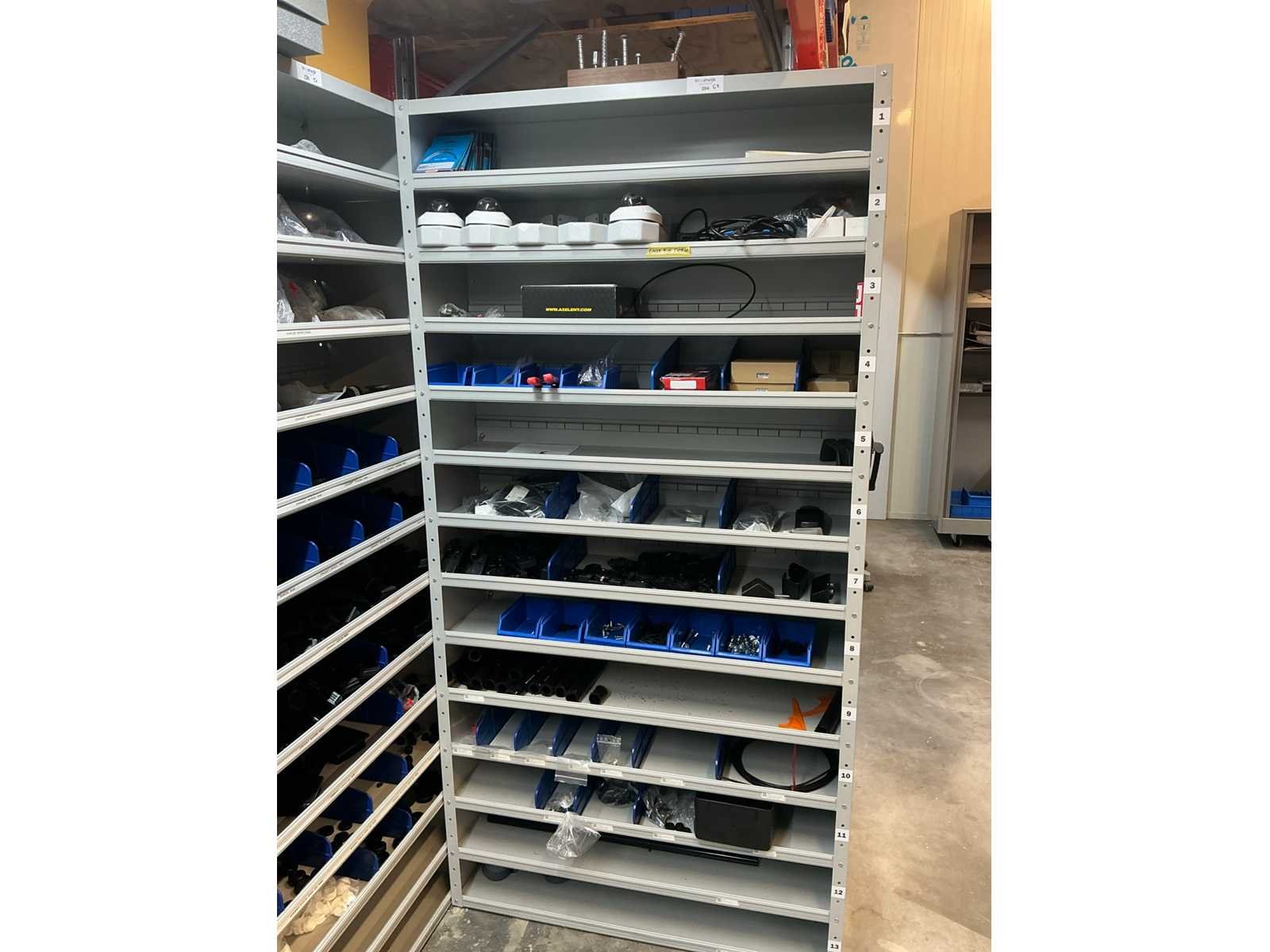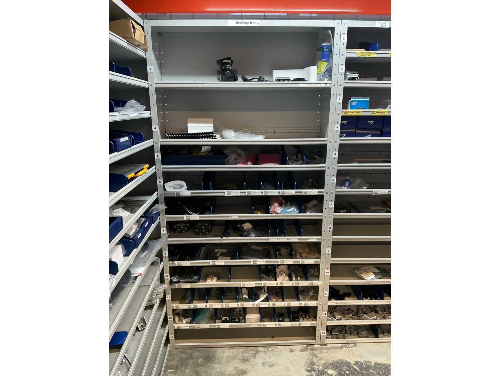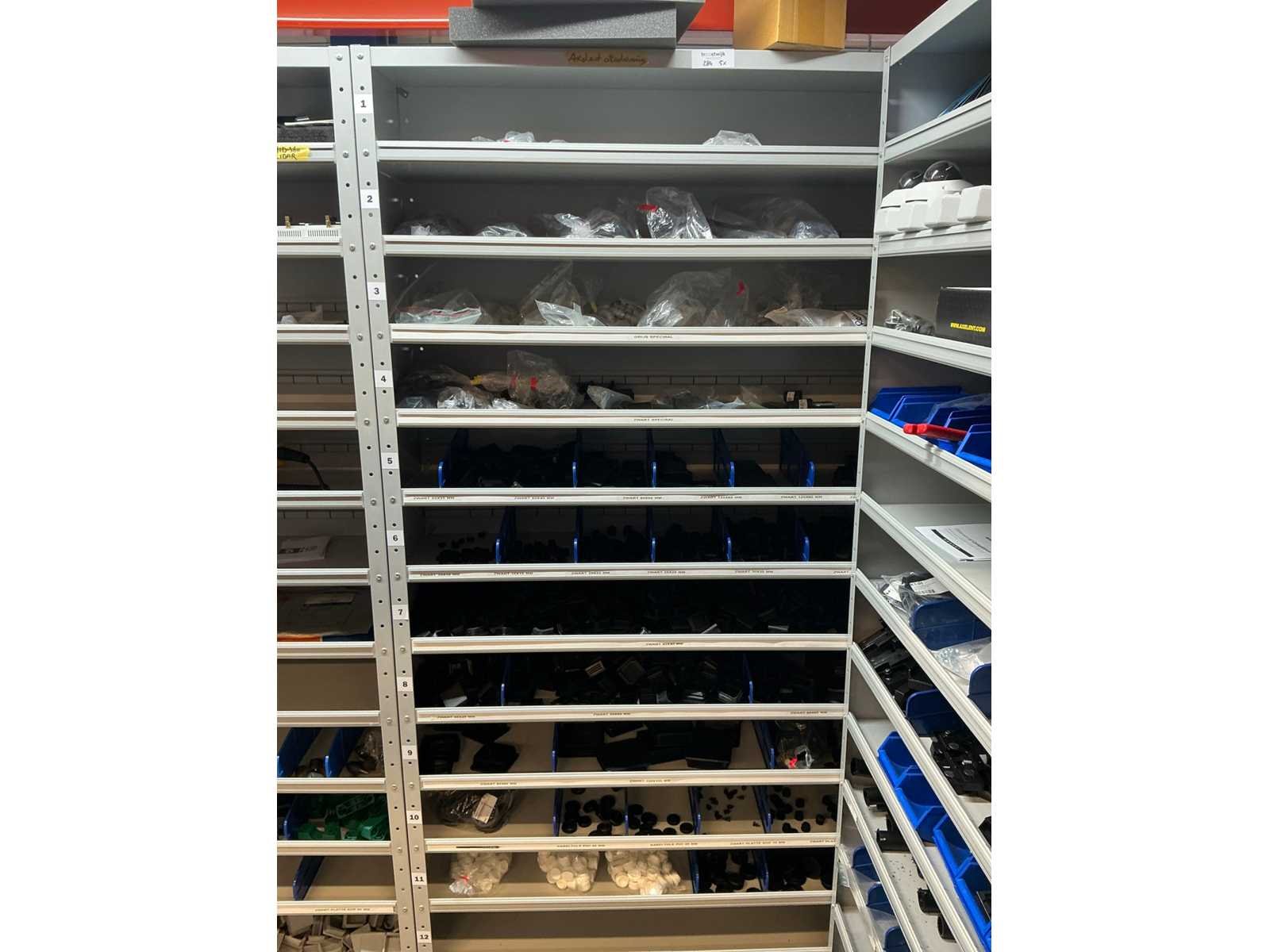 Stalen vakkenkast met elektrotechnische robotonderdelen (5x)