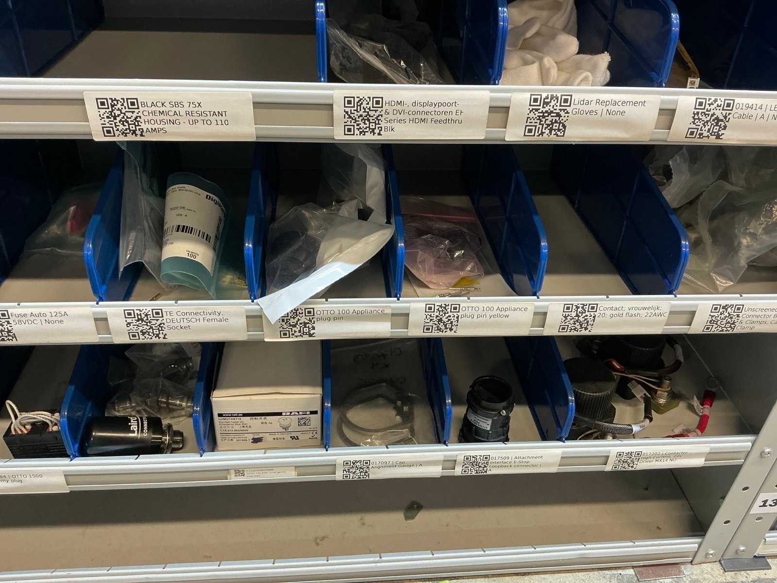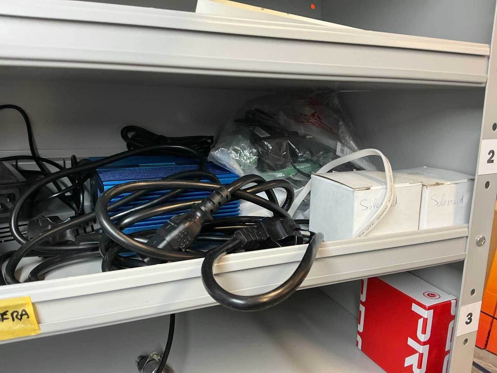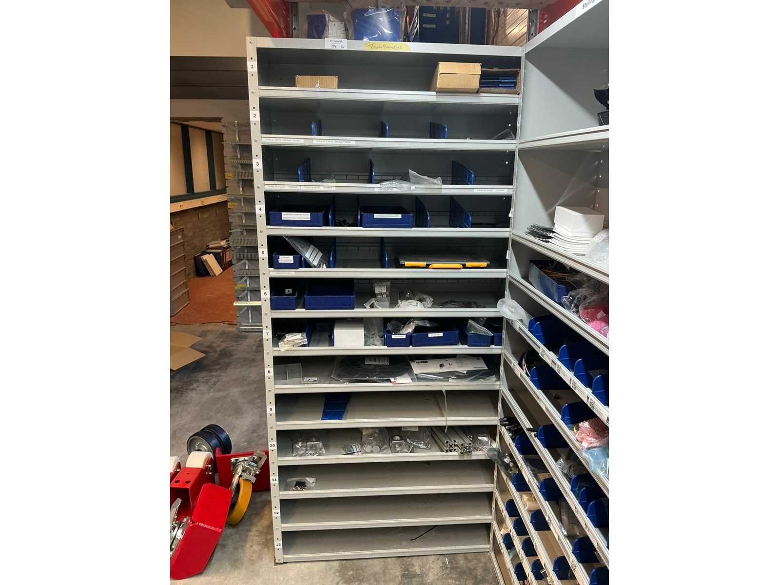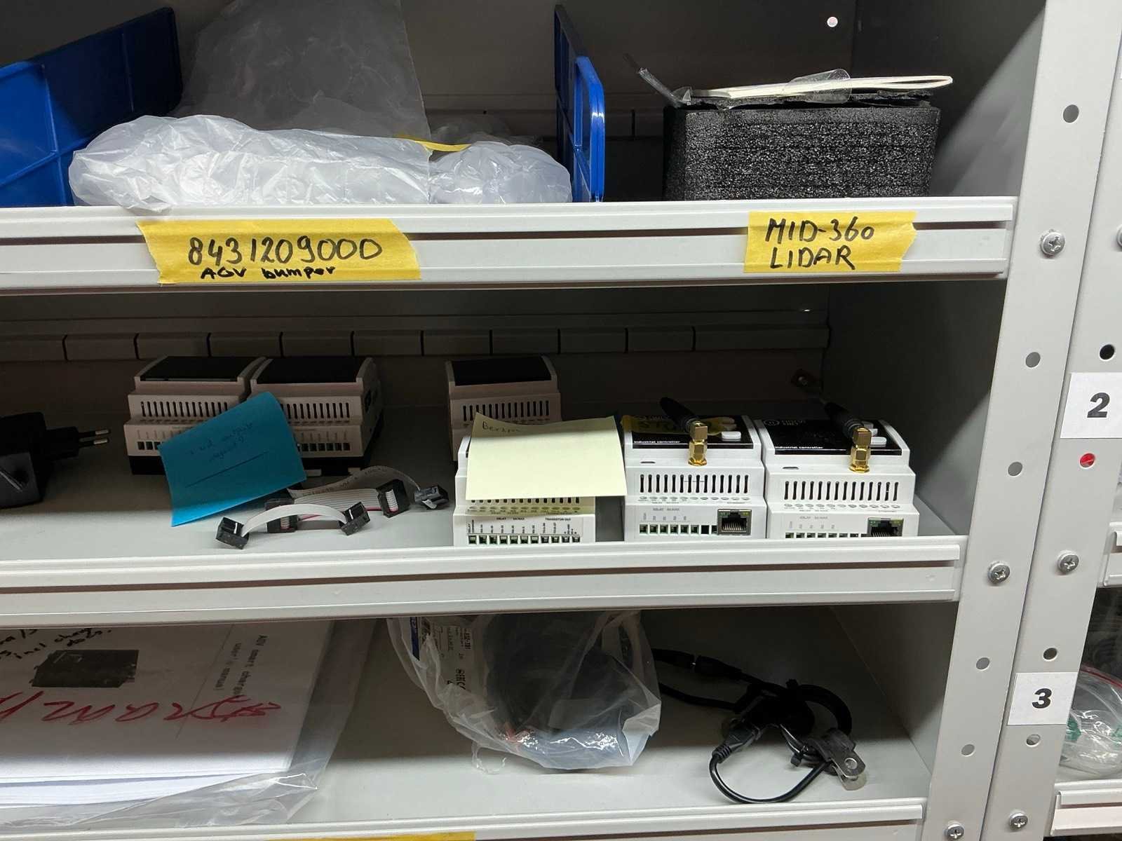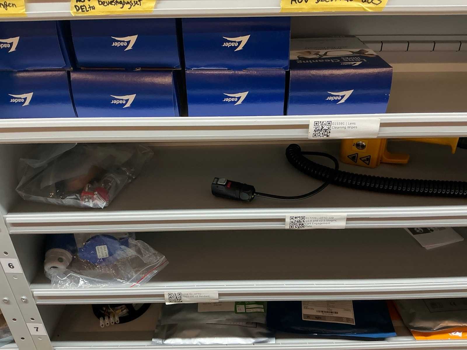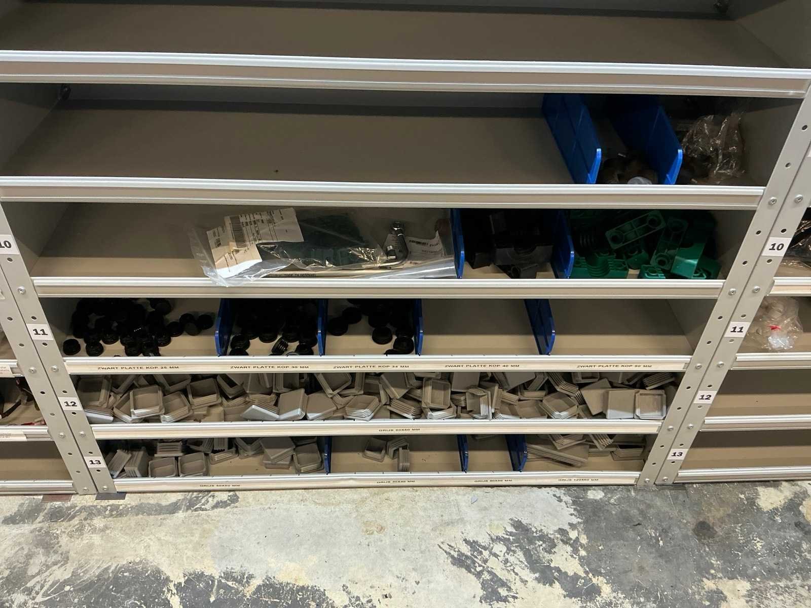 Stalen vakkenkast met elektrotechnische robotonderdelen (5x)