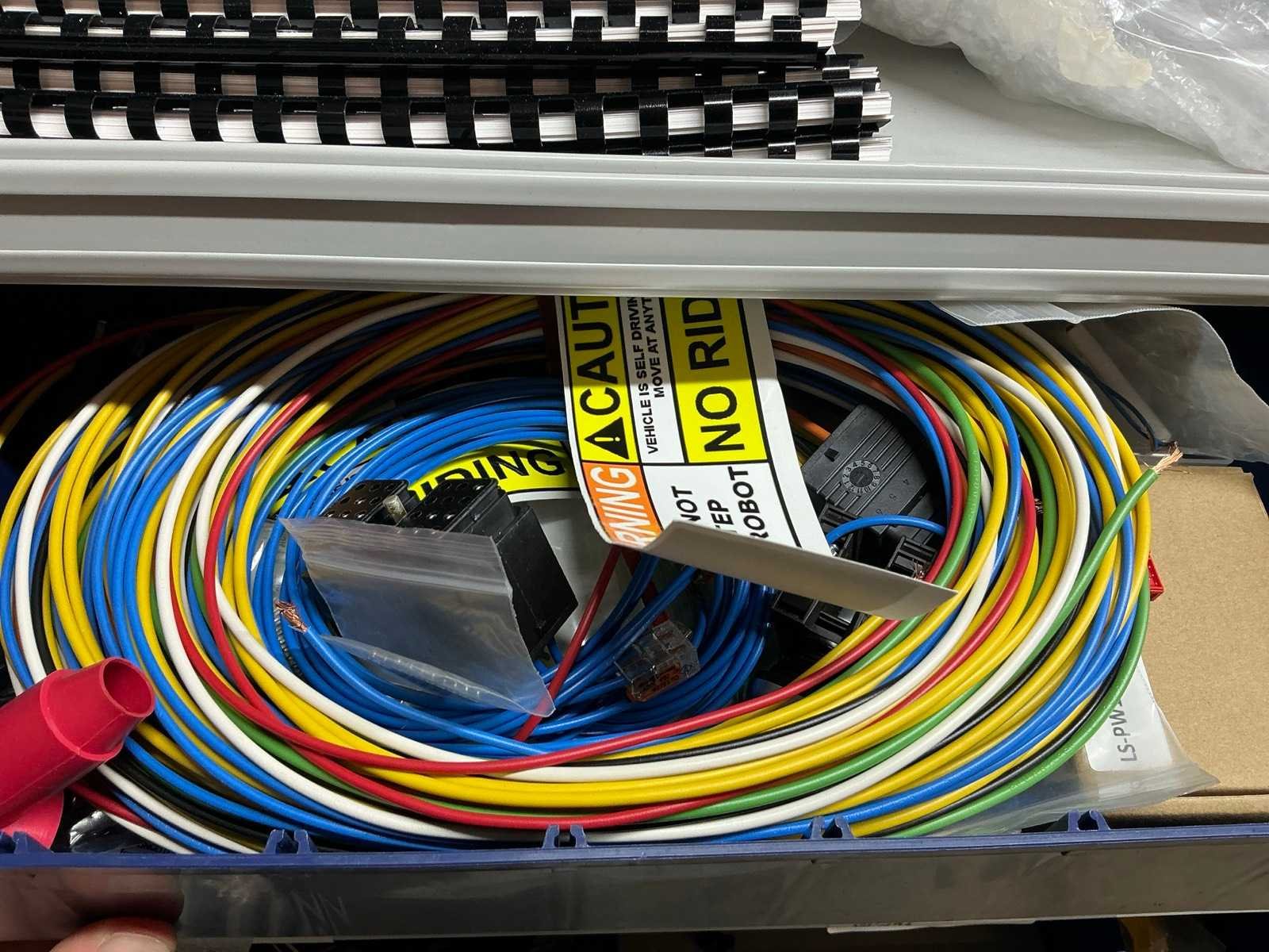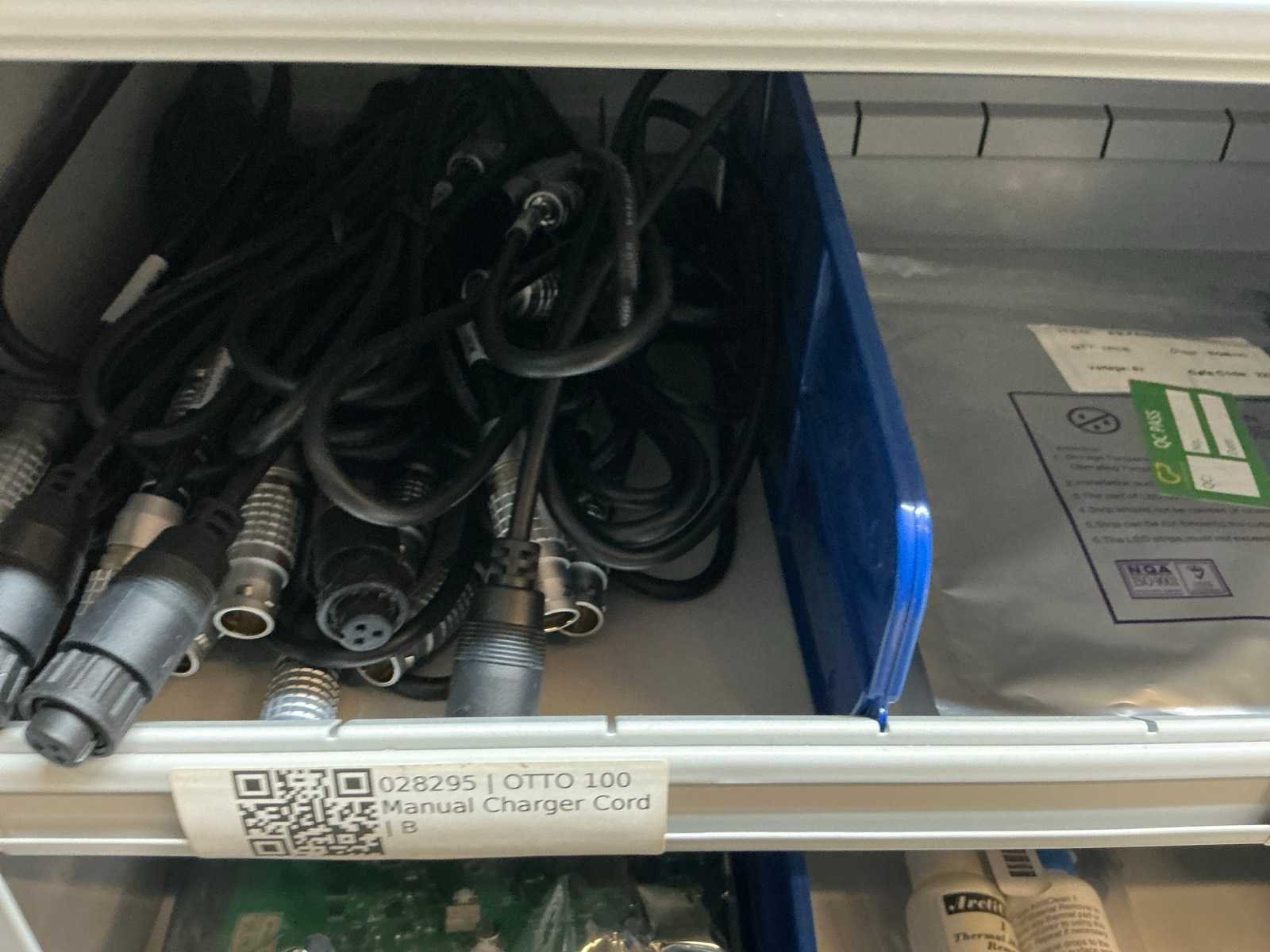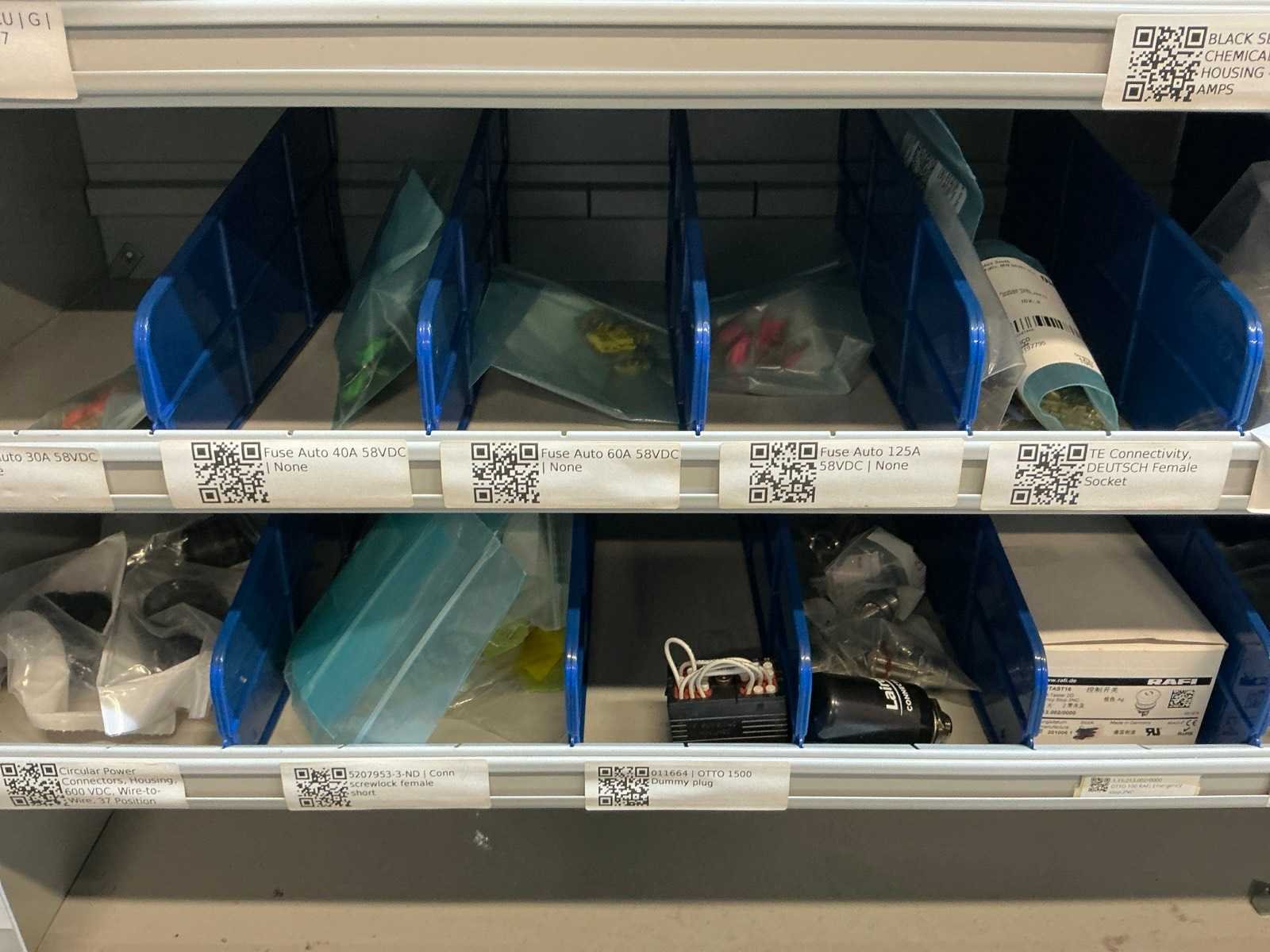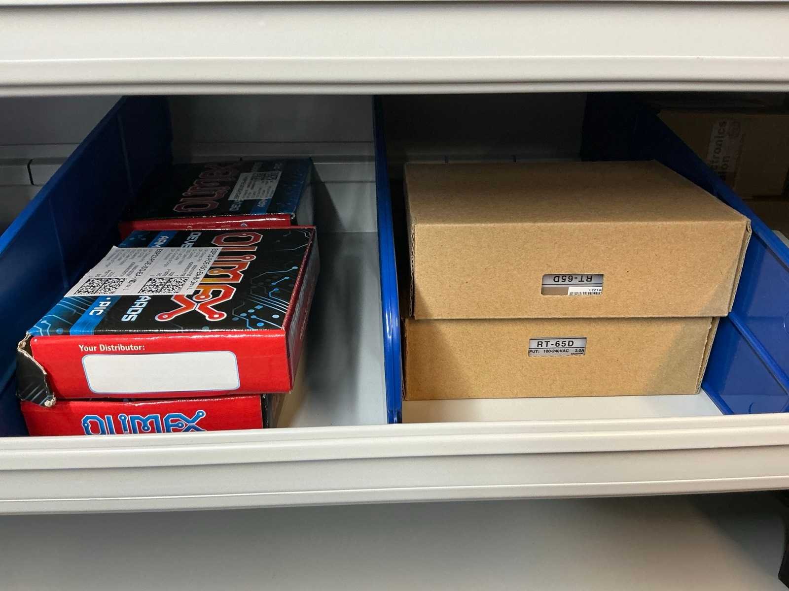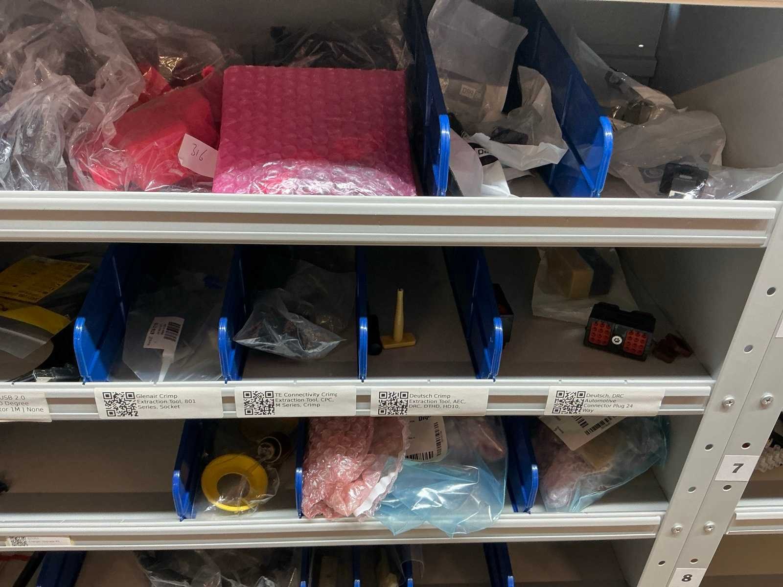 Stalen vakkenkast met elektrotechnische robotonderdelen (5x)