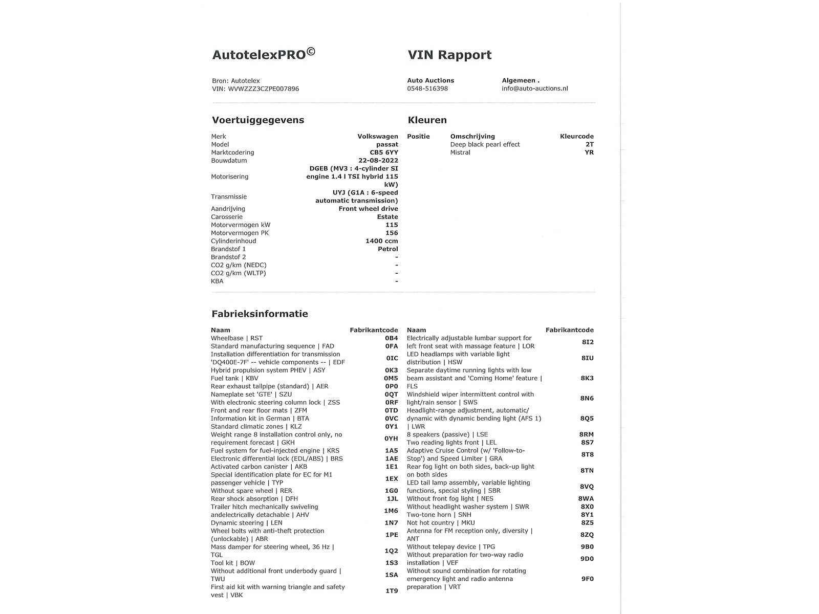 Duitse kenteken papieren. Indien gewenst kunnen wij het gehele import proces voor u verzorgen, RDW invoer, BPM taxatie, Douane afwikkeling, stalling etc. Voor deze auto zijn de totale invoerkosten inclusief de BPM €1.195.- Dus voor €1.195.- boven op uw aankoopprijs verzorgen wij het NL kenteken voor u. (This option is only for Dutch buyers) Voor vragen kunt u mailen naar info@auto-auctions.nl Nee Kenteken: Duitse Kenteken Papieren Merk: Volkswagen Model: Passat Type: Variant GTE 1.4 TSI PHEV Afgelezen kilometerstand: 165637km Cilinderinhoud: 1395cc Vermogen (kW): 160kW Brandstof: Hybride Benzine Chassisnummer: WVWZZZ3CZPE007896 Datum eerste toelating: 04-10-2022 Vermogen (pk): 218hp Aantal zitplaatsen: 5 Kleur: Deep Black Pearl Effect Transmissie: Automaat Aantal deuren: 5 Aantal sleutels: 2 Velgmaat: 17 Aantal cilinders: 4 Carrosserie: Stationwagen Nationaliteit documenten: Duitse Kenteken Papieren Onderhoudshistorie: Digitaal Volledig Aanwezig Start en rijdt: Ja oplaadkabel : Aanwezig