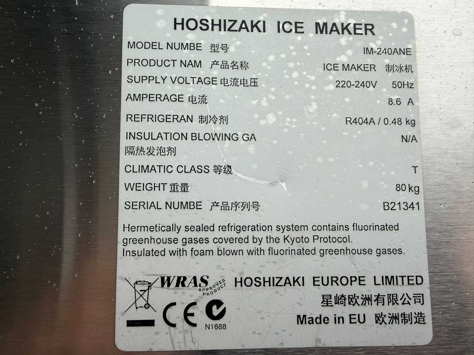 240kg per 24 uur Nee Merk: Hoshizaki Type: IM-240ANE Capaciteit.: 240kg/24 hr Rvs: true Aansluiting: 230V Ingebouwde koelcompressor: true