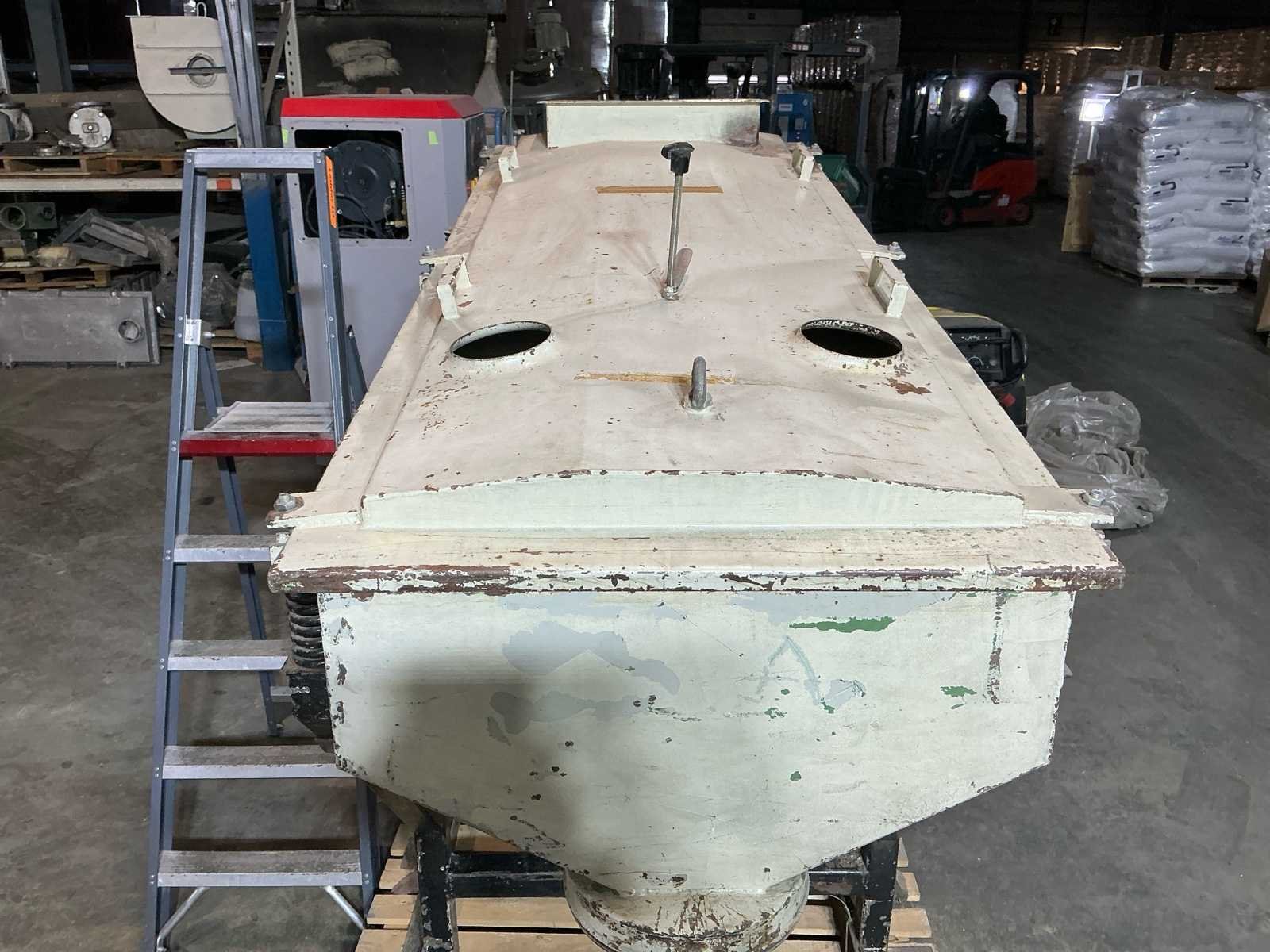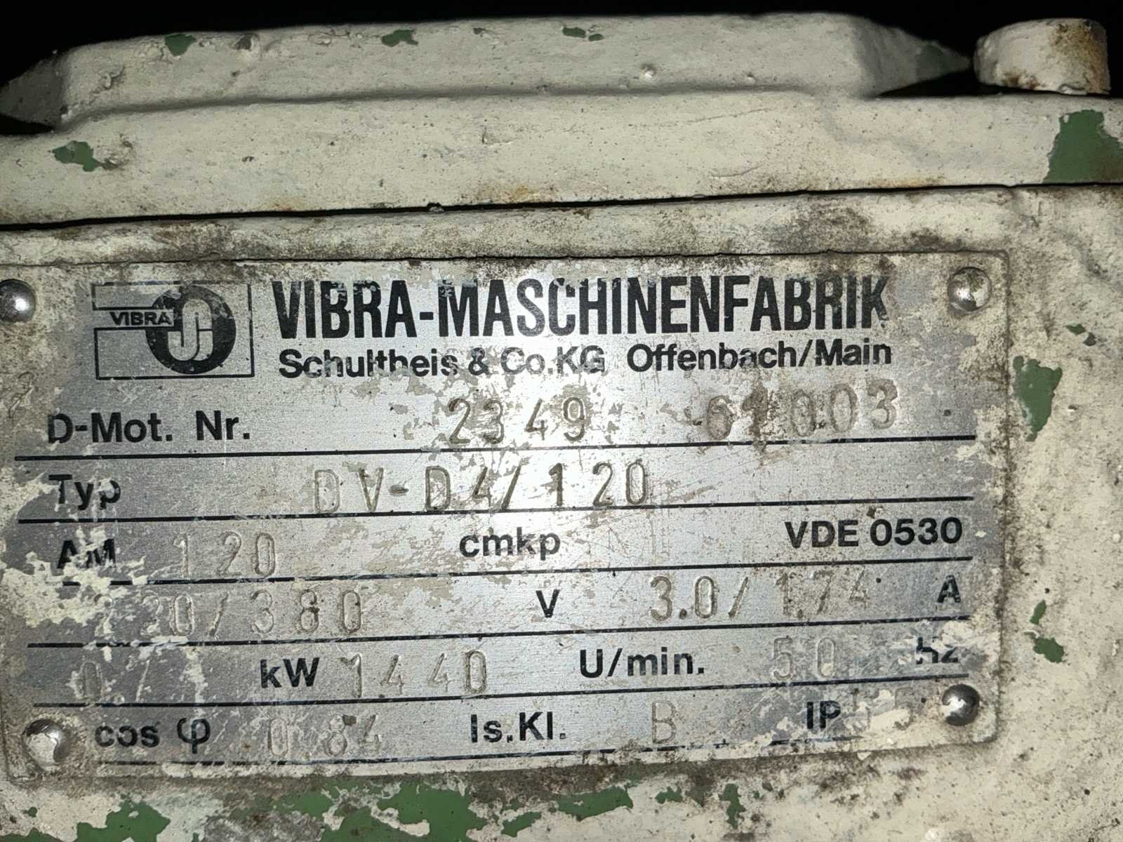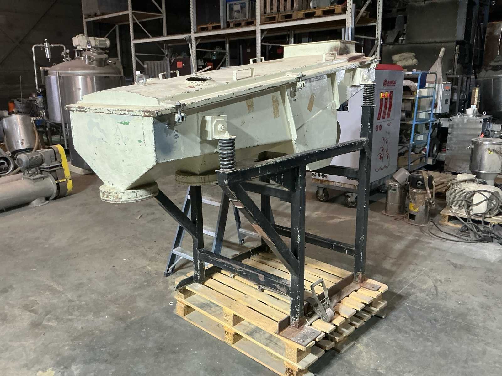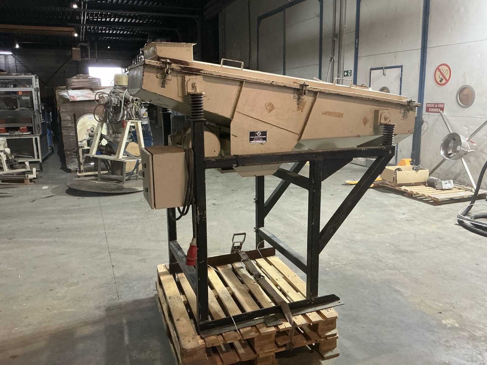 Voorzien van: boven aansluiting 450x200mm, onder aansluitingen 250mm, frame steunpoten ca. 1000x1000mm, verwisselbaar zeefraam, fijnmazig zeefdoek (metaalgaas), enkeldeks uitvoering, veeropgestelde zeefbak, mechanische trilaandrijving, 3-fase wisselstroom, spanning: 220 / 380 V, stroom: 3,0 / 1,7 A, vermogen: 0,44 kW, toerental: 1440 U/min. Nee Merk: Vibra Bouwjaar: 1982 Serienummer: 21482 Aansluiting: 380V Totale afmeting L: 2000mm Totale afmeting Breedte: 1000mm Totale afmeting Hoogte: 1700mm