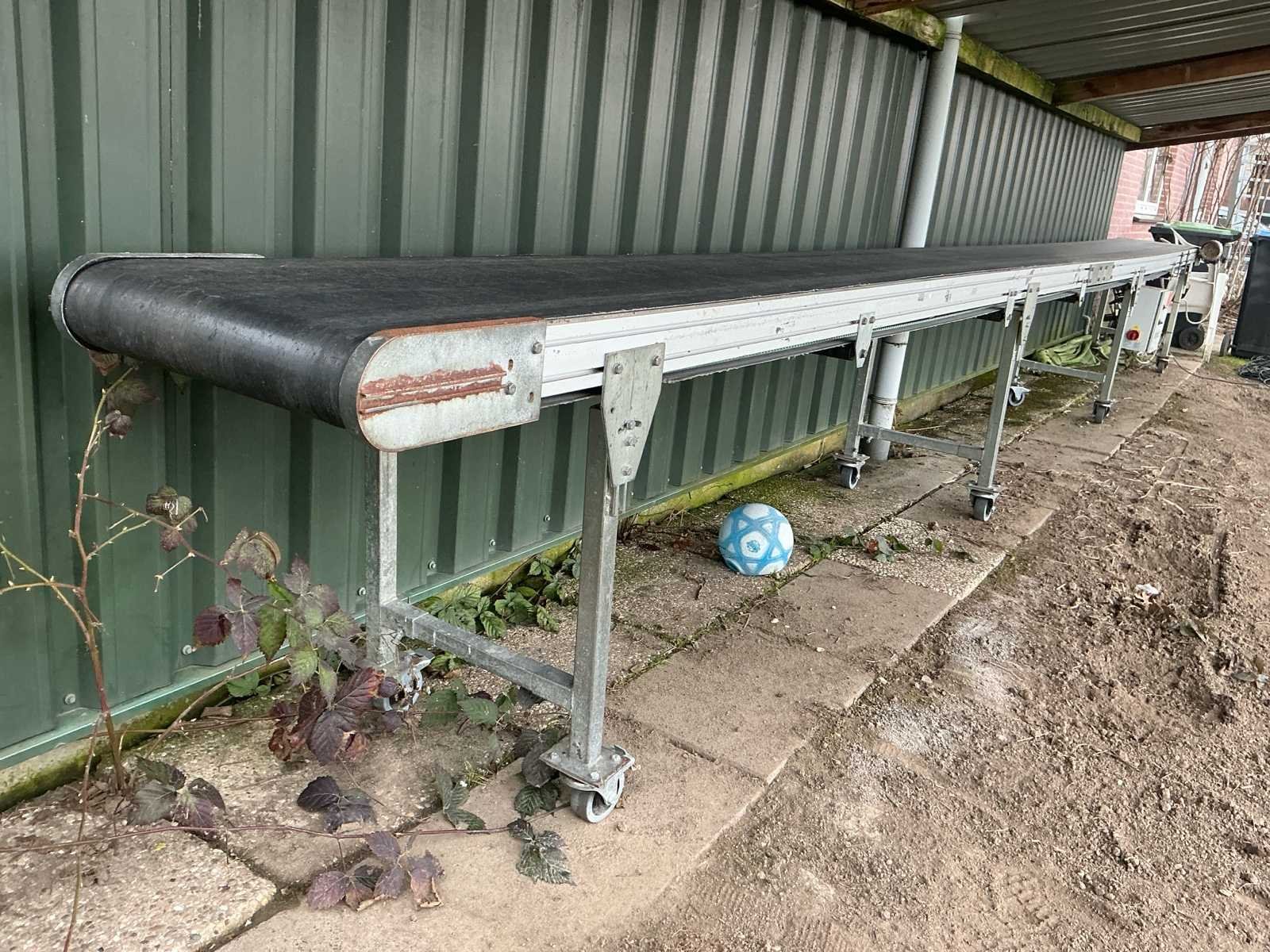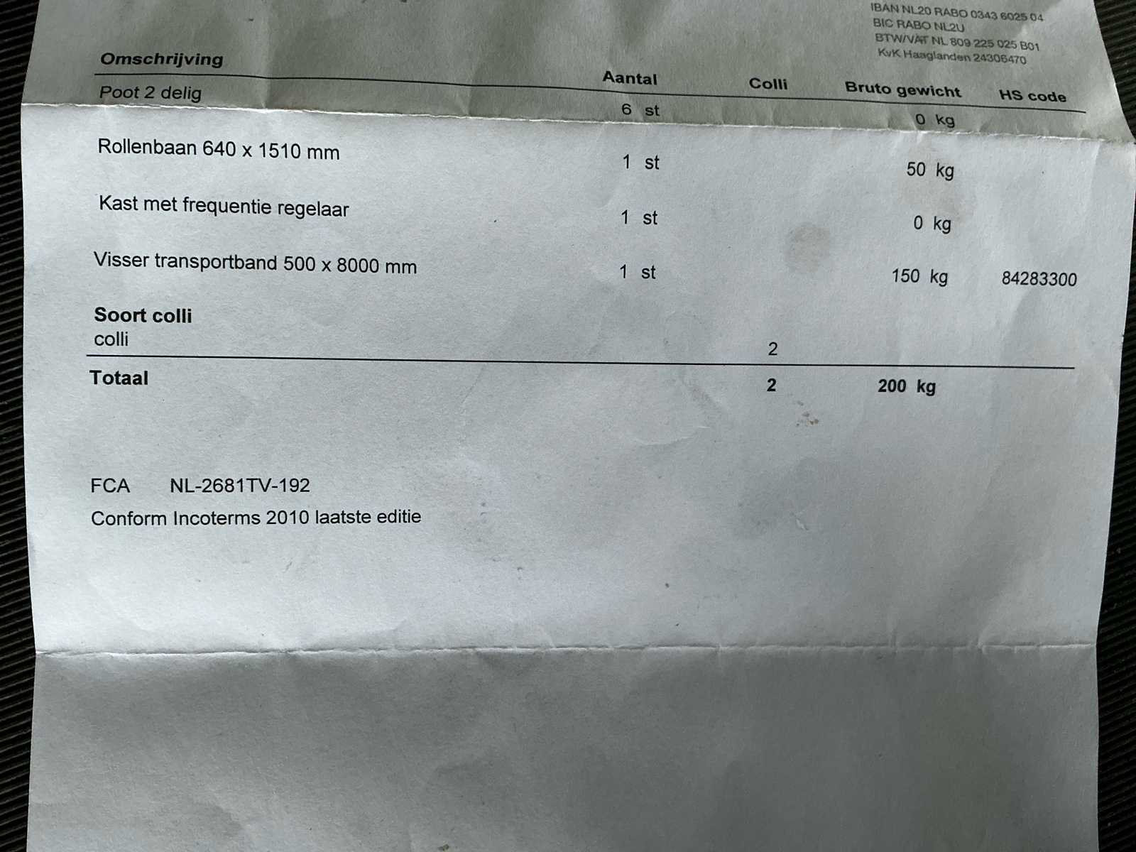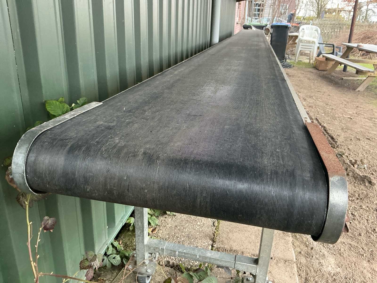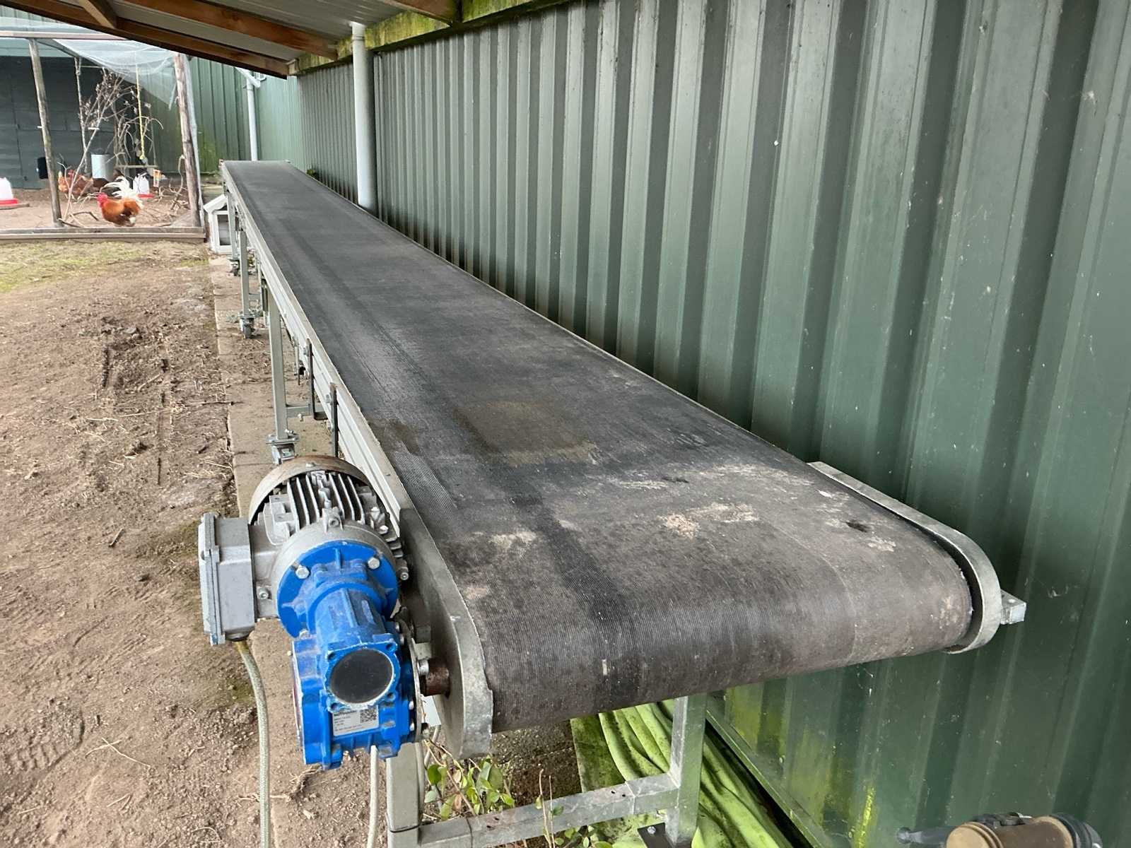 Voorzien van: snelheidsregelaar, noodstop, wieltjes, aluminium frame, handleiding, kast met frequentie regelaar Nee Merk: Hortimat Type: Transoprtband Bouwjaar: 2017 Serienummer: 20003631 Band afm. b: 500mm Band afm. l: 80000mm Elektrisch aangedreven: true Aansluiting: 230V Eigen gewicht: 200kg Totale afmeting L: 80000mm Totale afmeting Breedte: 740mm Totale afmeting Hoogte: 880mm