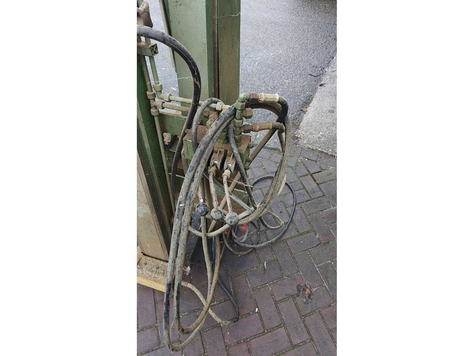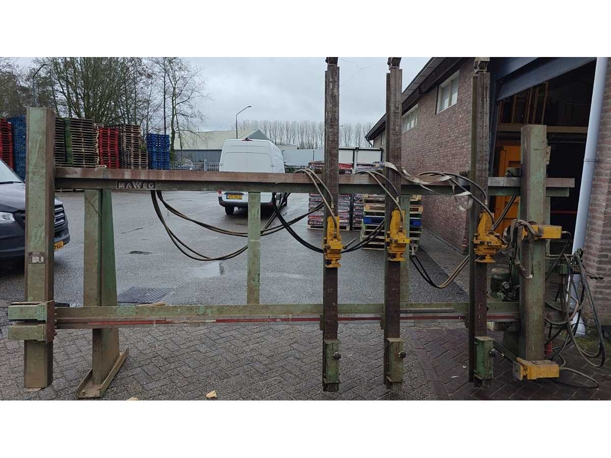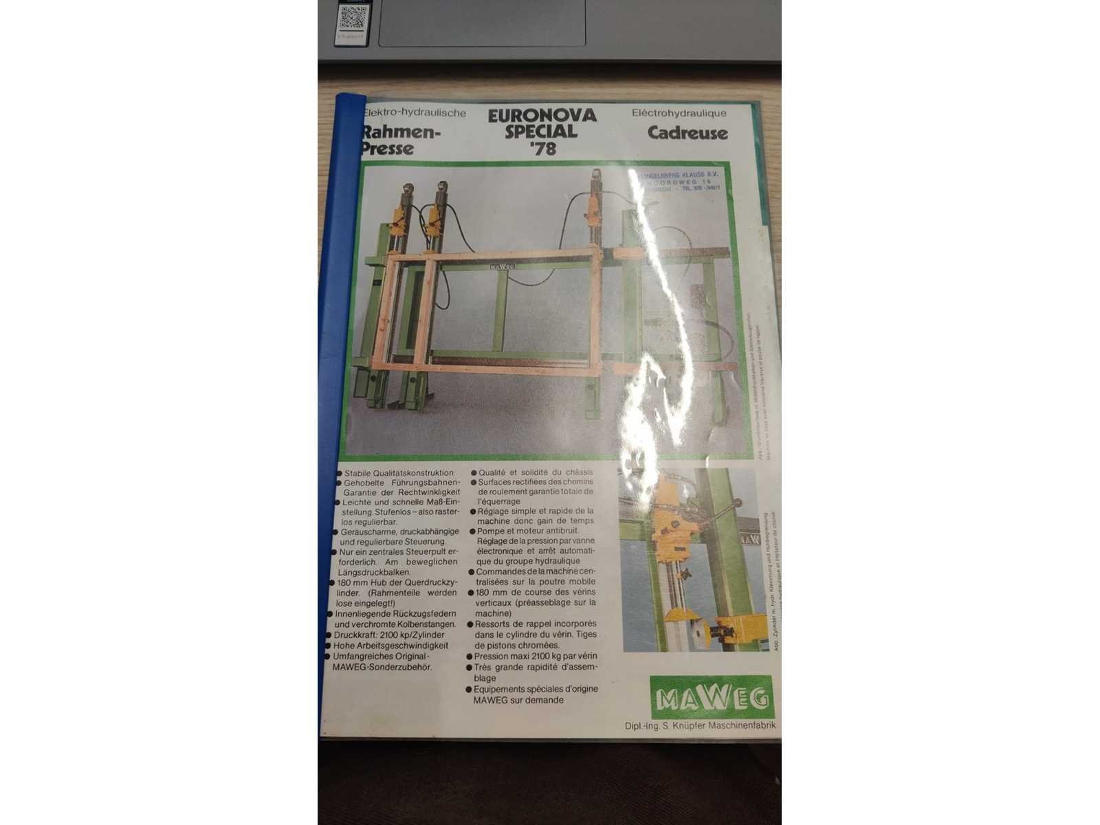 Deze elektro-hydraulische ramen-/kaderpers is vandaag de dag nog prima inzetbaar voor: Verlijmen en persen van houten frames ramen en deuren kozijnen meubelframes paneel- en lijstwerk Haaks opspannen tijdens lijmen (zeer geschikt voor nauwkeurig werk) Werkplaatsen & restauratie meubelmakerij timmerwerkplaats restauratie van ramen/deuren kleine serieproductie Door de hydraulische perskracht en robuuste bouw is hij vooral interessant voor vakmensen die betrouwbaarheid belangrijker vinden dan moderne elektronica. Beknopte specificaties (voor advertentie) Merk / type: MAWEG Euronova Special ’78 Soort: elektro-hydraulische ramenpers / kaderpers Toepassing: houten ramen, deuren, kozijnen, frames Perssysteem: hydraulisch, elektrisch aangedreven Perskracht: ca. 2100 kg per cilinder Slaglengte cilinders: ca. 180 mm Instelbaar: traploos verstelbare perspunten Constructie: zware, stabiele staalconstructie Nauwkeurigheid: ontworpen voor haaks en maatvast persen Herkomst: Duitsland Bouwjaar: ca. 1978 Nee Bouwjaar: 1978