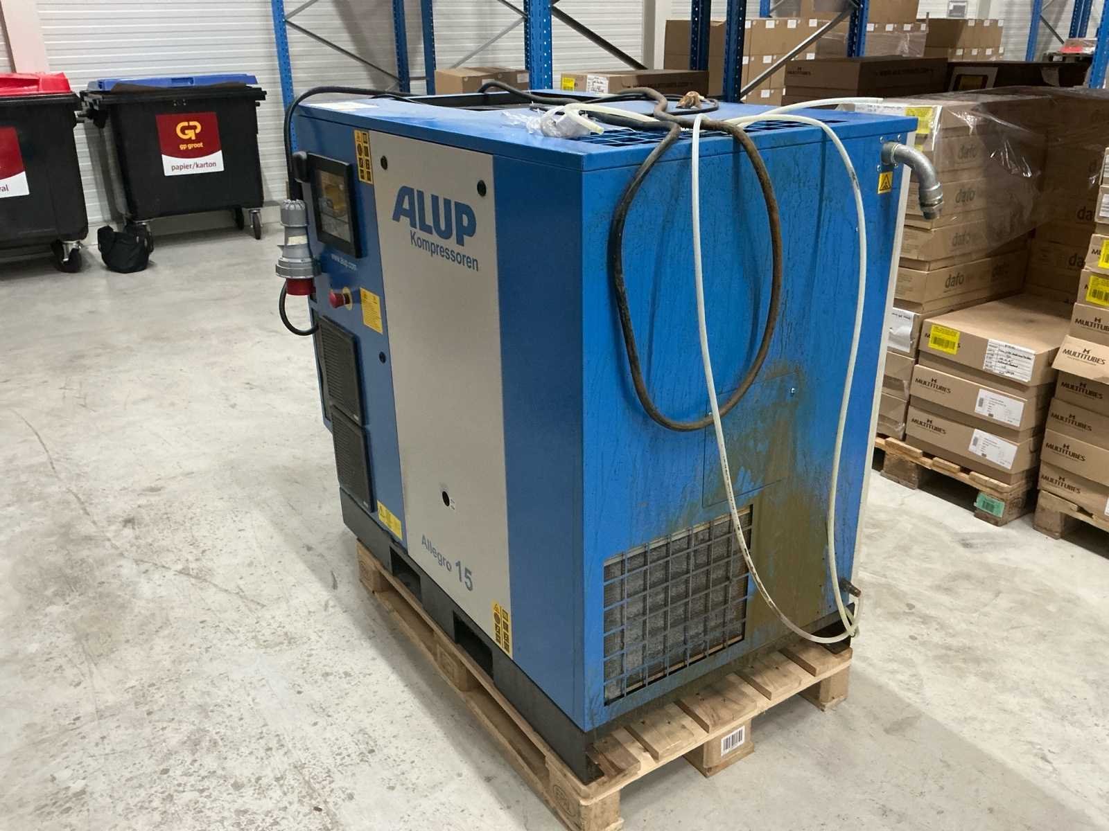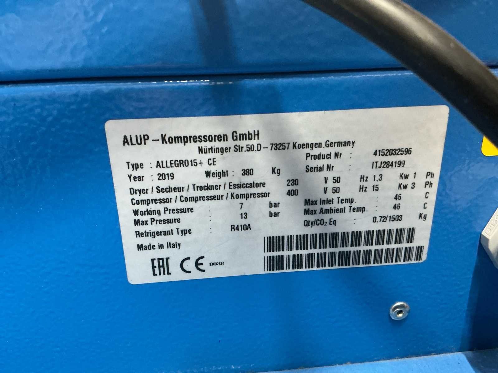 Voorzien van luchtdroger; circa 1300 Draaiuren Nee Merk: Alup Type: Allegro 15+ CE Bouwjaar: 2019 Serienummer: ITJ284199 Capaciteit.: 13bar Luchtdroger: true Aansluiting: 400V Eigen gewicht: 380kg Totale afmeting L: 1630mm Totale afmeting Breedte: 82mm Totale afmeting Hoogte: 1250mm
