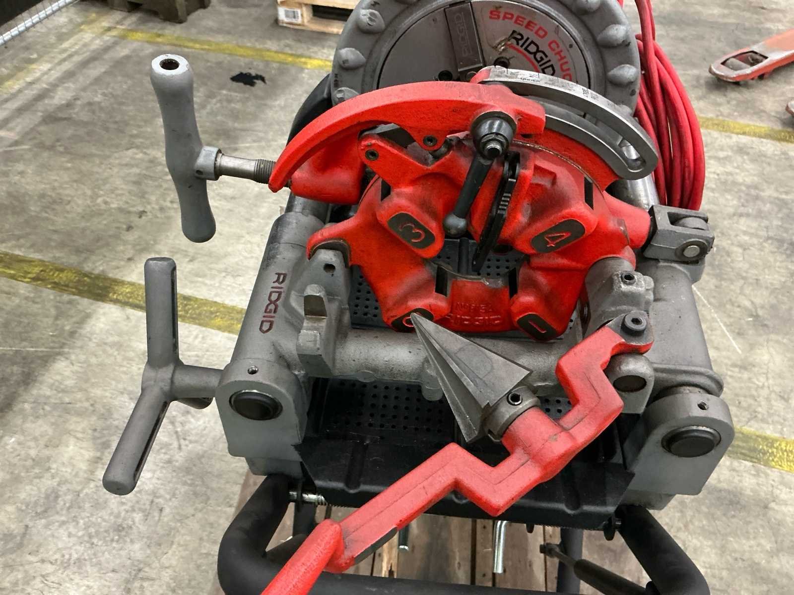 Type: Elektrische pijpdraadsnijmachine Toepassing: Draadsnijden van stalen buizen (water, gas, installatiewerk) Montage: Verrijdbaar onderstel met wielen Voeding: 230V (1-fase) Vermogen: ± 750 – 1100 Watt Toerental: ± 36 omw/min Capaciteit Buiscapaciteit staal: 1/8” tot 2” (ca. 6 – 50 mm) Buiscapaciteit RVS (afhankelijk van type): Tot 2” Inclusief functies: Automatische draadsnijkop Buissnijder Ontbramer Oliepomp met snijoliecirculatie Constructie Gietijzeren machinehuis Zelfcentrerende klauwplaat Noodstopbeveiliging Olieopvangbak Robuust stalen onderstel met 2 transportwielen Afmetingen & Gewicht (indicatief) Lengte: ± 85 cm Breedte: ± 55 cm Hoogte: ± 110 cm (op onderstel) Gewicht: ± 70 – 95 kg (machine + onderstel) Toepassingen Installatietechniek CV-installaties Gas- en waterleidingen Industriële montage Nee Merk: Ridgid Type: 300 compact Aansluiting: 230V Serienummer: EAF312561020 Elektrisch: true Vermogen: 1700W