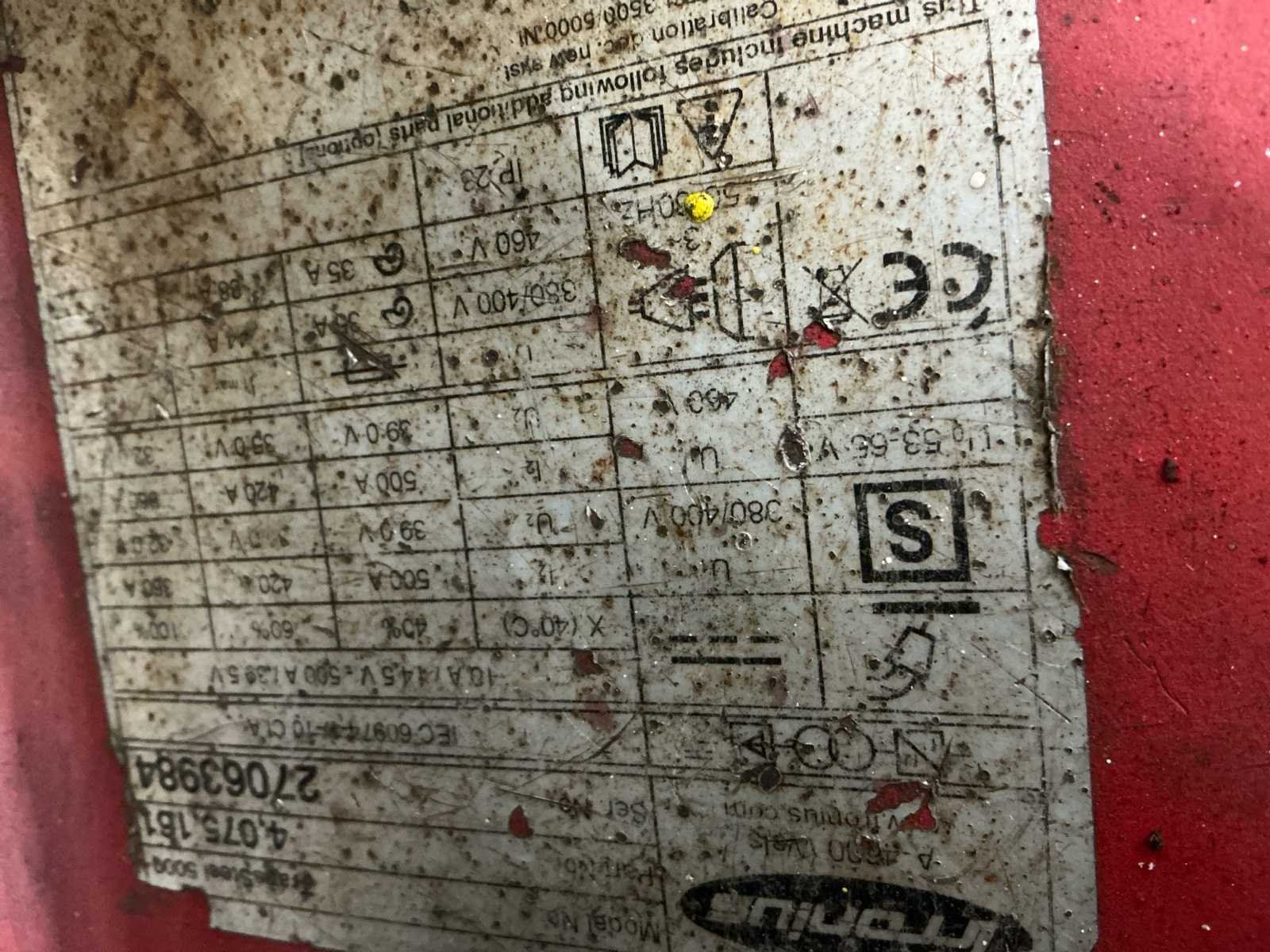 Voorzien van: Tussenpakket 20ste mig watergekoeld, Aansluitspanning: 380/400/460 Volt, 50/60 Hz, 3fase Netspanningstolerantie: +/- 10% Netafzekering: 35 Amp. traag Regelgebied: 10 500 Amp. : 14,5 39,5 Volt Sec. vermogen: 500 Amp. 40% i.d., 10 min., 400C Open spanning: 65 Volt Beschermingsklasse: IP 23 Afmetingen LxBxH: 747 x 300 x 497 mm Gewicht (stroombron): 32,5 kg De machine wordt lasklaar geleverd meteen standaardpakket toebehoren: - primaire aansluitkabel à 5 meter 4x6 mm2, inclusief primaire steker 32Amp.,5p CEE - draadaanvoerunit VR 5000 Yard 4R/W/FSC Synergic, incl. gas test/draadinvoeren - draadrol FSR U 1.2 (rood), 4 st. benodigd, prijs per stuk - montagearm VR 5000 Yard - 4-wielig onderstel Pick up 5000 TST - waterkoelunit model FK 5000 - ombouwset waterdoorstroombeveiliging + thermosensor - ombouwset koelwaterfilter FK 5000 - ombouwset stopkontakt afstandsbediening VR 5000 - frontafscherming VR 5000 - tussenpakket W/10m/70 mm² voor VR 4000/5000/7000 - reduceerventiel inclusief flowmeter - Fronius lastoorts model MTW 400i /FSC/UD/4.5m/45/Led - onderdelenset MTW 400i,1,2 Nee Merk: Fronius TransSteel 5000 Type: MAG Bouwjaar: 2016 Serienummer: 27063984 Afmeting l: 1100mm Afmeting b: 620mm Afmeting h: 1400mm