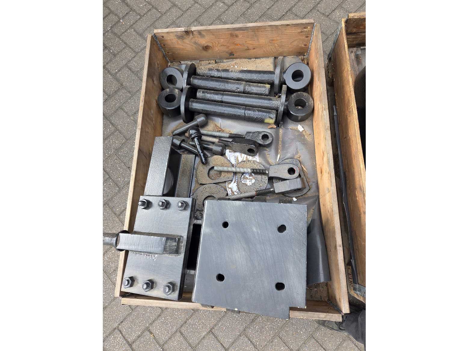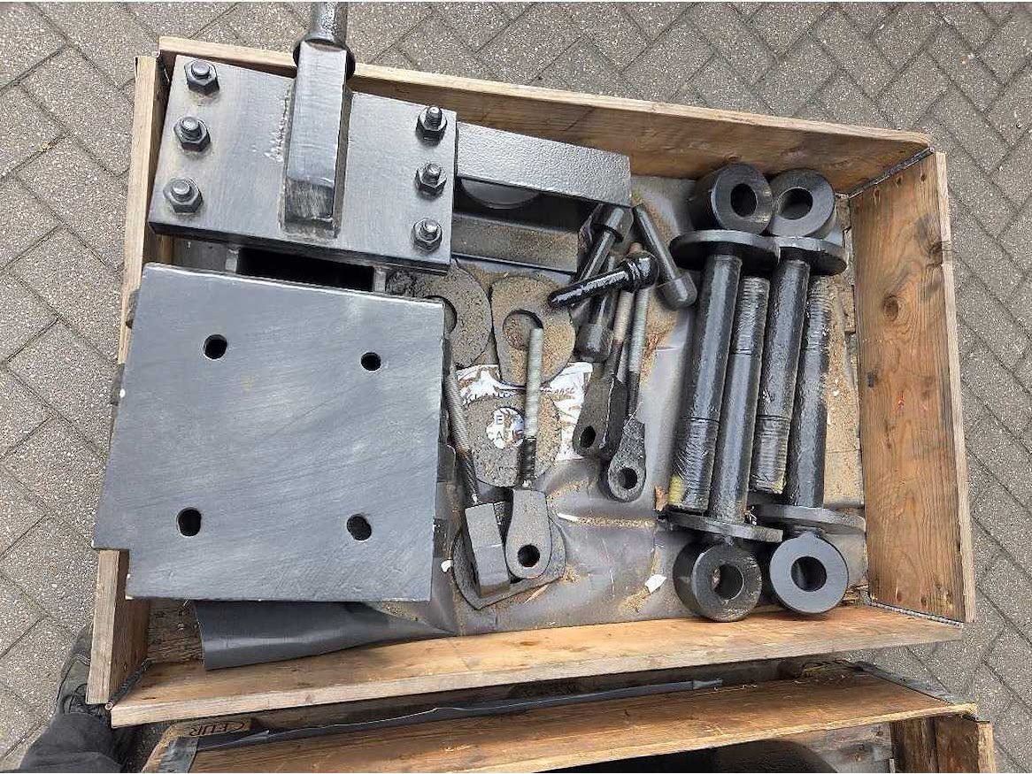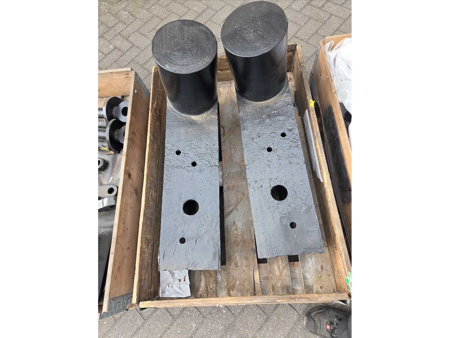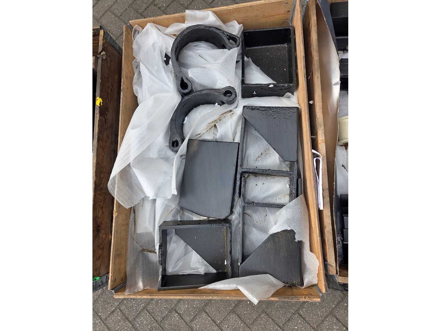 4 pallets gerestaureerde sluisdeuronderdelen; Taatsschoenen, halsbeugels, halsringen, enz. Door annulering 1 jaar opgeslagen; Conservering; Gestraald, geschoopeerd en 3-laags genatlakt Ral 9005; Totale laagdikte: 250mu Nee