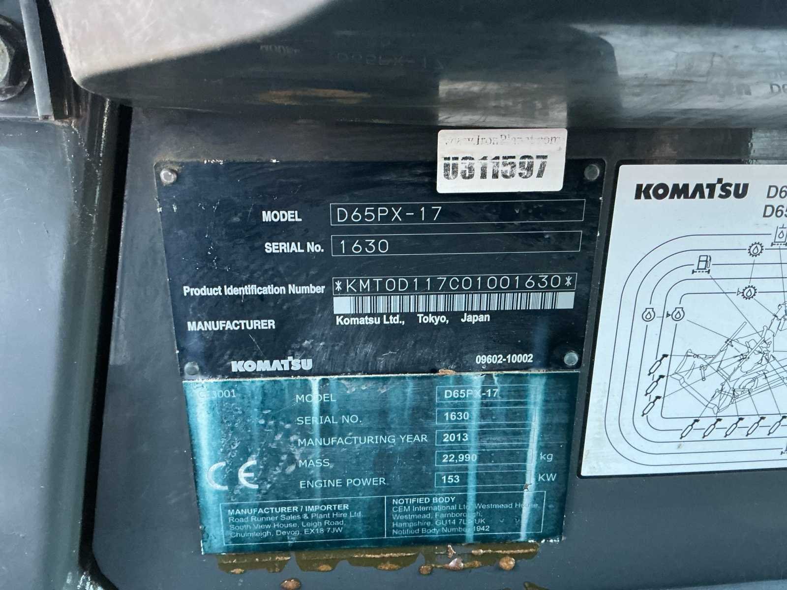 Voorzien van: blad 4ca13-w, 4000mm, rupsen 800mm, werklampen, rops cabine, airconditioning, recht kantelblad 4000mm, koppelomvormer met lock-up, EU stage IIIB, selecteerbare werkmodi, geïntegreerd achteruitrijcamerasysteem, hydrostatisch stuursysteem, groot TFT-kleurenmultimonitor, laag aangedreven “PLUS”-onderstel, zelfstellende spanrol, Komatsu SAA6D114E-5 6 cilinder motor, volledig automatisch klimaatregelsysteem brengt druk in de cabine om stof buiten te houden, Een comfortabele, volledig verstelbare stoel, shift preset mode, Palm Command Control System (PCCS), omkeerbare radiatorventilator, CLSS, Komatsu 4CA13-w dozerblad, bladbreedte 3,97 m, bladhoogte is ongeveer 1,1 m, capaciteit 3,69 m³, spoor 2.230mm, h.o.h.sprocet. Nee Merk: Komatsu Bouwjaar: 2013 Serienummer: KMTOD117C01001630 Type: D65PX-17 Merk motor: Komatsu Aantal cilinders: 6 Totale afmeting L: 5700mm Motorvermogen (kW): 153kW Bedrijfsgewicht: 22600kg Totale afmeting Breedte: 3000mm Totale afmeting Hoogte: 3160mm Eigen gewicht: 22999kg Cabine: true Afgelezen urenstand: 11450hr Brandstof: Diesel