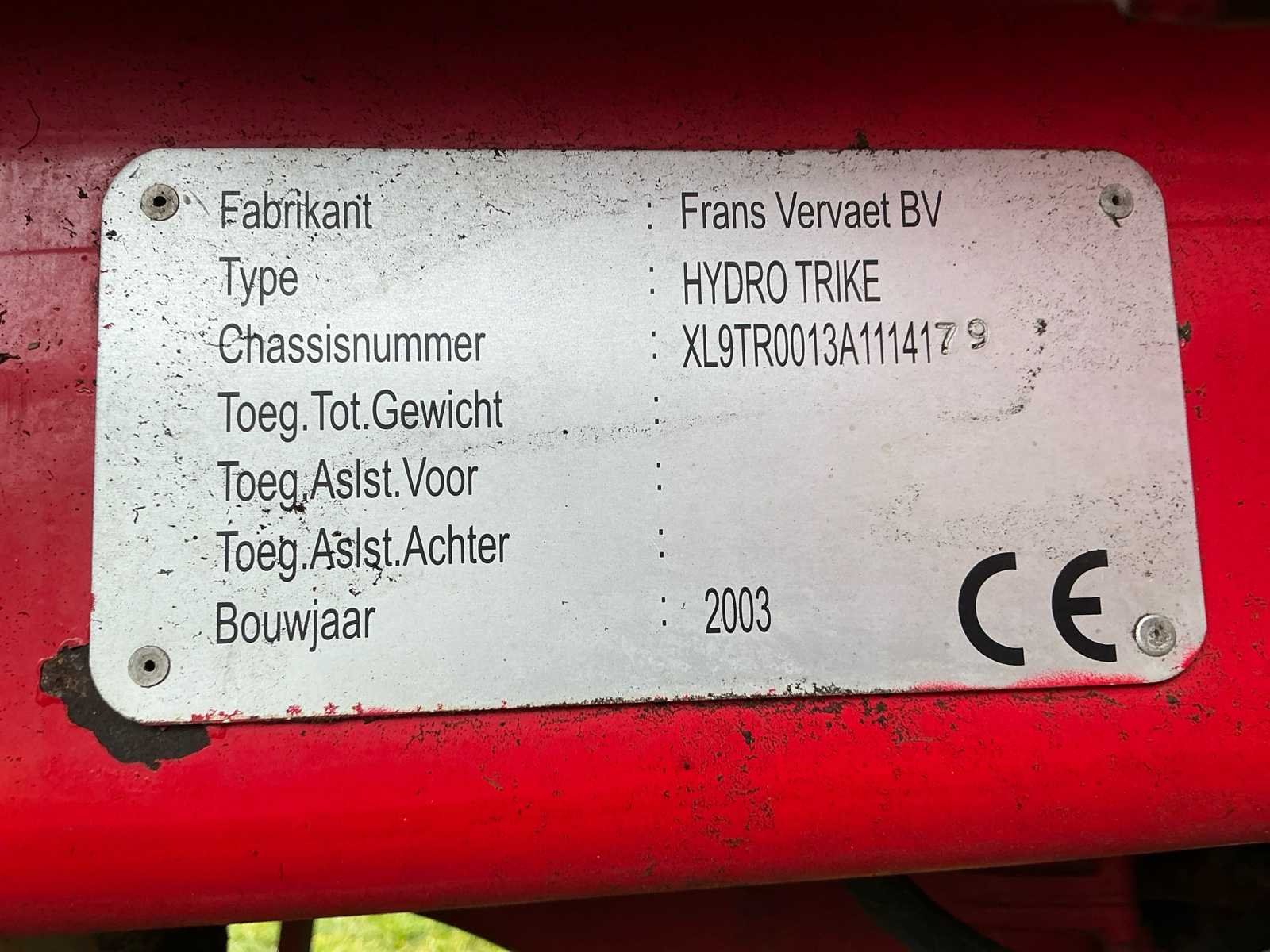 Voorzien van: luchtdrukwisselsysteem, camerasysteem, LED werkverlichting, hydraulische zuigarm, cabine vering, voorbereiding schuimmarkering, snijkast, DAF 6-cilinder motor, hydraulische rijaandrijving met traploze regeling, doseercomputer Urenstand; 13203 Nee Merk: Vervaet Type: Hydro Trike Bouwjaar: 2003 Serienummer: XL9TR0013A1114179 Motorcapaciteit: 280 Aantal wielen: 3 Bandenmaat voor: 1000/50R25 Bandenmaat achter: 1050/50R32 Tankinhoud: 14m³ Pompcapaciteit: 9000l/min Luchtdrukwisselsysteem: true Zuigarm: true Doseercomputer: true Totale afmeting L: 10050mm Totale afmeting Breedte: 3000mm Totale afmeting Hoogte: 3900mm