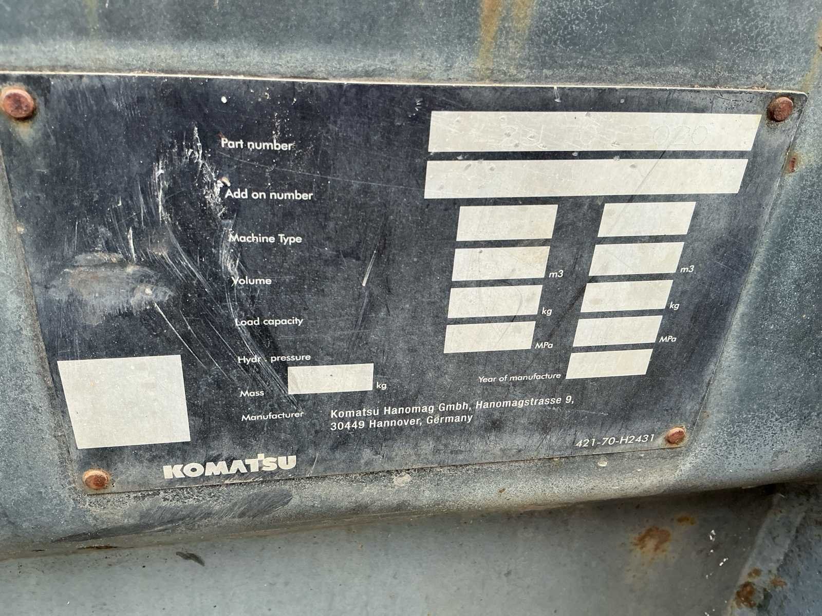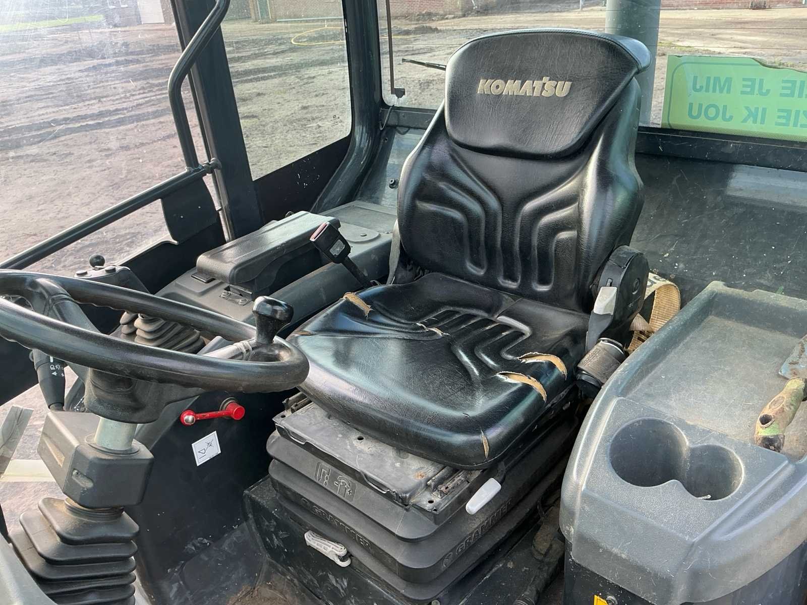 Voorzien van: hydraulisch snelwissel, tandenbak 1800mm, vorkenbord met pallet vorken 1200mm, verlichting, werklampen, trekhaak, zwaailicht, gewicht: 5.38t, bak capaciteit: 0,75 - 1,25 m³, transportatie lengte: 5.45 m, transport breedte: 1.8 m, transport hoogte: 2.47 m, snelheid: 20 km/h, motorfabrikant: Komatsu, motortype: 4D95LWE-5, motorvermogen: 37 kW, aantal cilinders: 4, achteruitrijlicht, achteruitrijalarm en verwarmde achterruit, easy Fork (EF) cinematic voor parallelle beweging tijdens het gebruik van de vorken, LSD-assen, 40°-hoek knikstuursysteem verkleint de draaicirkel tot 3,68m, geringe hoogte - minder dan 2,5 m, open hydraulisch systeem, werkdruk 230 bar, circulatiecapaciteit van de hydraulische pomp 53 l/min, hydrostatische transmissie, in alle richtingen schakelbaar bij vol vermogen, hydrostatische pomp 1 variabele zuigerpomp, hydrostatische motor 1 variabele zuigermotor, snelheidsbereiken (vooruit/achteruit) 2/2, rijsnelheden (vooruit/achteruit) 1. snelheidsbereik 0 - 5 km/u, 2. snelheidsbereik 0 - 20 km/u. Nee Merk: Komatsu Type: WA70-7 Bouwjaar: 2015 Serienummer: H62322 Merk motor: Komatsu Bandenmaat: 405/70R18 Cabine: true Afgelezen urenstand: 5054 Eigen gewicht: 5380kg Totale afmeting L: 5500mm Totale afmeting Breedte: 1800mm Totale afmeting Hoogte: 2460mm