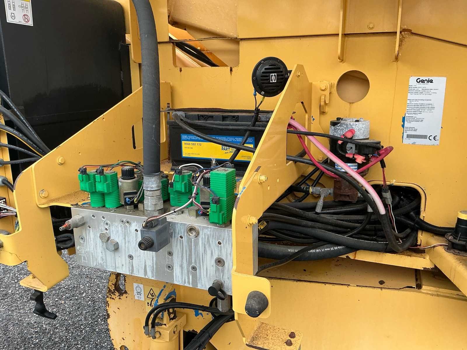 Voorzien van: werkhoogte 21,80 m, horizontaal bereik 17,10 m, capaciteit tot 227 kg, zelfnivellerend platform, hydraulische platformrotatie, volledig proportionele Hall-effect joystickbediening, kantelalarm, urenteller, claxon, continue 360°, wielmotoren met twee snelheden. No Merk: Genie Type: S-65 Bouwjaar: 2007 Serienummer: S6007-16276 Diesel: true Motorvermogen (kW): 35kW Telescoop hoogwerker: true Werkhoogte: 20300mm Horizontale rijkwijdte: 17100mm Platform capaciteit: 227kg Afgelezen urenstand: 6910 Eigen gewicht: 10100kg Totale afmeting L: 9500mm Totale afmeting Breedte: 2500mm Totale afmeting Hoogte: 2700mm