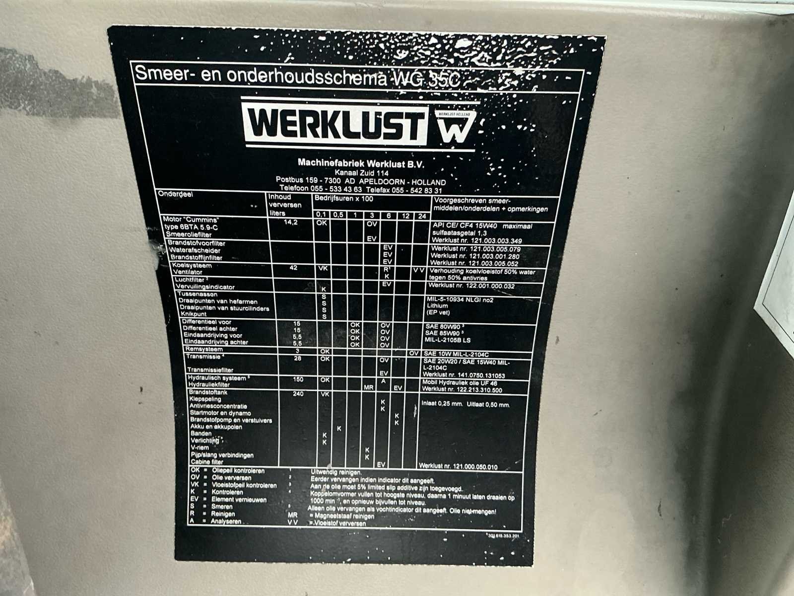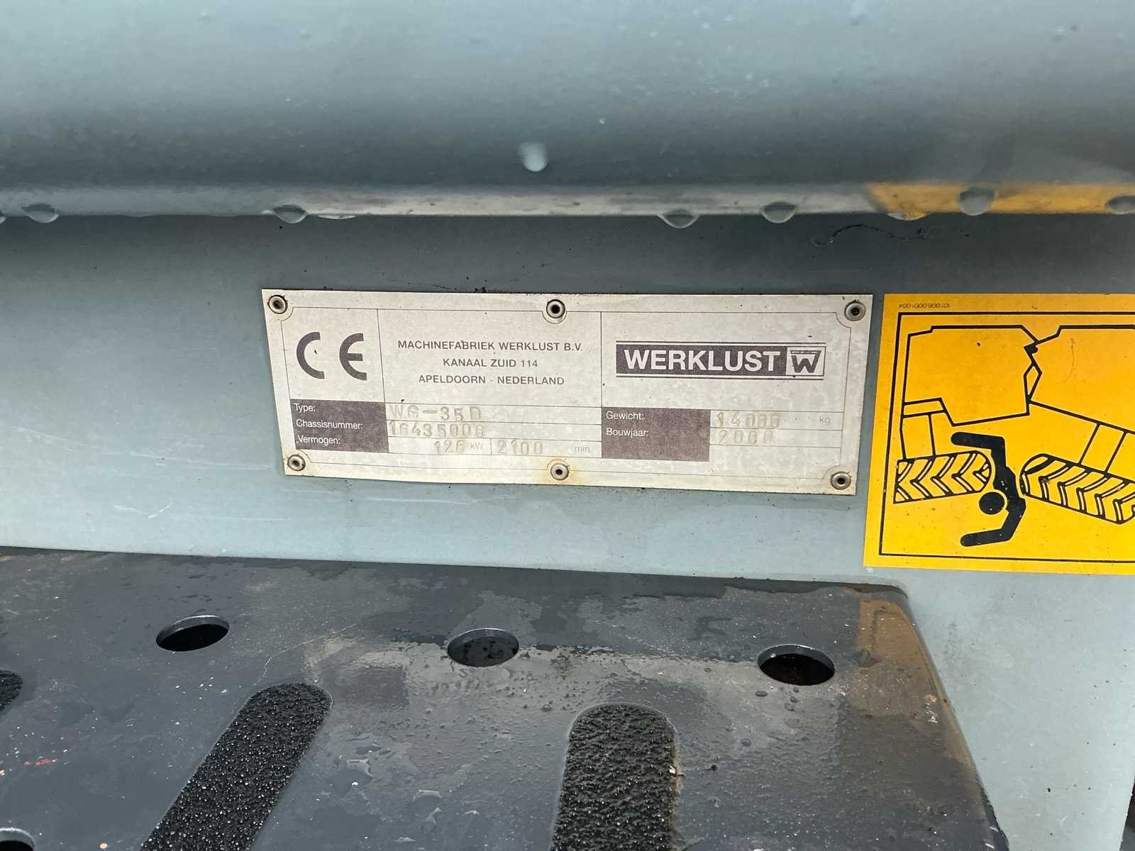 Voorzien van; Cummins Motor; 6-Cilinder; Zonder graafbak; Diesel; Recent vervangen banden!; (LET OP! dit voertuig heeft een kenteken registratie, bij afhalen dient u dit ter plaatste bij een derde partij te naam te stellen of te exporteren, hier zijn extra kosten aan verbonden) Nee Merk: Werklust Type: WG 35 D Bouwjaar: 2000 Serienummer: 16435006 Merk motor: Cummins Kenteken: TXP-46-S Motorvermogen (kW): 126kW Aantal cilinders: 6 Brandstof: Diesel Bedrijfsgewicht: 11000kg Bandenmaat: 20.5R25 Cabine: true Afgelezen urenstand: 19398 Eigen gewicht: 14000kg