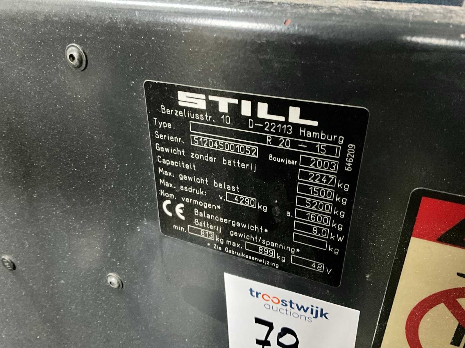 FEM2 Vorkenbord, 48V accupakket, inclusief acculader Nee Merk: Still Type: R20-15I Bouwjaar: 2003 Serienummer: 512045001052 Brandstof: Elektrisch Mast: Triple Soort band: Volrubber banden Aantal wielen: 3 Afgelezen urenstand: 7813 Accu lader: true Free-lift: true Triple mast: true Eigen gewicht: 3250kg Hefvermogen: 1500kg Lepellengte: 1150mm Totale afmeting L: 3100mm Totale afmeting Breedte: 1050mm Totale afmeting Hoogte: 2550mm