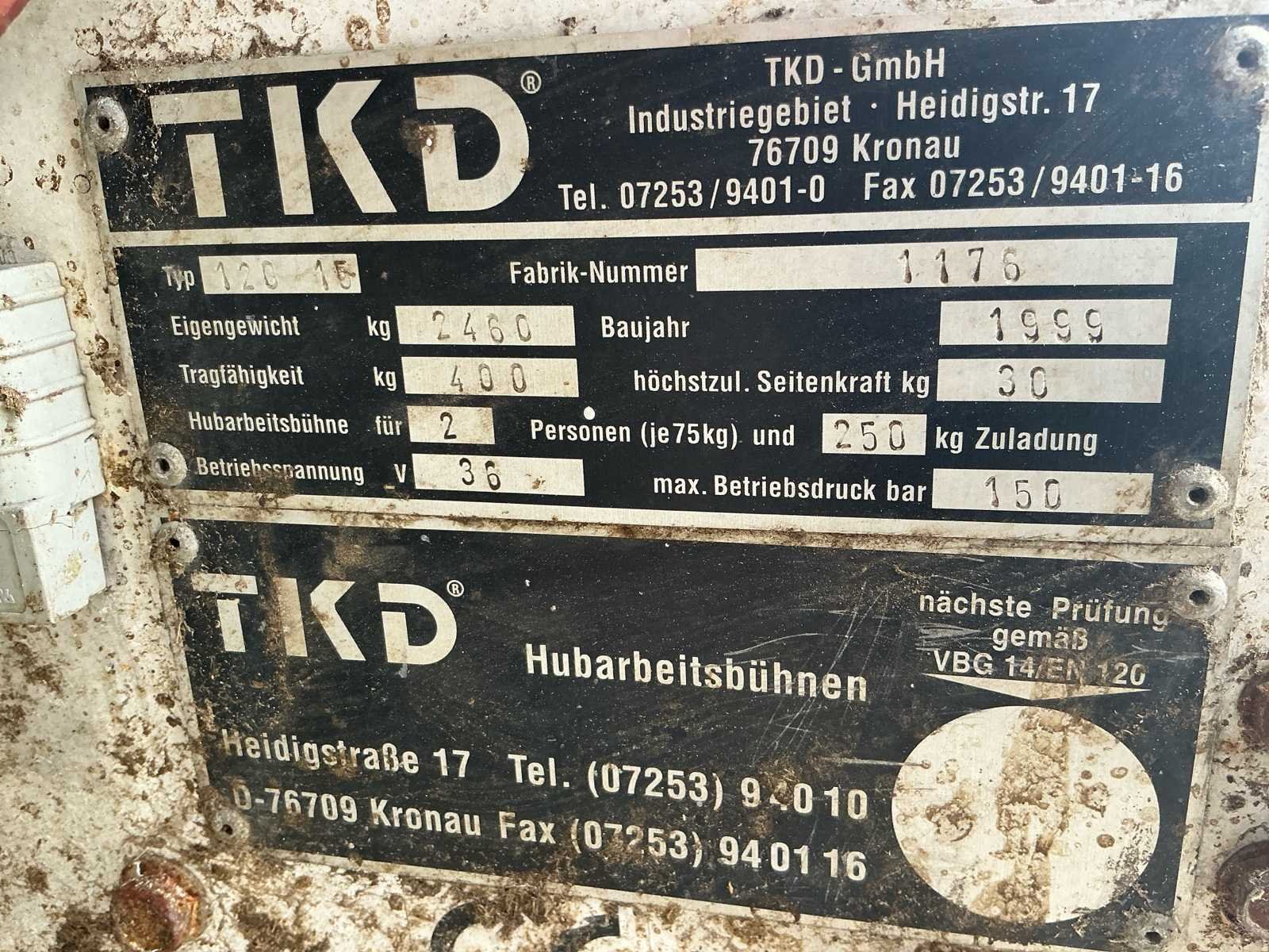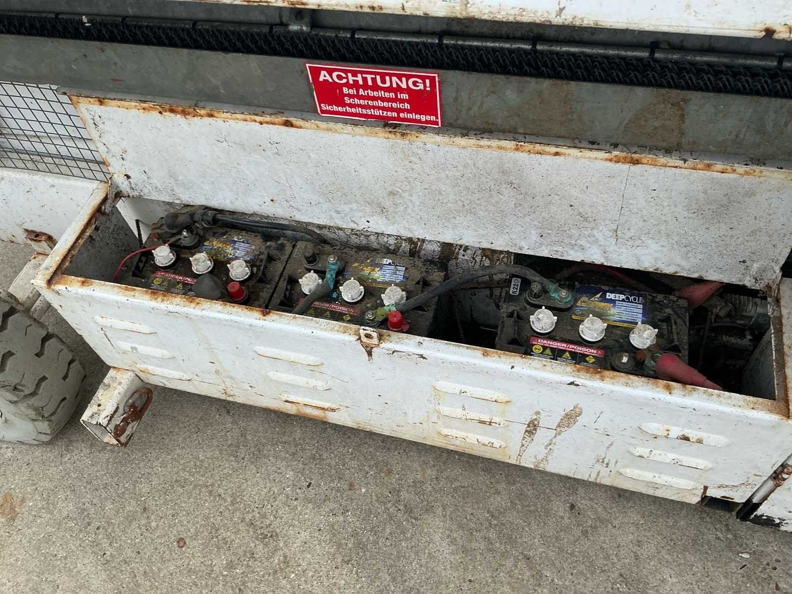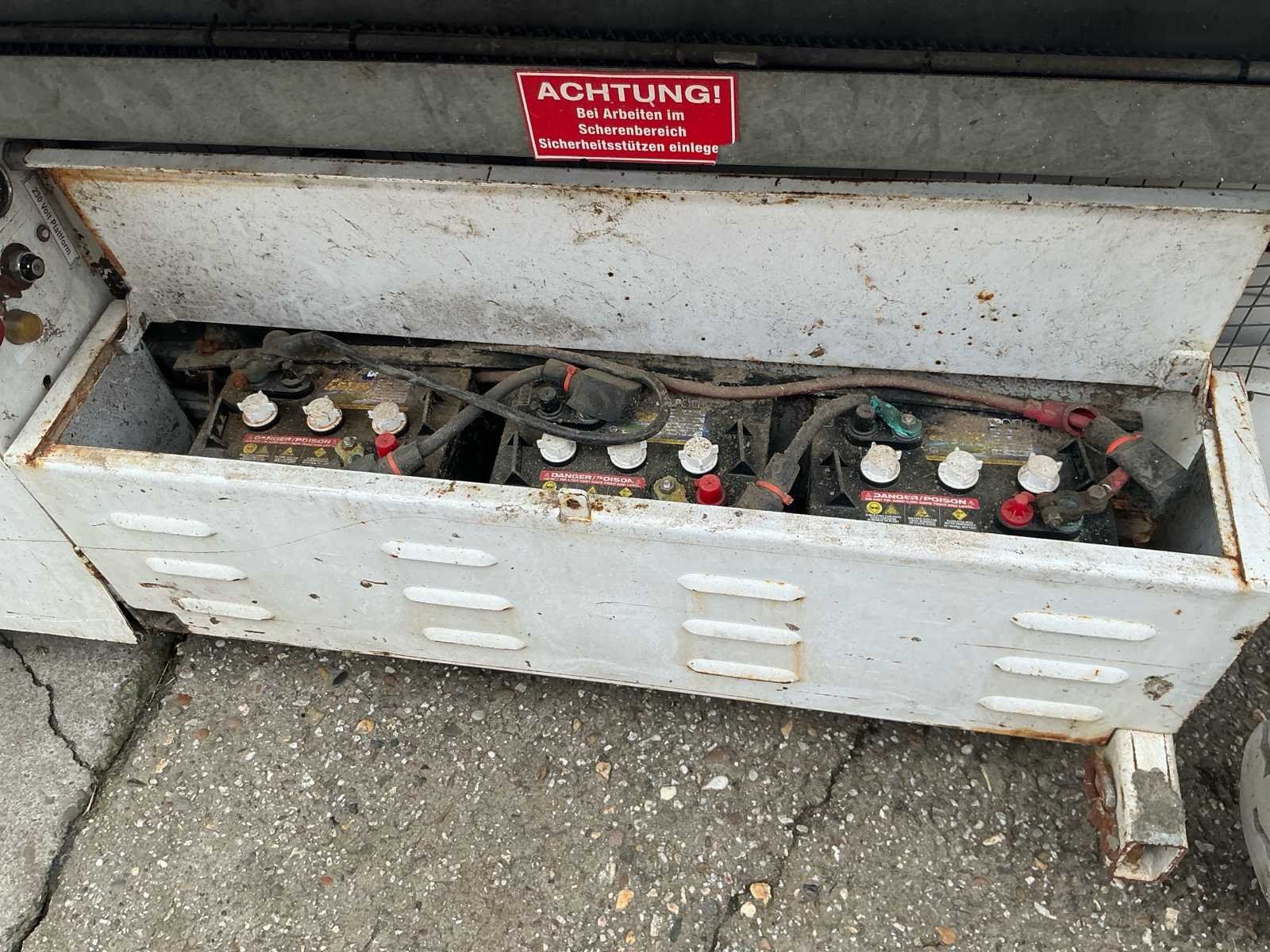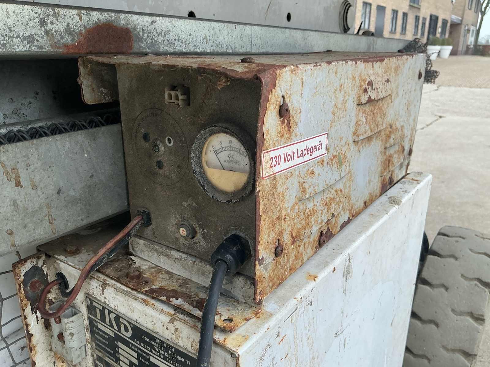 Voorzien van interne lader. Nee Merk: TKD Type: 120 15 Bouwjaar: 1999 Serienummer: 1176 Elektrisch: true Schaarhoogwerker: true Werkhoogte: 12000mm Plateau afm. l: 3500mm Plateau afm. b: 1350mm Platform capaciteit: 250kg Accu lader: true Afgelezen urenstand: 1290 Eigen gewicht: 2460kg Totale afmeting L: 3850mm Totale afmeting Breedte: 1500mm Totale afmeting Hoogte: 2280mm