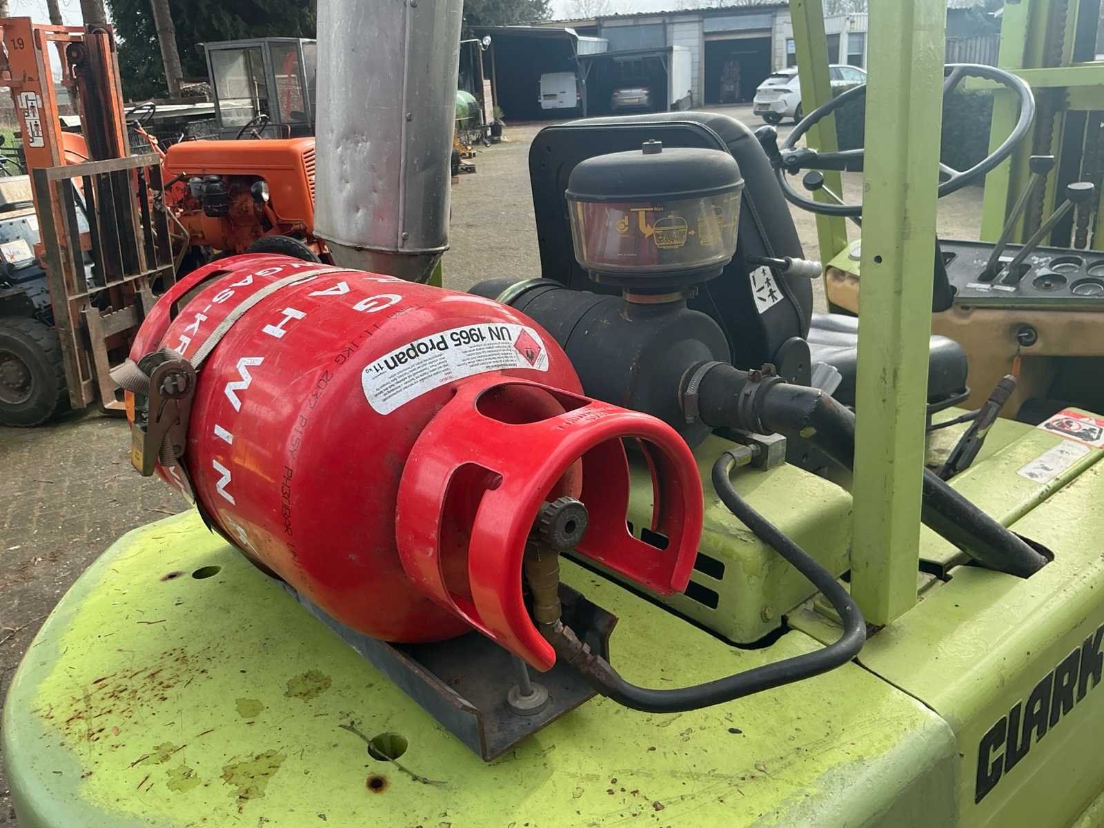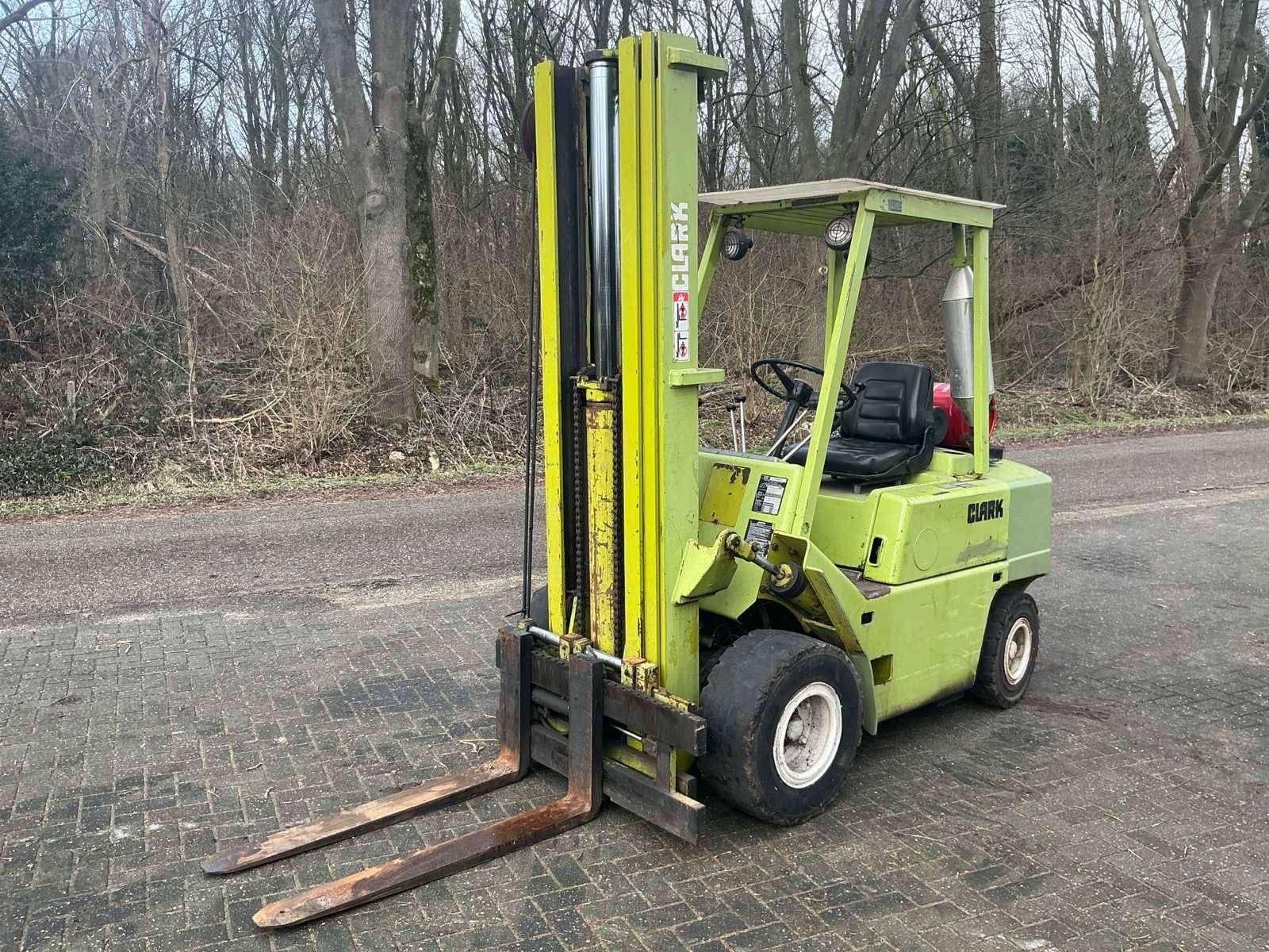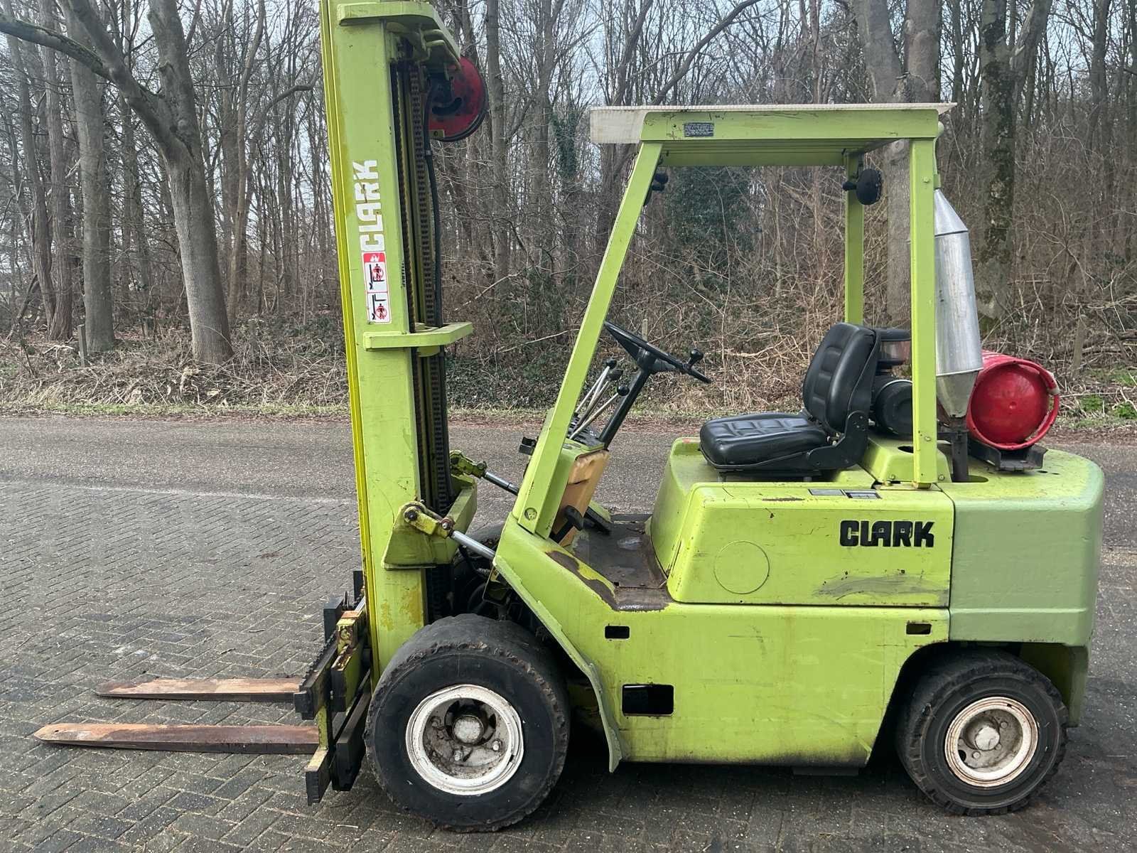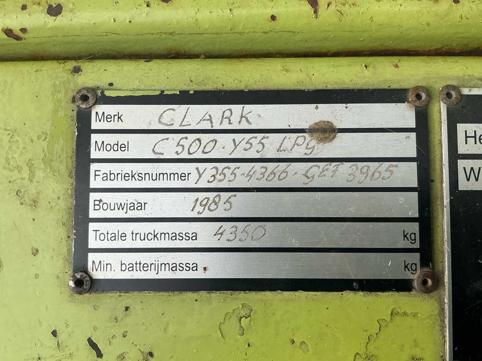 Zonder gasfles, No Merk: Clark Type: C500.Y55 LPG Bouwjaar: 1985 Serienummer: Y355-4366-GET 3965 Brandstof: LPG Kenteken: GEEN Aantal wielen: 4 Afgelezen urenstand: 833 Free-lift: true Side-shift: true Triple mast: true Eigen gewicht: 4350kg Hefvermogen: 3000kg Lepellengte: 1100mm Max. hefhoogte: 5600mm Vol rubber banden: true Minimale doorrijhoogte: 2550mm Totale afmeting L: 2750mm Totale afmeting Breedte: 1200mm Totale afmeting Hoogte: 2580mm LPG: true