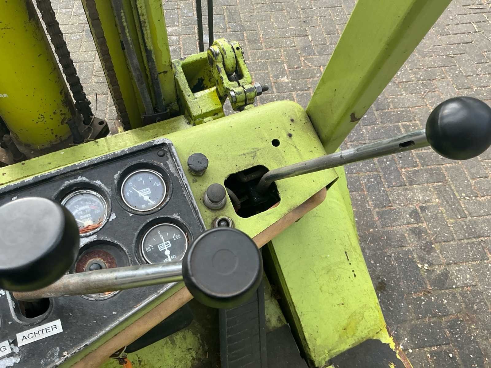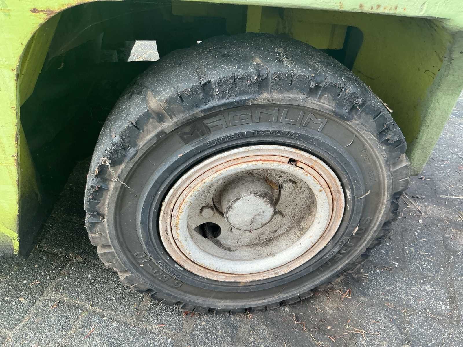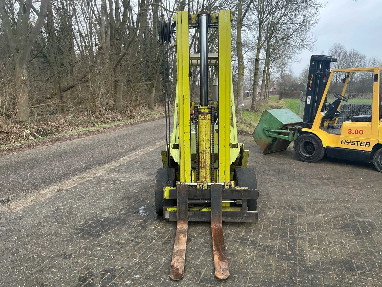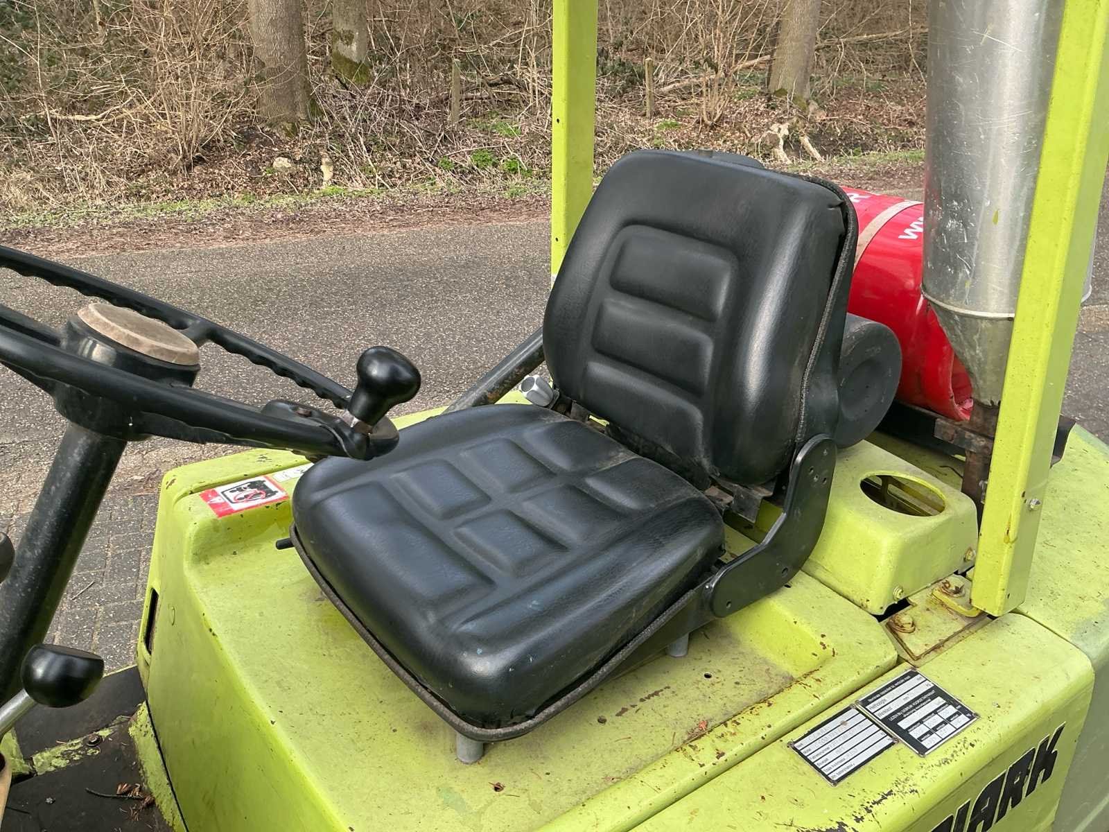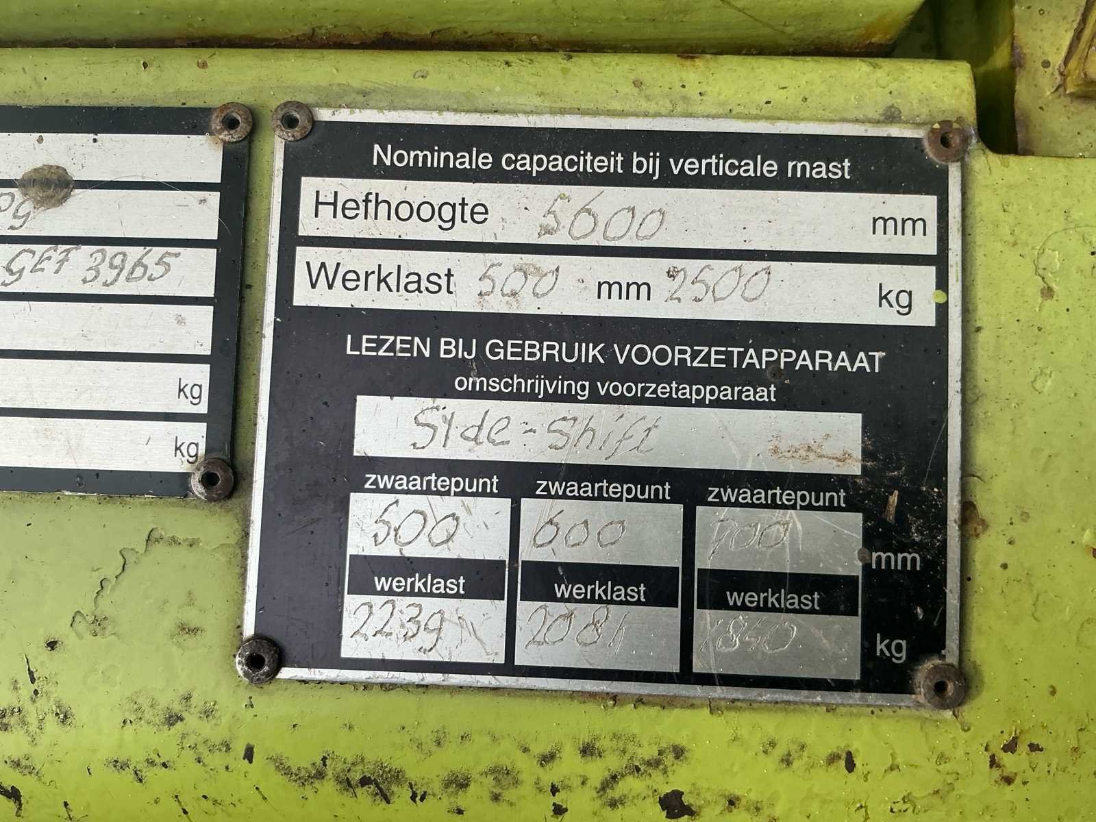 Zonder gasfles, No Merk: Clark Type: C500.Y55 LPG Bouwjaar: 1985 Serienummer: Y355-4366-GET 3965 Brandstof: LPG Kenteken: GEEN Aantal wielen: 4 Afgelezen urenstand: 833 Free-lift: true Side-shift: true Triple mast: true Eigen gewicht: 4350kg Hefvermogen: 3000kg Lepellengte: 1100mm Max. hefhoogte: 5600mm Vol rubber banden: true Minimale doorrijhoogte: 2550mm Totale afmeting L: 2750mm Totale afmeting Breedte: 1200mm Totale afmeting Hoogte: 2580mm LPG: true