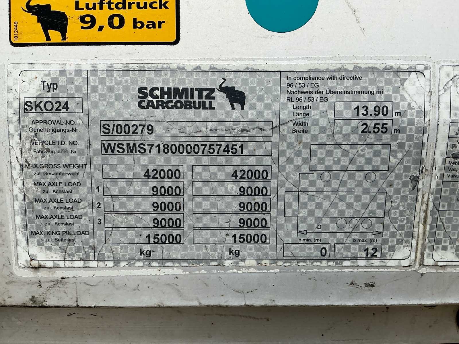 Voorzien van: bindrails, SAF-assen, stootrubbers achter, verlichting in laadruimte Nee Merk: schmitz cargobull Chassisnummer VIN: WSMS7180000757451 Kenteken: OK-28-JJ Datum eerste toelating (NL): 2008-03-31 Datum eerste toelating: 2008-03-31 APK vervaldatum: 2026-07-09 Aantal assen: 3 Laadvermogen: 34751kg Totale afmeting L: 14200mm Totale afmeting Breedte: 2550mm Totale afmeting Hoogte: 4100mm