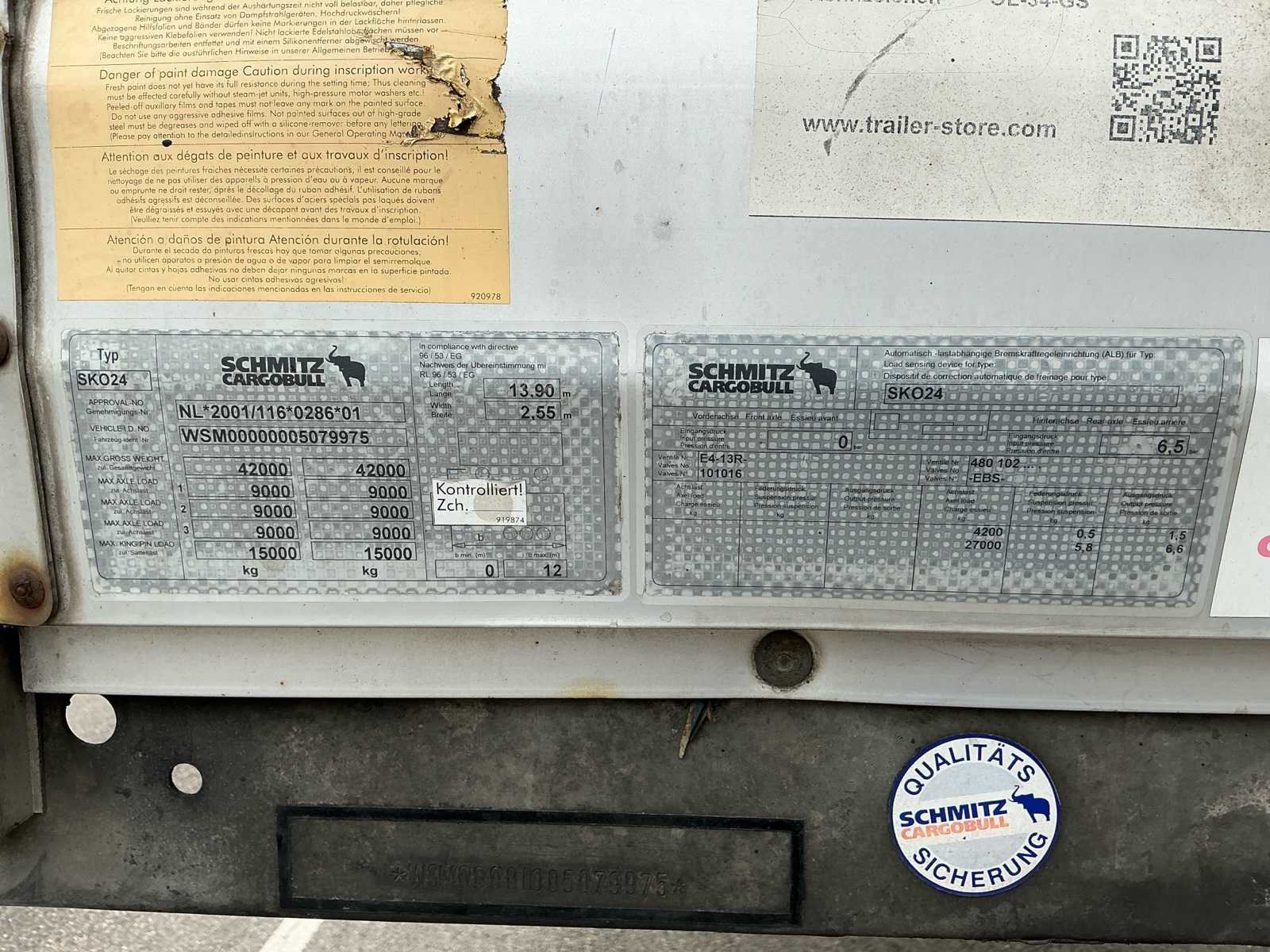 Voorzien van: uitklapbare laadklep (dhollandia), bindrails in laadruimte, verlichting in laadruimte Nee Merk: schmitz cargobull Type: Kastentrailer Chassisnummer VIN: WSM00000005079975 Kenteken: OL-34-GS Datum eerste toelating (NL): 2011-02-18 Datum eerste toelating: 2011-02-18 APK vervaldatum: 2026-10-06 Aantal assen: 3 Laadvermogen: 34627kg Hydraulische laadklep: true Totale afmeting L: 14100mm Totale afmeting Breedte: 2550mm Totale afmeting Hoogte: 4100mm