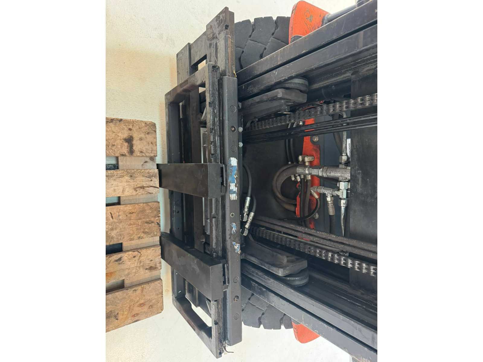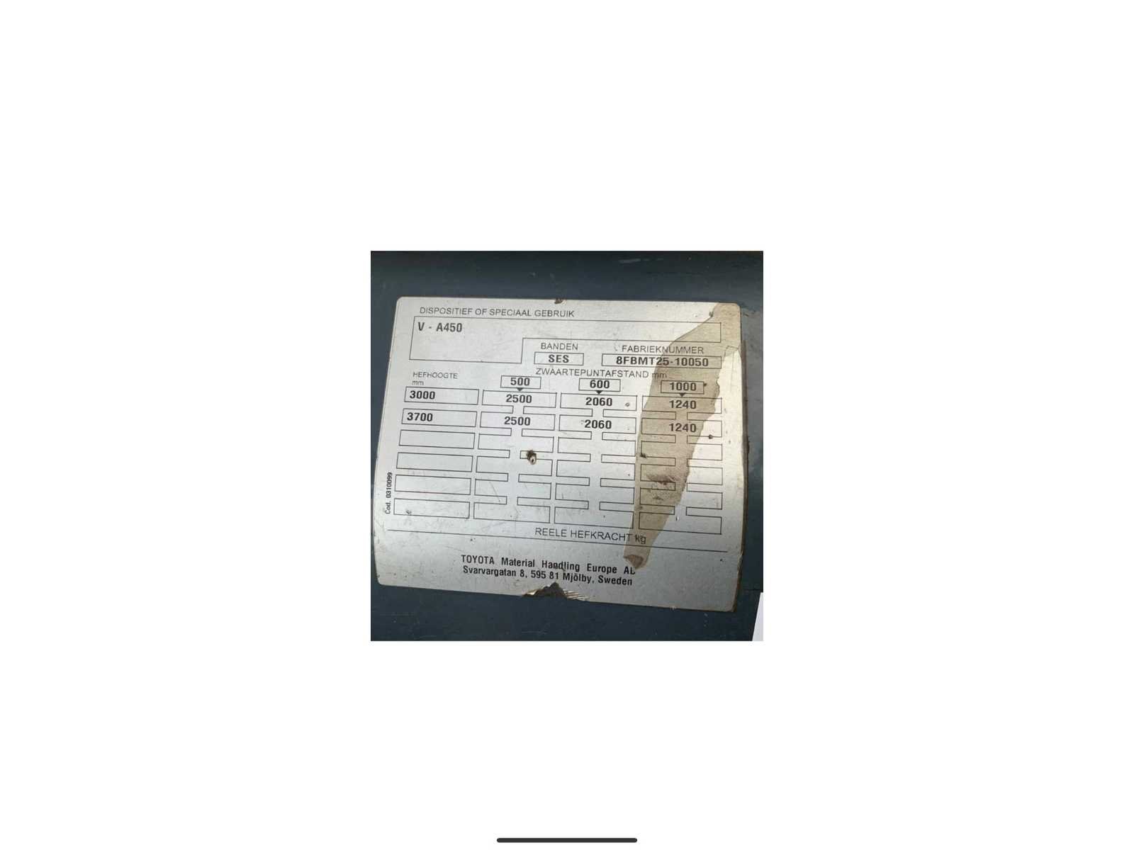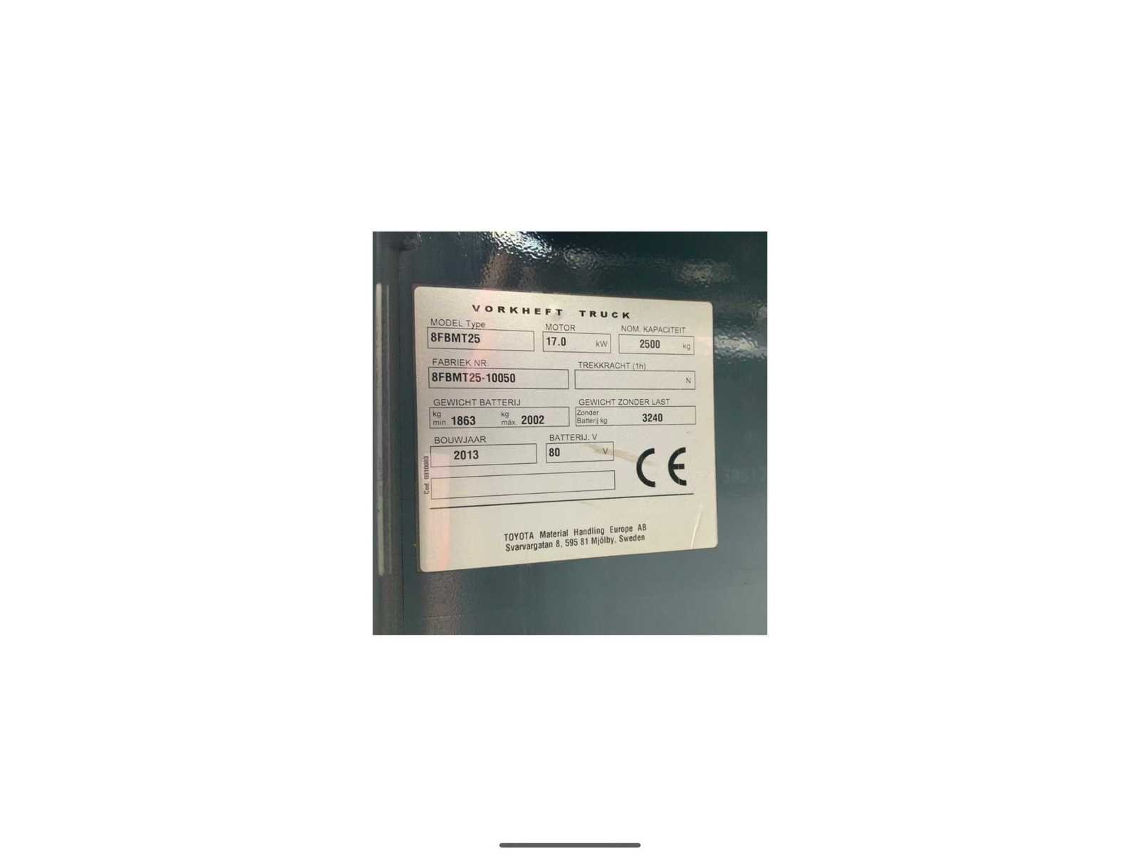 Voorzien van: Acculader, side-shift, accumulator (t.b.v. demping te tillen gewicht), werkverlichting voorzijde, Autofill systeem. Extra valbeveiliging op dak kan gedemonteerd worden. In 2024 nieuwe accu geplaatst, waarvan het testrapport aanwezig is. Nee Merk: Toyota Type: 8FBMT25 Bouwjaar: 2013 Serienummer: 8FBMT25-10050 Brandstof: Elektrisch Mast: Duplex Soort band: Volrubber banden Aantal wielen: 4 Afgelezen urenstand: 2567 Accu lader: true Side-shift: true Duplex mast: true Eigen gewicht: 5103kg Hefvermogen: 2500kg Lepellengte: 1000mm Max. hefhoogte: 3700mm Hefhoogte: 3700mm Vol rubber banden: true Minimale doorrijhoogte: 2620mm Totale afmeting L: 3500mm Totale afmeting Breedte: 1200mm Totale afmeting Hoogte: 2620mm
