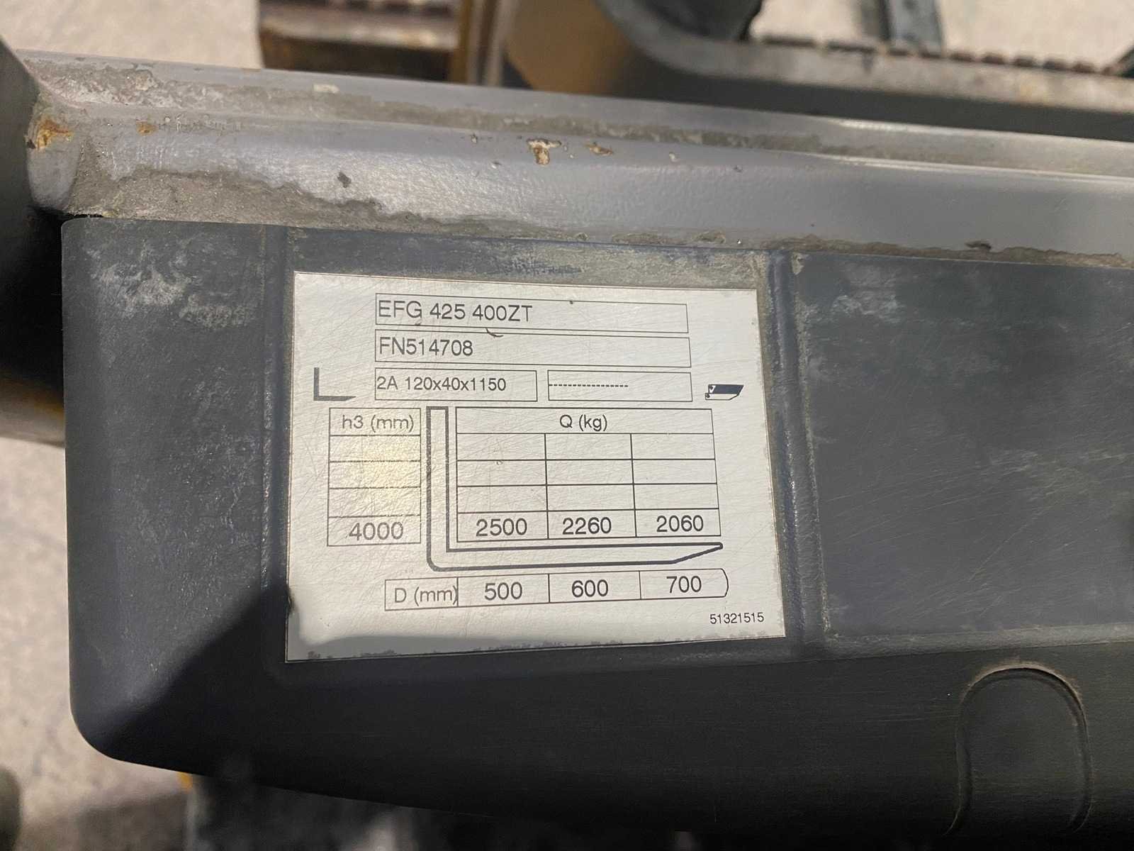 Bezichtiging Nee Merk: Jungheinrich Type: EFG425K Bouwjaar: 2016 Serienummer: FN514708 Brandstof: Elektrisch Mast: Duplex Aantal wielen: 4 Afgelezen urenstand: 5447 Accu lader: true Side-shift: true Duplex mast: true Eigen gewicht: 4555kg Hefvermogen: 2500kg Lepellengte: 1200mm Hefhoogte: 4120mm Vol rubber banden: true Totale afmeting L: 2500mm Totale afmeting Breedte: 1200mm Totale afmeting Hoogte: 2650mm