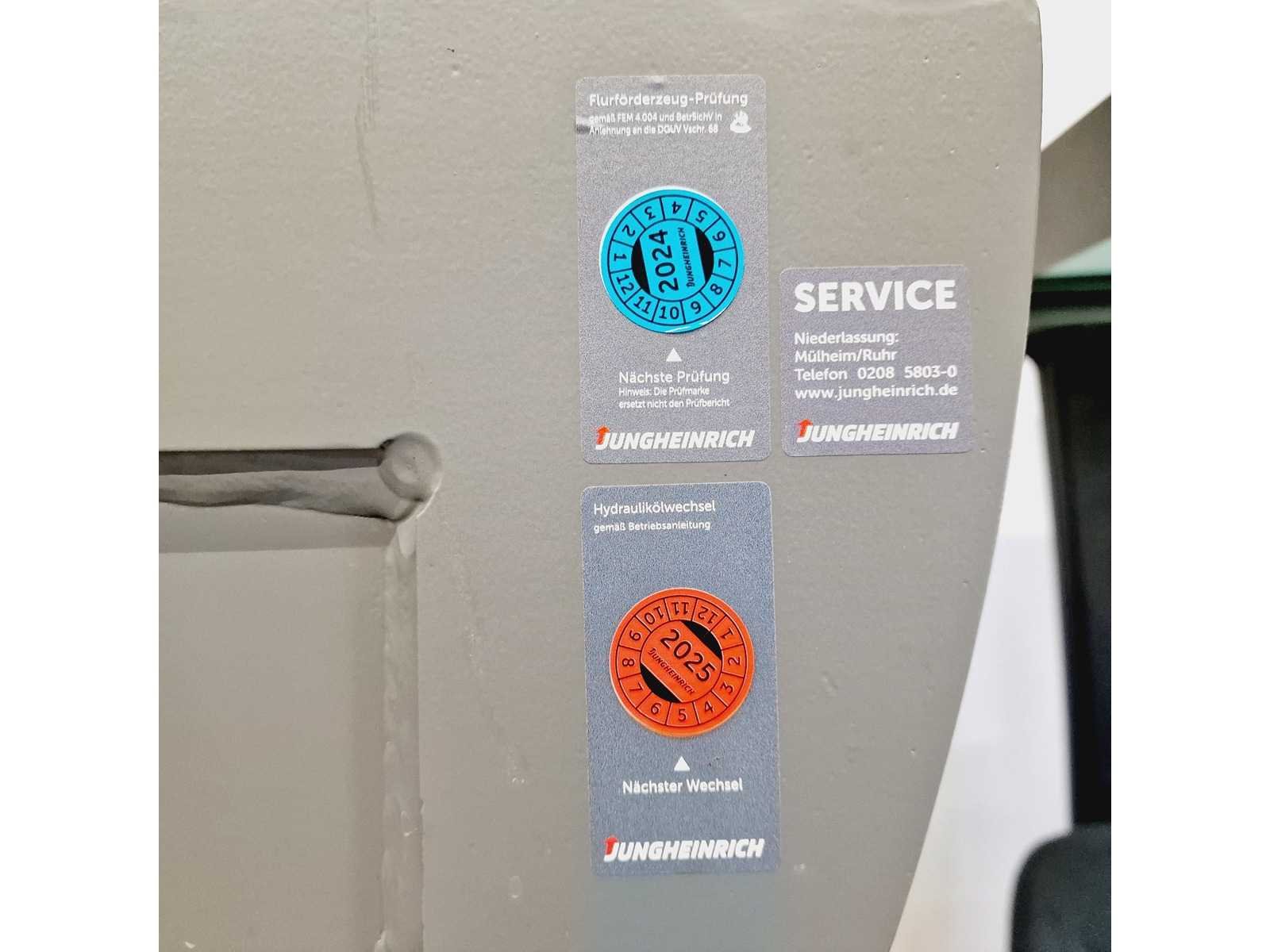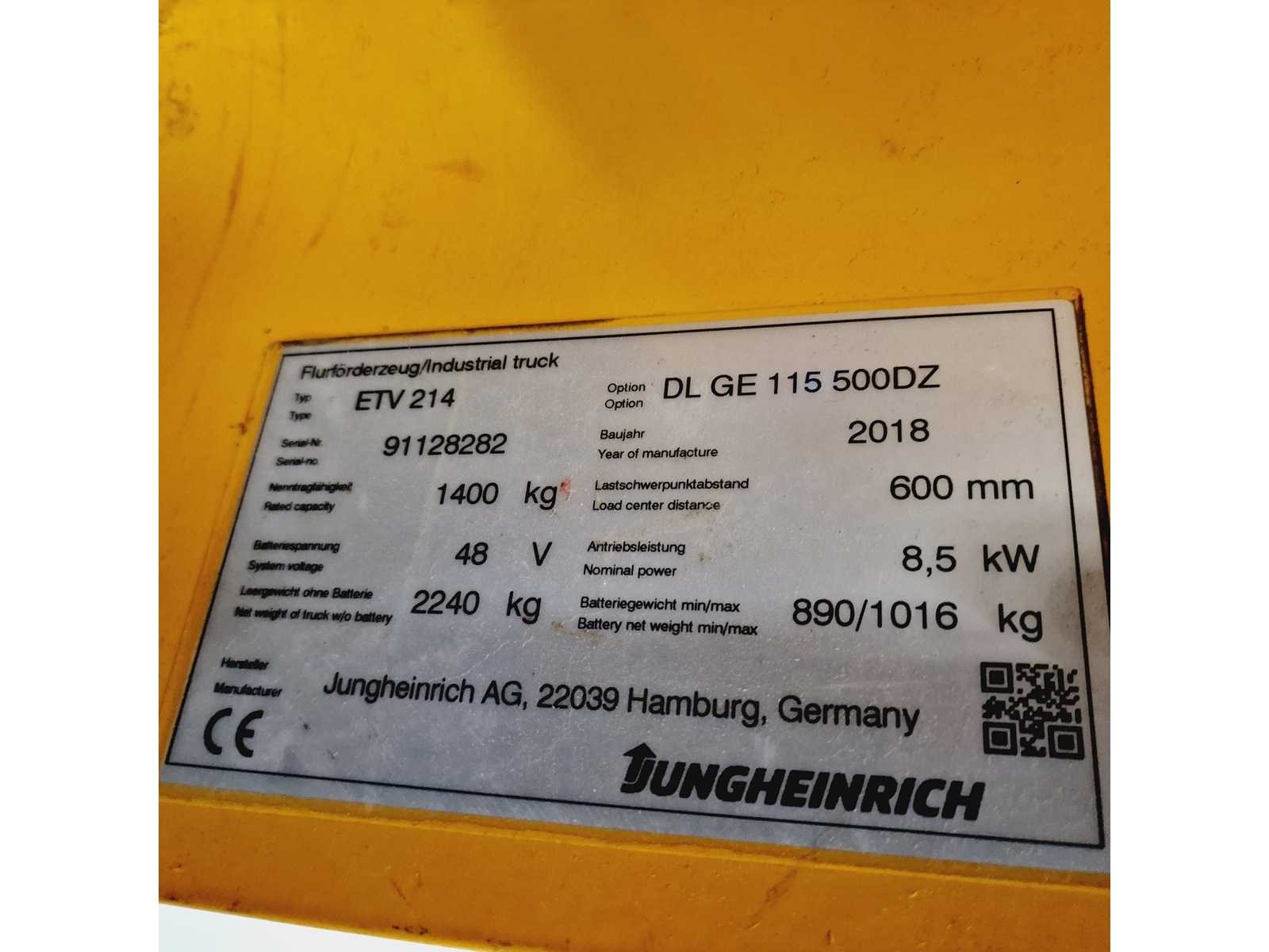Keuring 2025 Bezichtiging op afspraak Nee Merk: Jungheinrich Type: ETV 214 Bouwjaar: 2018 Serienummer: 91128282 Brandstof: Elektrisch Aantal wielen: 3 Afgelezen urenstand: 13522 Free-lift: true Triple mast: true Eigen gewicht: 3315kg Hefvermogen: 1400kg Lepellengte: 1200mm Hefhoogte: 5000mm Totale afmeting L: 2400mm Totale afmeting Breedte: 1250mm Totale afmeting Hoogte: 2200mm Elektrisch: true Vol rubber banden: true