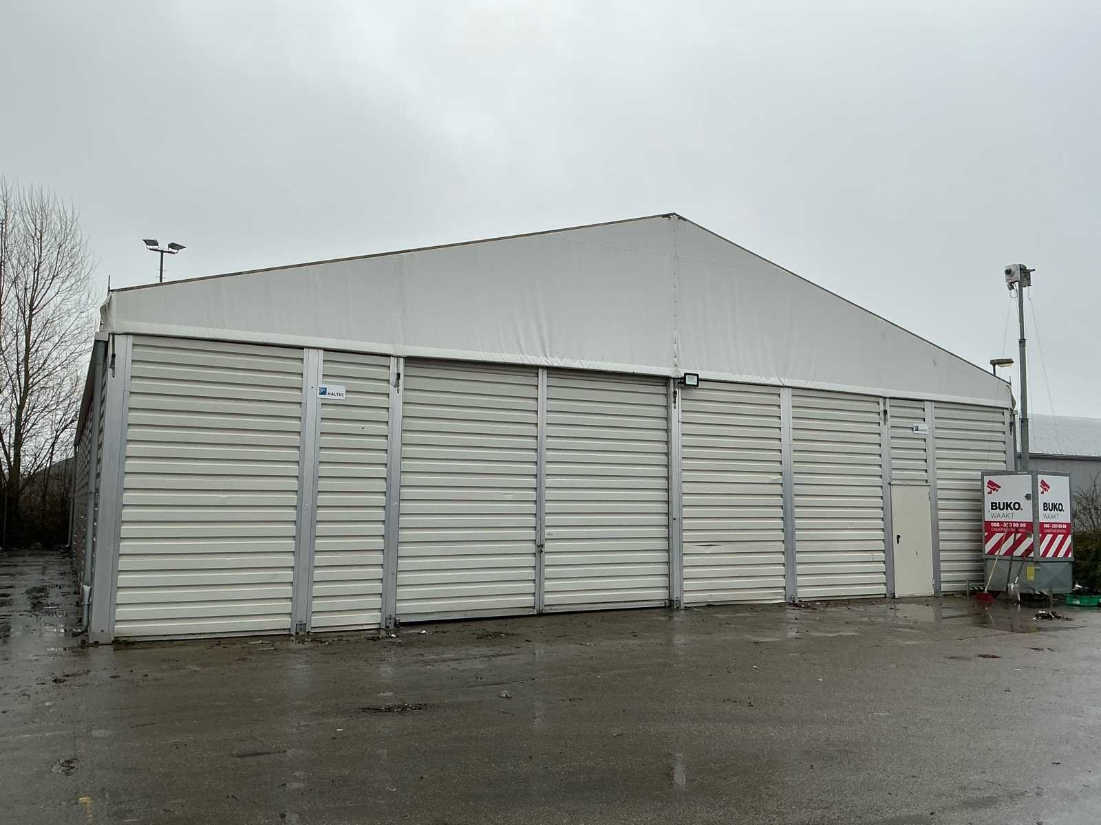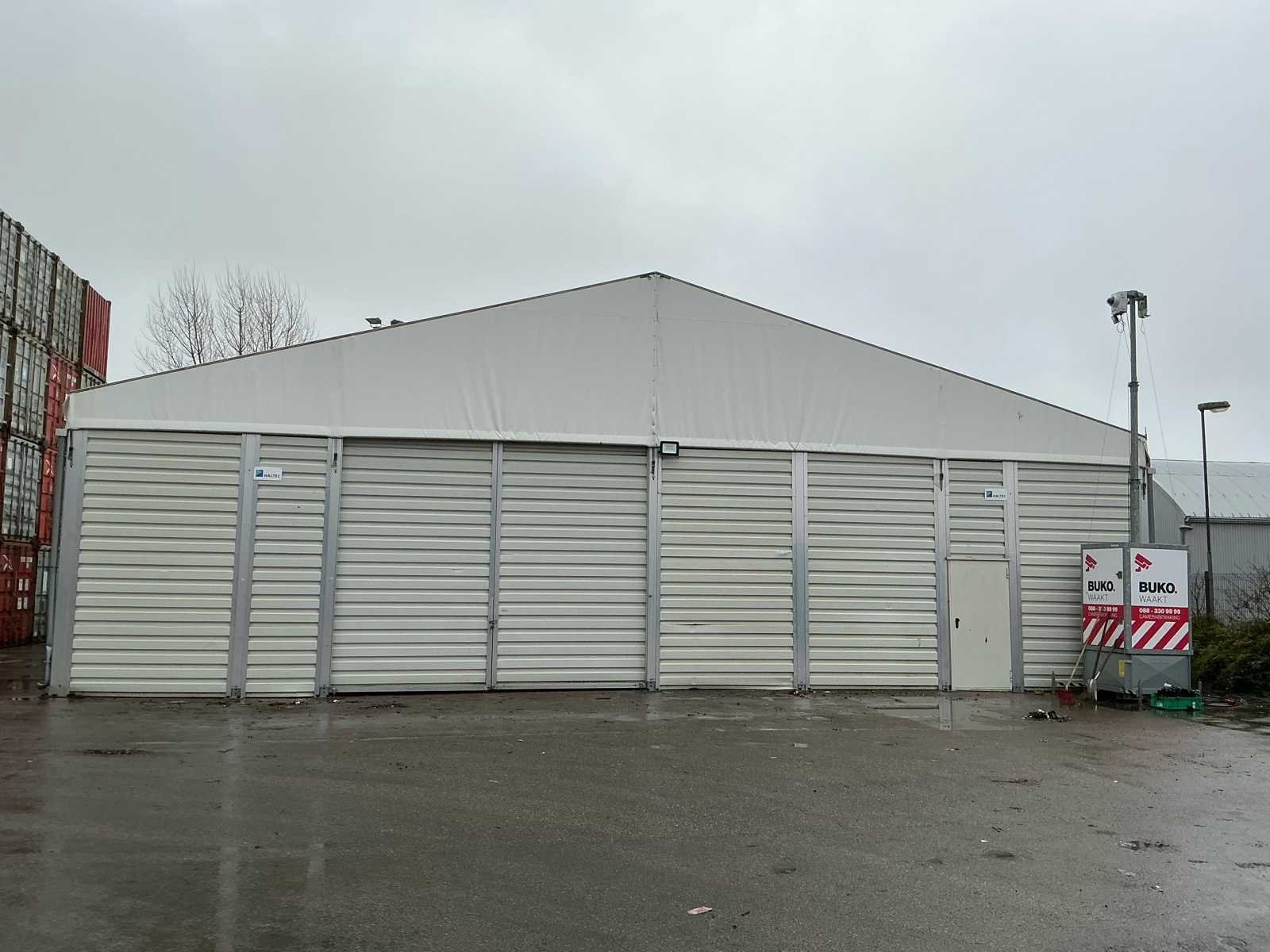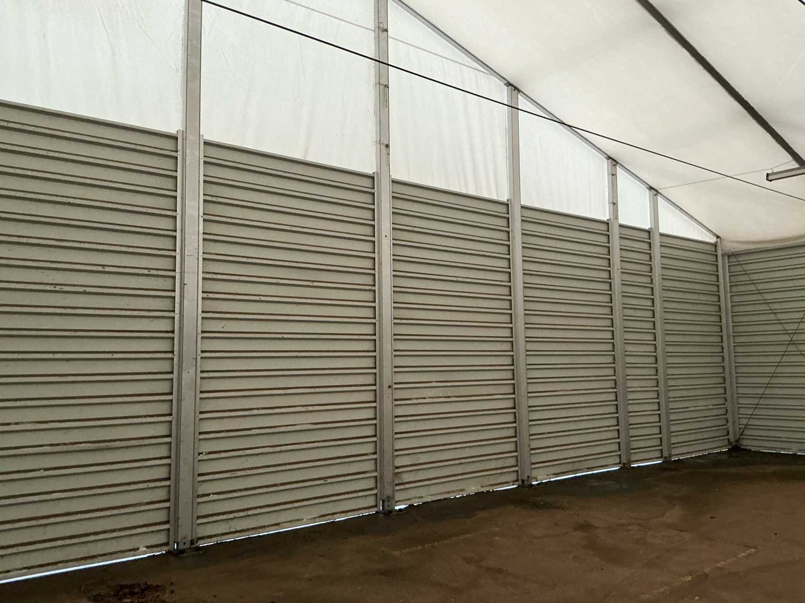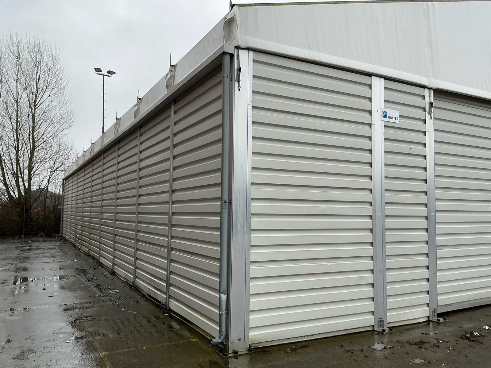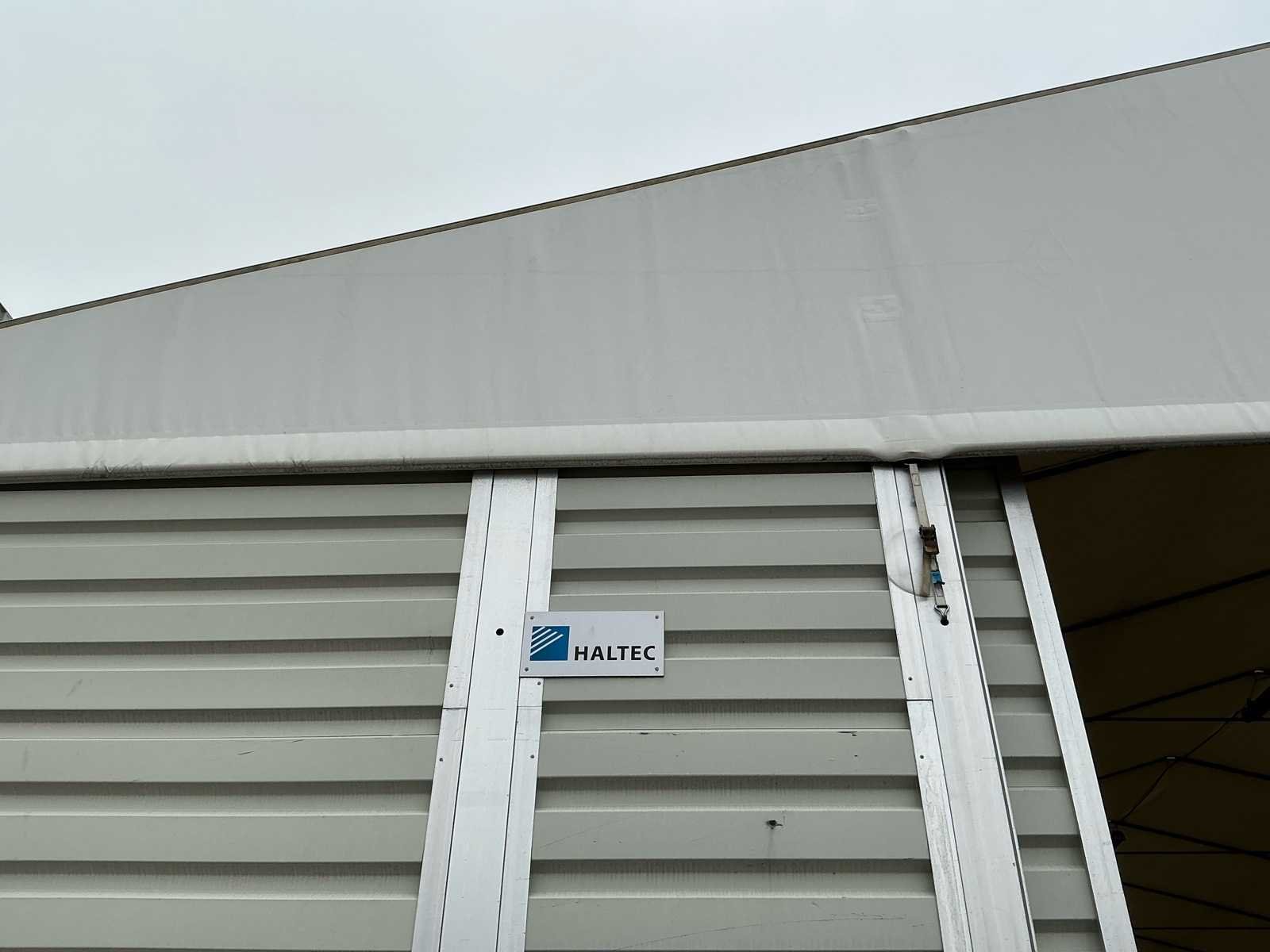 Haltec Basic tijdelijke / demontabele bedrijfshal. Afmetingen: 25 meter lengte 17,5 meter breedte 6,5 meter nokhoogte 4 meter goothoogte Doorrijbreedte schuifdeuren: 4,5 meter Doorrijhoogte schuifdeuren: 4 meter Constructie: Modulair systeem Aluminium staanders met stelmogelijkheid Funderingsvrije grondverankering d.m.v. grondpen Aluminium dakspanten Trapeziumvormig plaatmateriaal voor wanden a 2,40m x 1m per paneel PVC dakzeil met trekbanden + binnenzeil (condensatiebeschermend klasse 3) (2,5m breedte) Trapeziumvormig dubbele schuifpoort Spanners ten behoeve van dak en wandconstructie Sneeuwlast (dak) 0,20 KN/m2 Winddruk (stuwdruk) 0,60 KN/m2 Bestaande uit: 10 modulaire staander, wand en dakconstructie a 2,5m diepte, 4m goothoogte en 6,5m nokhoogte 2 losse toegangsdeuren Dubbele schuifpoort (4,5m doorrijbreedte en 4m doorrijhoogte) 15 stuks LED verlichting aan dakconstructie (220V) Regengoten langs beide lange zijden met afvoer Te gebruiken bij diverse soorten ondergrond (bestrating, asfalt etc.) De lengte van de hal is per 2,5 meter in te korten door de modulaire constructie van zowel wand als dakbekleding. Het dak bestaat uit een 2,5 meter breed dakzeil + binnenzeil wat een gelijke breedte heeft als de trapeziumvormige wandpanelen. Door koper te demonteren en afvoeren vóór 15 maart, zie onderstaande opmerking. Nee Merk: Haltec Materiaal: Aluminium Type: Basic Totaal oppervlakte: 437m² Nok hoogte: 6500mm Goot hoogte: 4000mm Totale afmeting L: 25000mm Totale afmeting Breedte: 17500mm Totale afmeting Hoogte: 6500mm