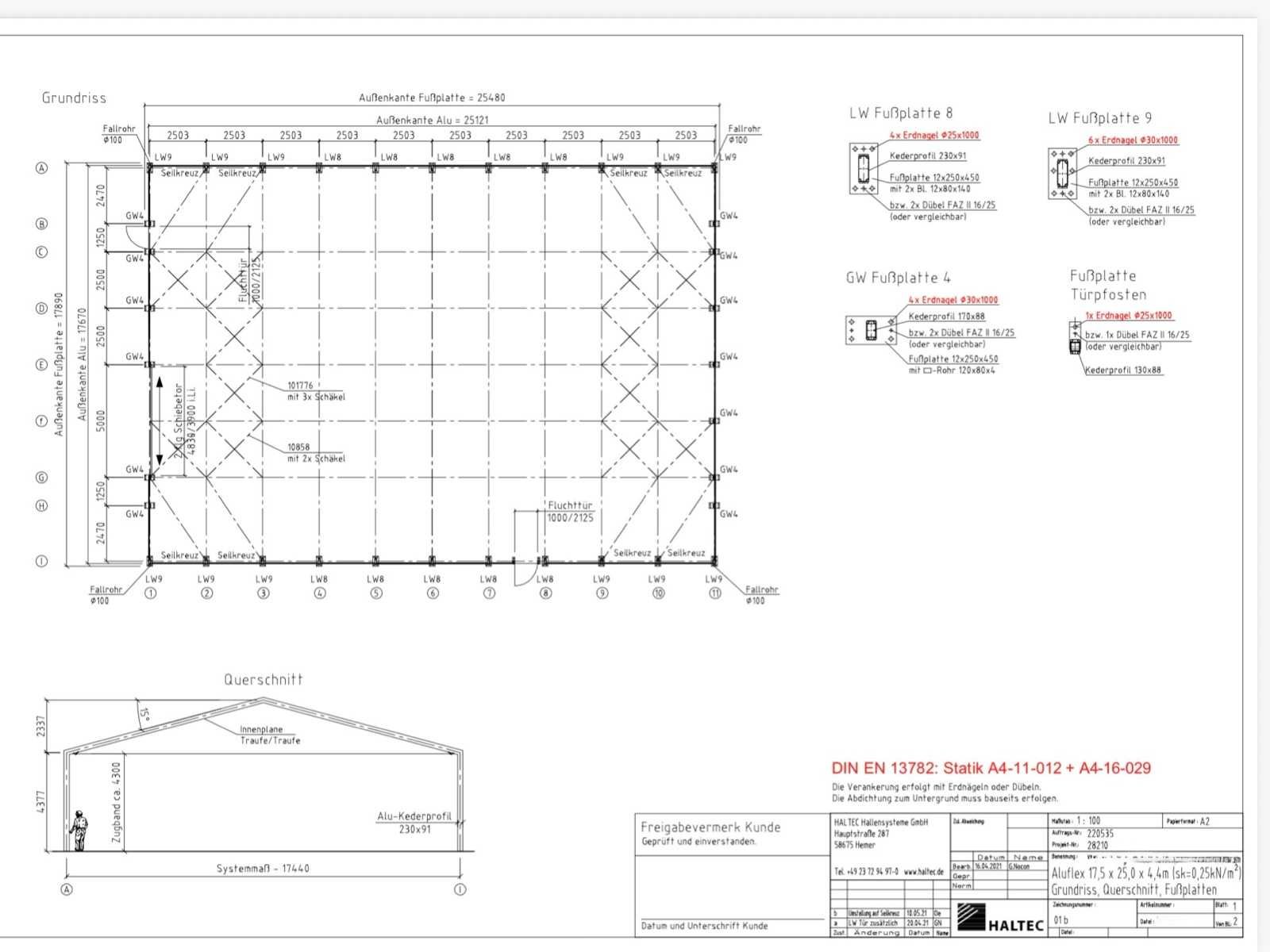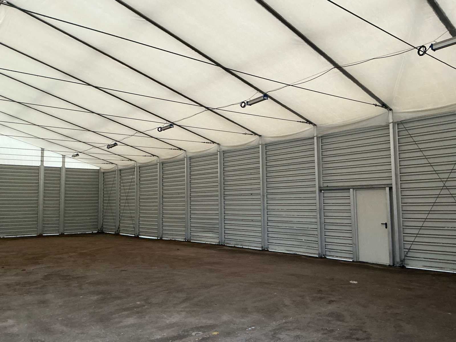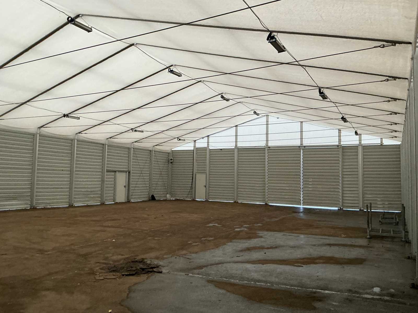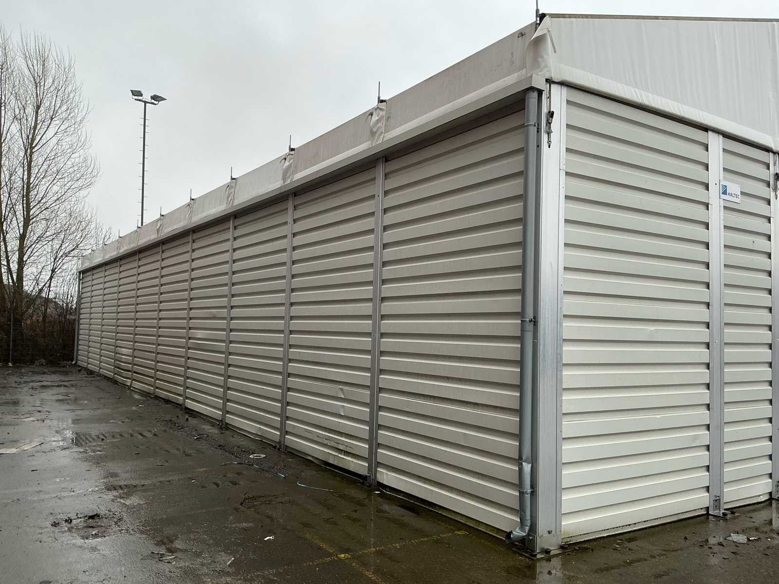 Haltec Basic tijdelijke / demontabele bedrijfshal. Afmetingen: 25 meter lengte 17,5 meter breedte 6,5 meter nokhoogte 4 meter goothoogte Doorrijbreedte schuifdeuren: 4,5 meter Doorrijhoogte schuifdeuren: 4 meter Constructie: Modulair systeem Aluminium staanders met stelmogelijkheid Funderingsvrije grondverankering d.m.v. grondpen Aluminium dakspanten Trapeziumvormig plaatmateriaal voor wanden a 2,40m x 1m per paneel PVC dakzeil met trekbanden + binnenzeil (condensatiebeschermend klasse 3) (2,5m breedte) Trapeziumvormig dubbele schuifpoort Spanners ten behoeve van dak en wandconstructie Sneeuwlast (dak) 0,20 KN/m2 Winddruk (stuwdruk) 0,60 KN/m2 Bestaande uit: 10 modulaire staander, wand en dakconstructie a 2,5m diepte, 4m goothoogte en 6,5m nokhoogte 2 losse toegangsdeuren Dubbele schuifpoort (4,5m doorrijbreedte en 4m doorrijhoogte) 15 stuks LED verlichting aan dakconstructie (220V) Regengoten langs beide lange zijden met afvoer Te gebruiken bij diverse soorten ondergrond (bestrating, asfalt etc.) De lengte van de hal is per 2,5 meter in te korten door de modulaire constructie van zowel wand als dakbekleding. Het dak bestaat uit een 2,5 meter breed dakzeil + binnenzeil wat een gelijke breedte heeft als de trapeziumvormige wandpanelen. Door koper te demonteren en afvoeren vóór 15 maart, zie onderstaande opmerking. Nee Merk: Haltec Materiaal: Aluminium Type: Basic Totaal oppervlakte: 437m² Nok hoogte: 6500mm Goot hoogte: 4000mm Totale afmeting L: 25000mm Totale afmeting Breedte: 17500mm Totale afmeting Hoogte: 6500mm