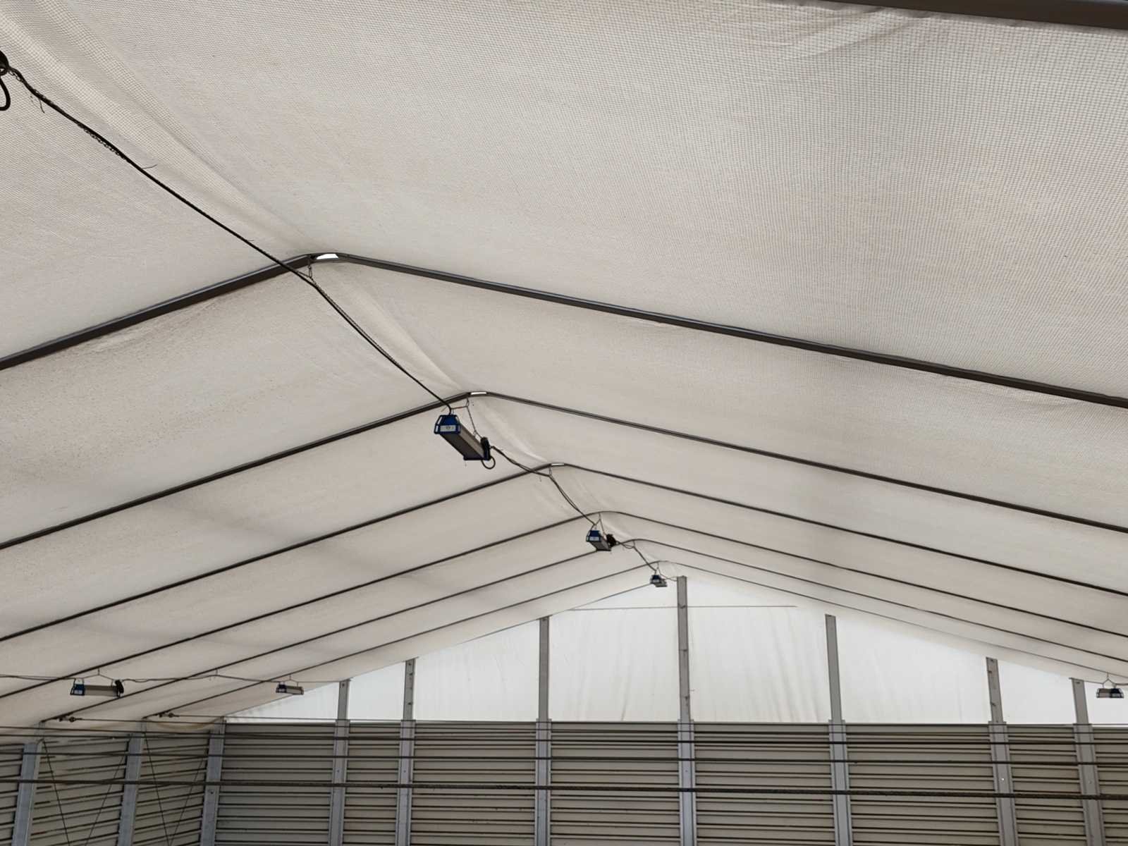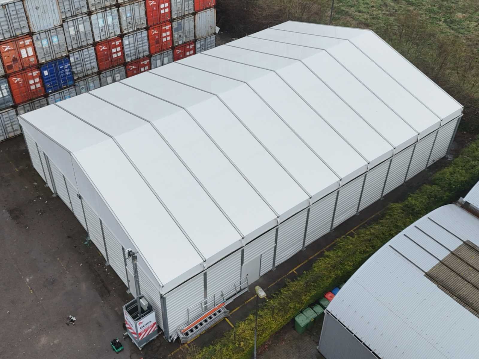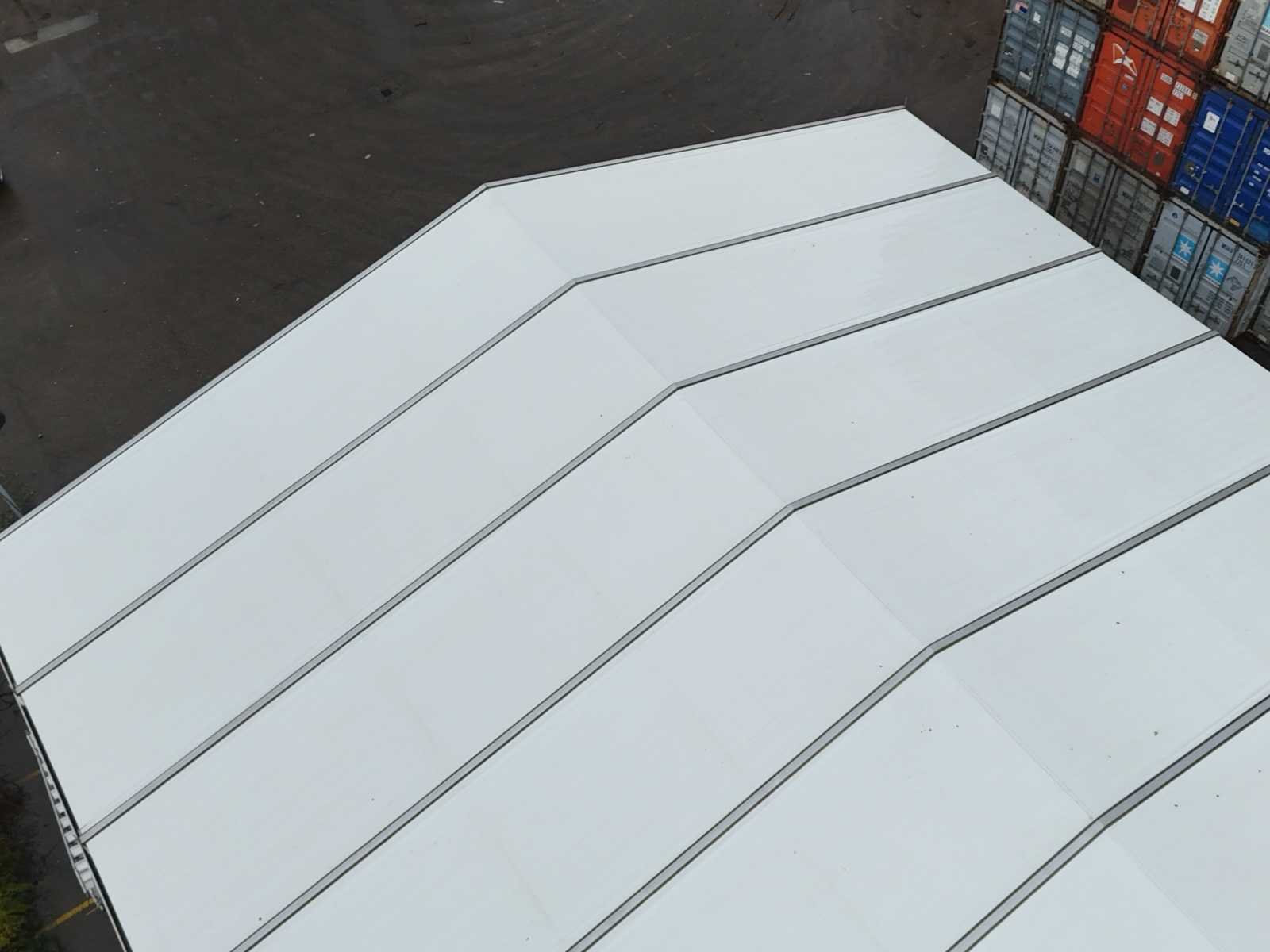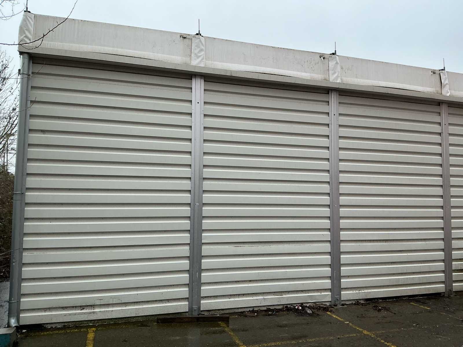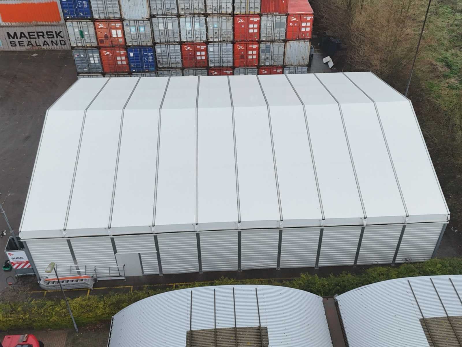 Haltec Basic tijdelijke / demontabele bedrijfshal. Afmetingen: 25 meter lengte 17,5 meter breedte 6,5 meter nokhoogte 4 meter goothoogte Doorrijbreedte schuifdeuren: 4,5 meter Doorrijhoogte schuifdeuren: 4 meter Constructie: Modulair systeem Aluminium staanders met stelmogelijkheid Funderingsvrije grondverankering d.m.v. grondpen Aluminium dakspanten Trapeziumvormig plaatmateriaal voor wanden a 2,40m x 1m per paneel PVC dakzeil met trekbanden + binnenzeil (condensatiebeschermend klasse 3) (2,5m breedte) Trapeziumvormig dubbele schuifpoort Spanners ten behoeve van dak en wandconstructie Sneeuwlast (dak) 0,20 KN/m2 Winddruk (stuwdruk) 0,60 KN/m2 Bestaande uit: 10 modulaire staander, wand en dakconstructie a 2,5m diepte, 4m goothoogte en 6,5m nokhoogte 2 losse toegangsdeuren Dubbele schuifpoort (4,5m doorrijbreedte en 4m doorrijhoogte) 15 stuks LED verlichting aan dakconstructie (220V) Regengoten langs beide lange zijden met afvoer Te gebruiken bij diverse soorten ondergrond (bestrating, asfalt etc.) De lengte van de hal is per 2,5 meter in te korten door de modulaire constructie van zowel wand als dakbekleding. Het dak bestaat uit een 2,5 meter breed dakzeil + binnenzeil wat een gelijke breedte heeft als de trapeziumvormige wandpanelen. Door koper te demonteren en afvoeren vóór 15 maart, zie onderstaande opmerking. Nee Merk: Haltec Materiaal: Aluminium Type: Basic Totaal oppervlakte: 437m² Nok hoogte: 6500mm Goot hoogte: 4000mm Totale afmeting L: 25000mm Totale afmeting Breedte: 17500mm Totale afmeting Hoogte: 6500mm