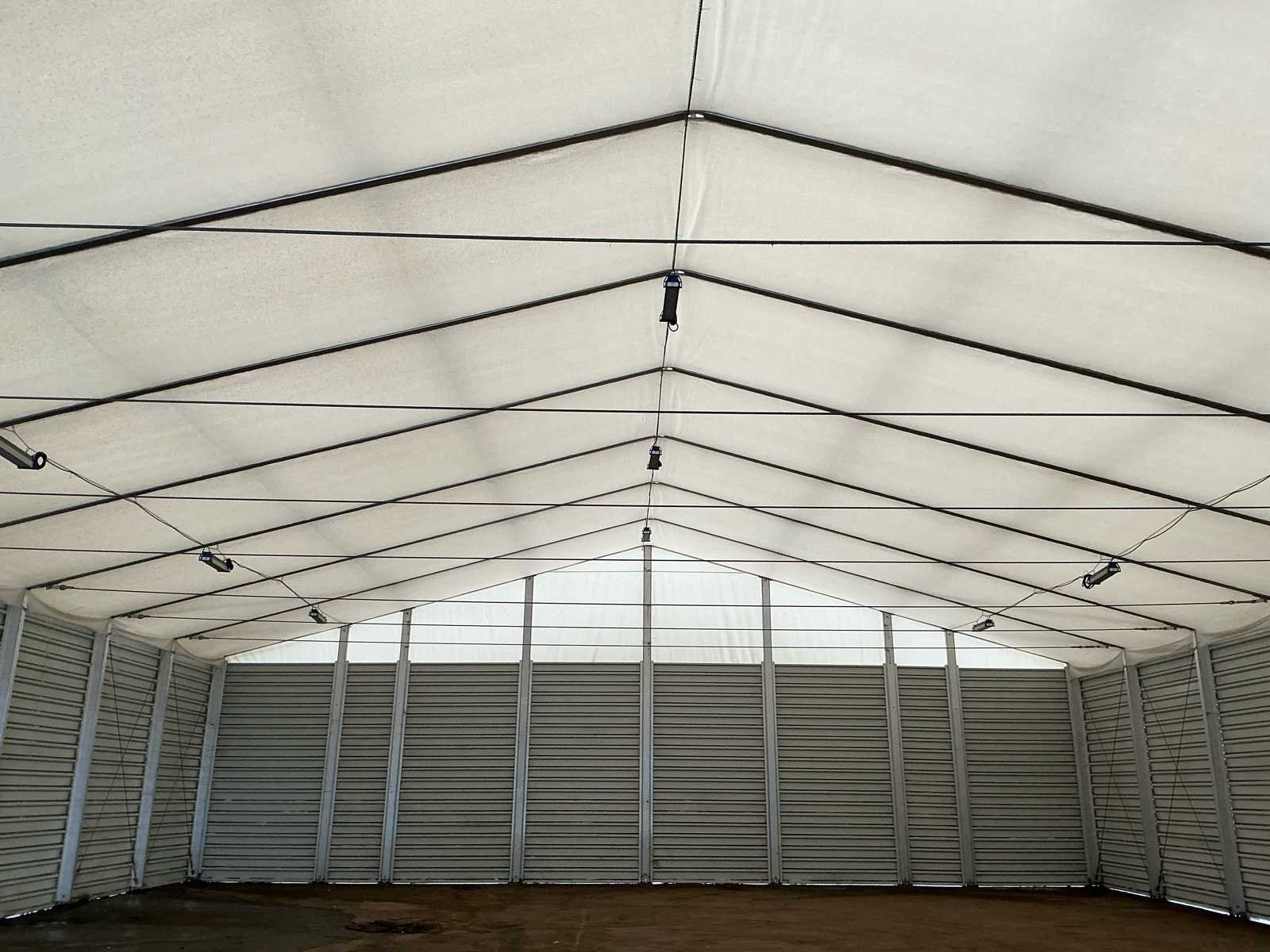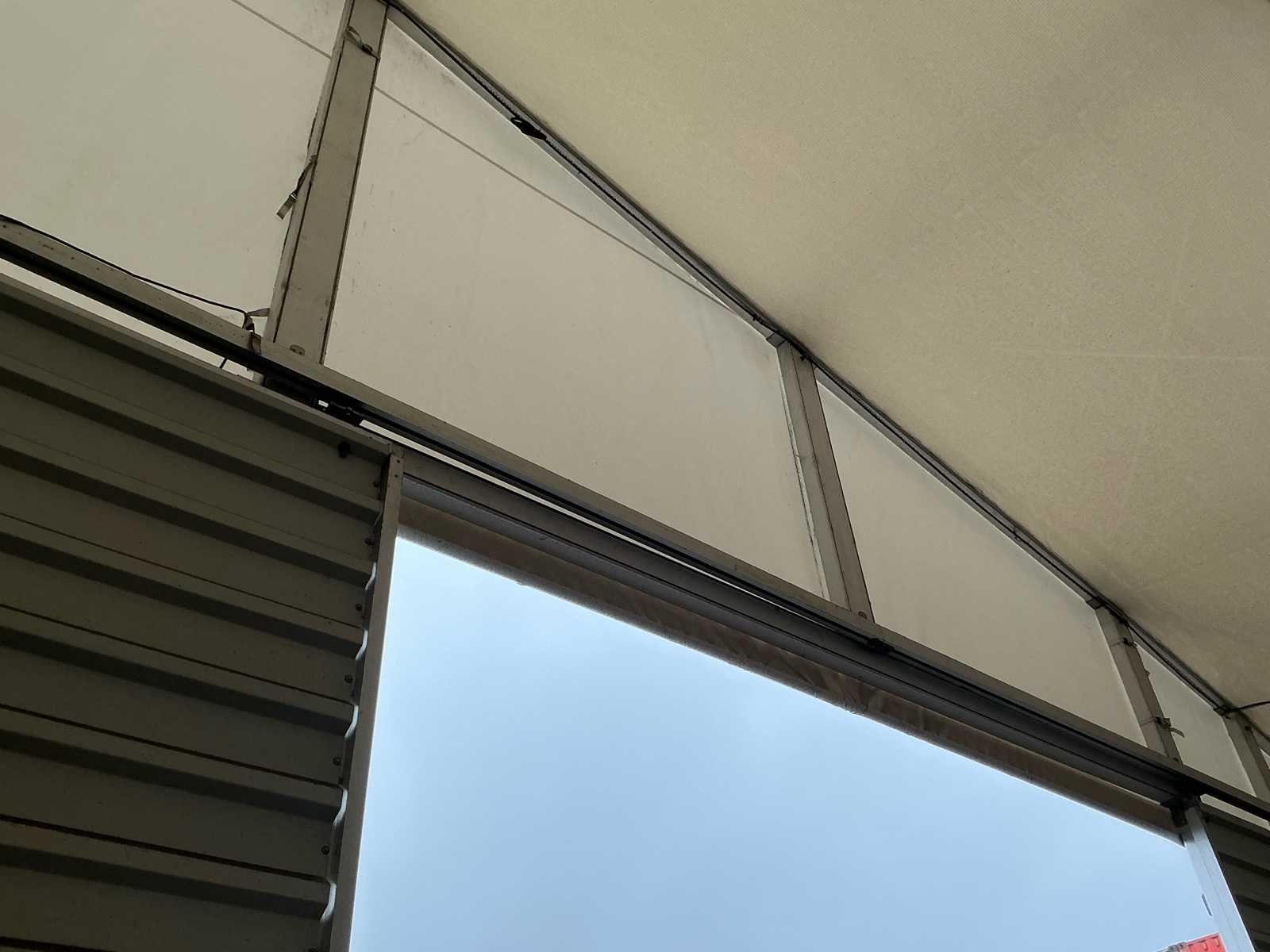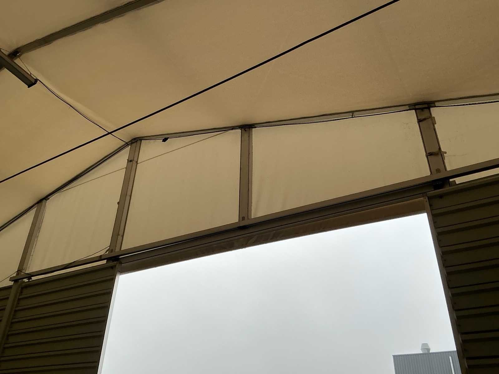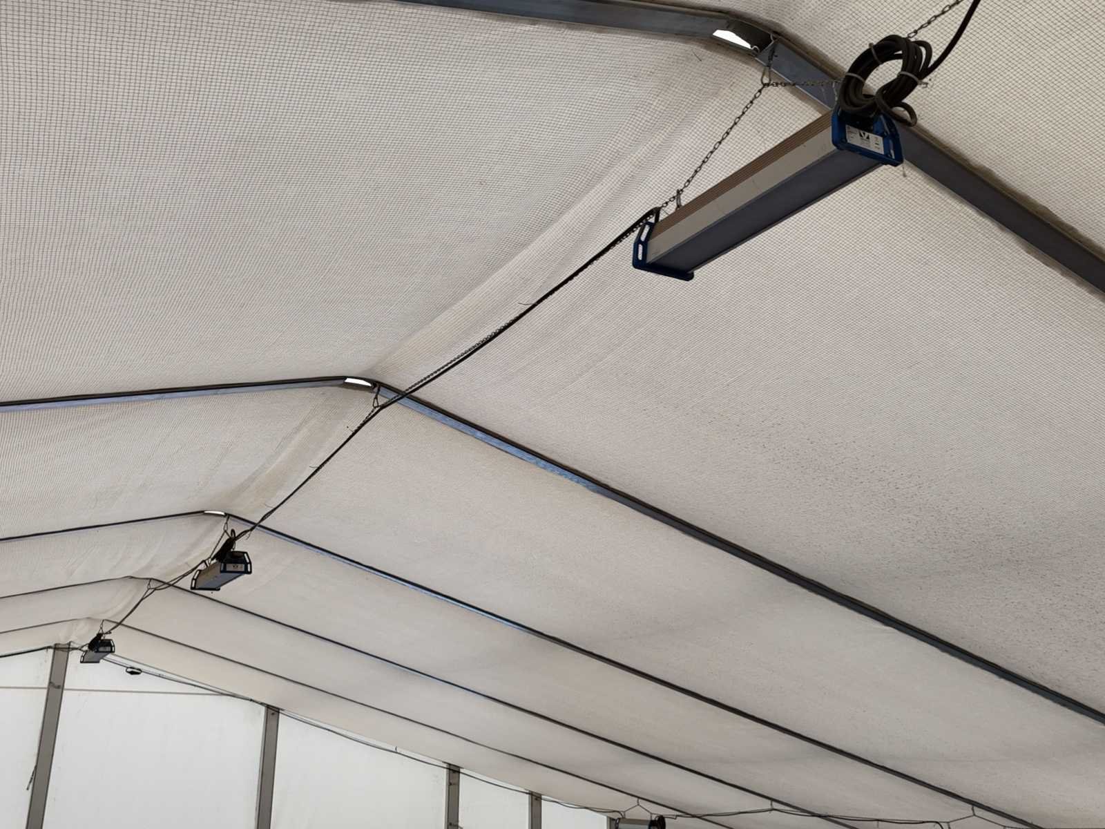Haltec Basic tijdelijke / demontabele bedrijfshal. Afmetingen: 25 meter lengte 17,5 meter breedte 6,5 meter nokhoogte 4 meter goothoogte Doorrijbreedte schuifdeuren: 4,5 meter Doorrijhoogte schuifdeuren: 4 meter Constructie: Modulair systeem Aluminium staanders met stelmogelijkheid Funderingsvrije grondverankering d.m.v. grondpen Aluminium dakspanten Trapeziumvormig plaatmateriaal voor wanden a 2,40m x 1m per paneel PVC dakzeil met trekbanden + binnenzeil (condensatiebeschermend klasse 3) (2,5m breedte) Trapeziumvormig dubbele schuifpoort Spanners ten behoeve van dak en wandconstructie Sneeuwlast (dak) 0,20 KN/m2 Winddruk (stuwdruk) 0,60 KN/m2 Bestaande uit: 10 modulaire staander, wand en dakconstructie a 2,5m diepte, 4m goothoogte en 6,5m nokhoogte 2 losse toegangsdeuren Dubbele schuifpoort (4,5m doorrijbreedte en 4m doorrijhoogte) 15 stuks LED verlichting aan dakconstructie (220V) Regengoten langs beide lange zijden met afvoer Te gebruiken bij diverse soorten ondergrond (bestrating, asfalt etc.) De lengte van de hal is per 2,5 meter in te korten door de modulaire constructie van zowel wand als dakbekleding. Het dak bestaat uit een 2,5 meter breed dakzeil + binnenzeil wat een gelijke breedte heeft als de trapeziumvormige wandpanelen. Door koper te demonteren en afvoeren vóór 15 maart, zie onderstaande opmerking. Nee Merk: Haltec Materiaal: Aluminium Type: Basic Totaal oppervlakte: 437m² Nok hoogte: 6500mm Goot hoogte: 4000mm Totale afmeting L: 25000mm Totale afmeting Breedte: 17500mm Totale afmeting Hoogte: 6500mm