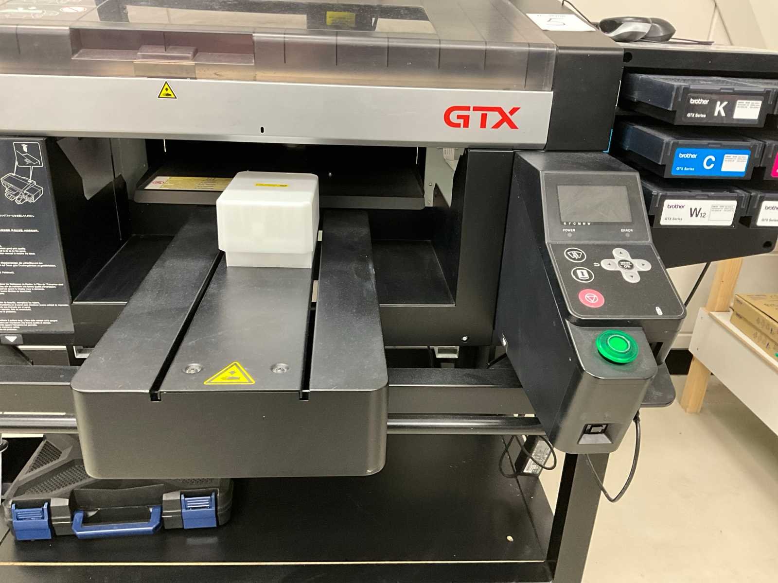 Voorzien van machine met storing; verrijdbaar Nee Merk: Brother Type: GTX-422 Bouwjaar: 2019 Serienummer: K9932370 Digitaal printen: true Werkbreedte: 365mm Digitale besturing: true Aansluiting: 230V Totale afmeting L: 1400mm Totale afmeting Breedte: 1400mm Totale afmeting Hoogte: 1800mm