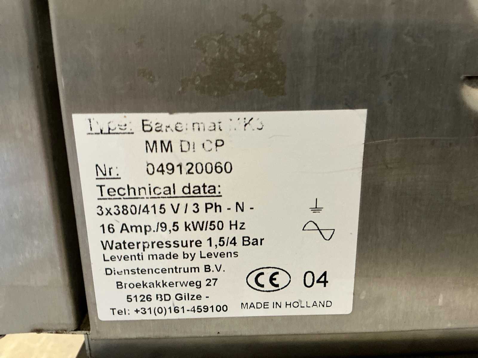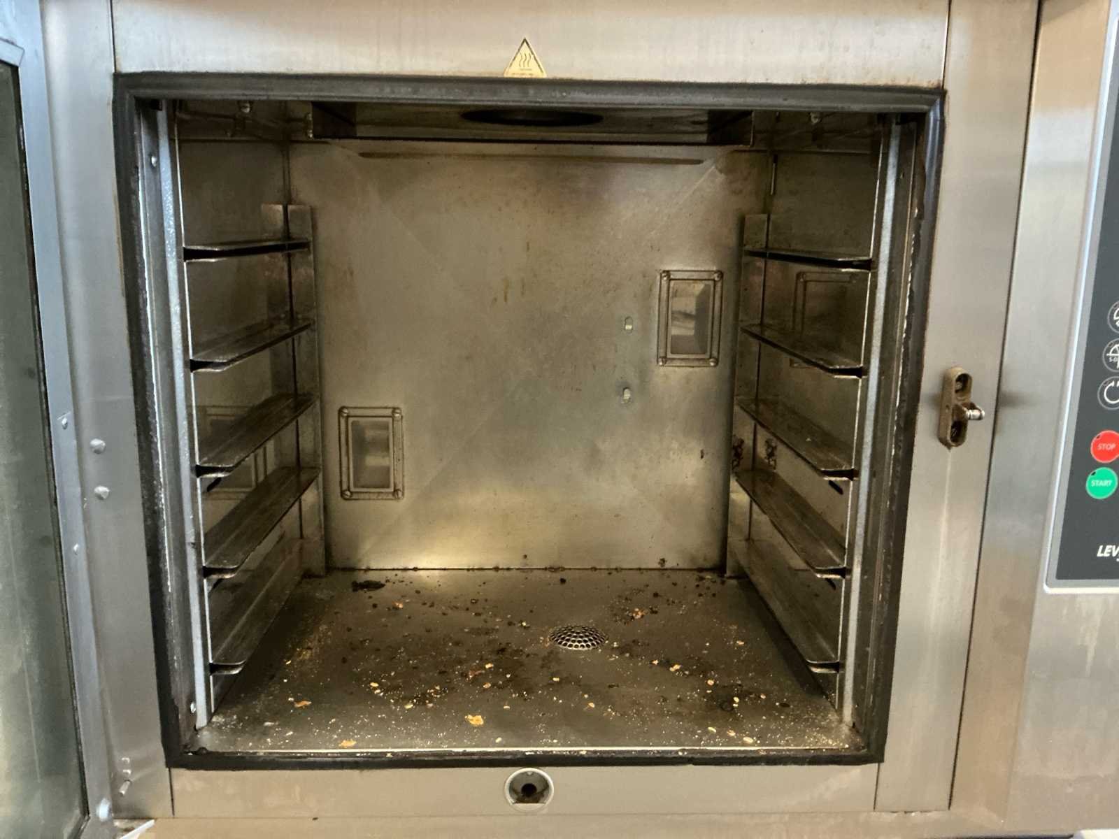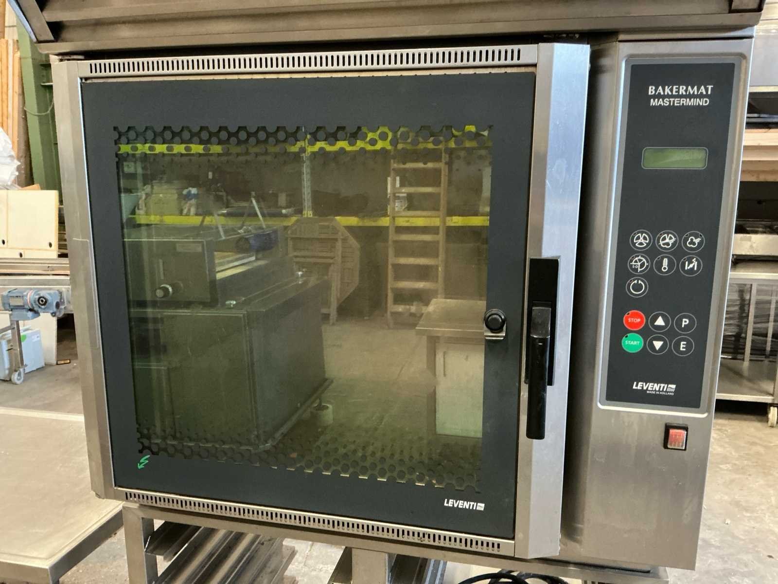 Breedte binnenzijde oven: 600 mm Diepte binnenzijde oven: 400 mm Hoogte oven: binnenzijde 550 mm Voorzien van: Afzuigaansluiting en RVS onderstel met met 18 inschuifrekken Afmeting onderstel: 960 mm breed, 670mm diep, 1050mm hoog Afmeting buitenzijde oven: 1000mm breed, 740mm diep, 1150mm hoog. Nee Merk: Leventi Type: Bakermat Mastermind MK3 Serienummer: 049120060 Aantal niveau's: 5 Aansluiting: 380V Totale afmeting L: 900mm Totale afmeting Breedte: 1100mm Totale afmeting Hoogte: 2200mm