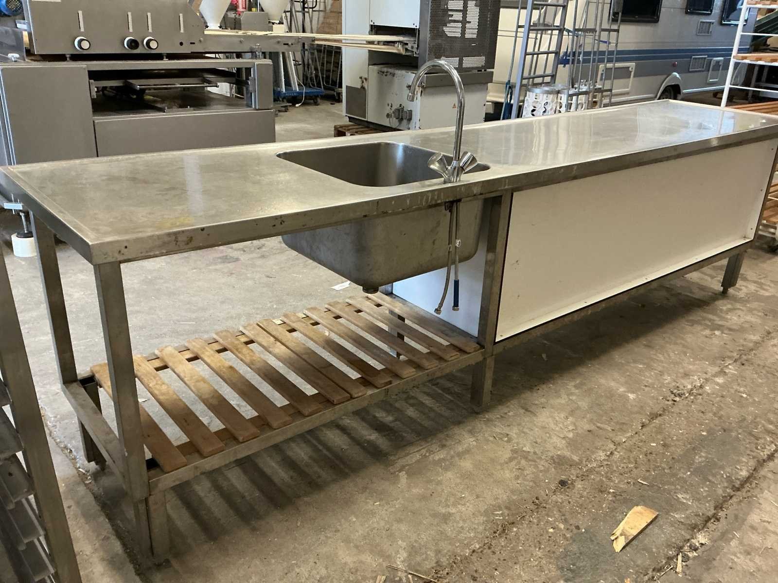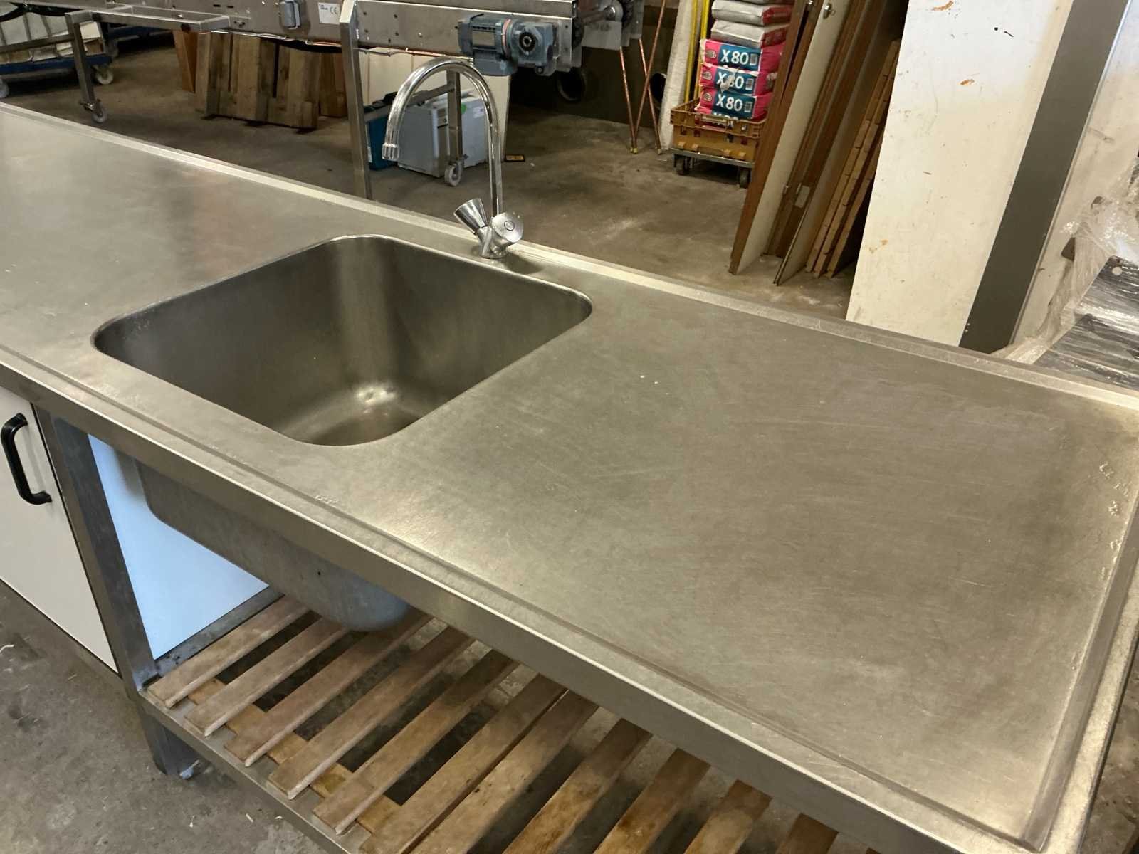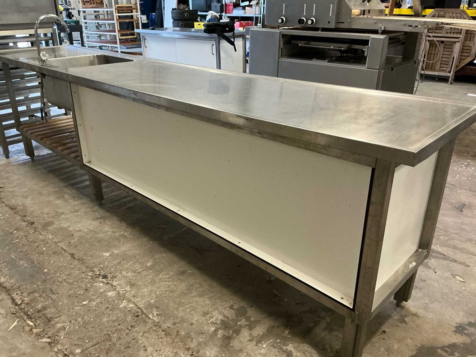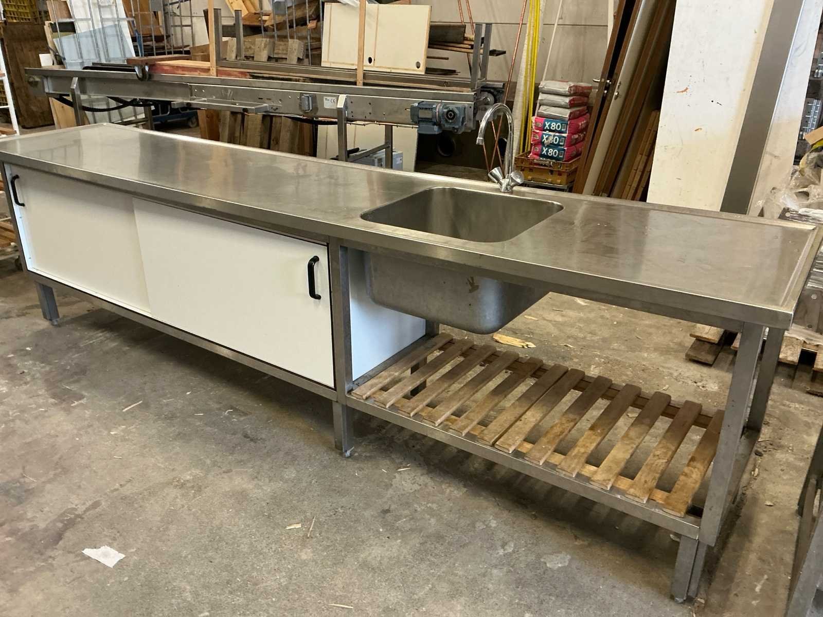 Voorzien van: speolbak met kraan, houten rek, opberggedeelte met schuifdeuren. Opberggedeelte :190 x 50 x 50 cm. Breedte grote werkblad (exclusief spoelbak): 190 cm. Nee Totale afmeting L: 700mm Totale afmeting Breedte: 3300mm Totale afmeting Hoogte: 910mm