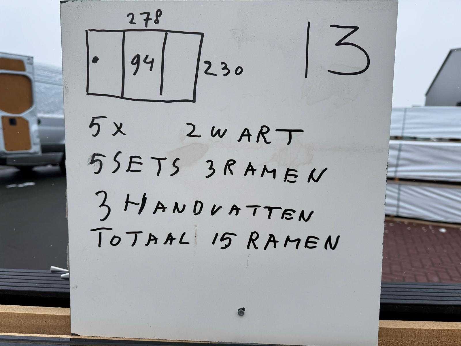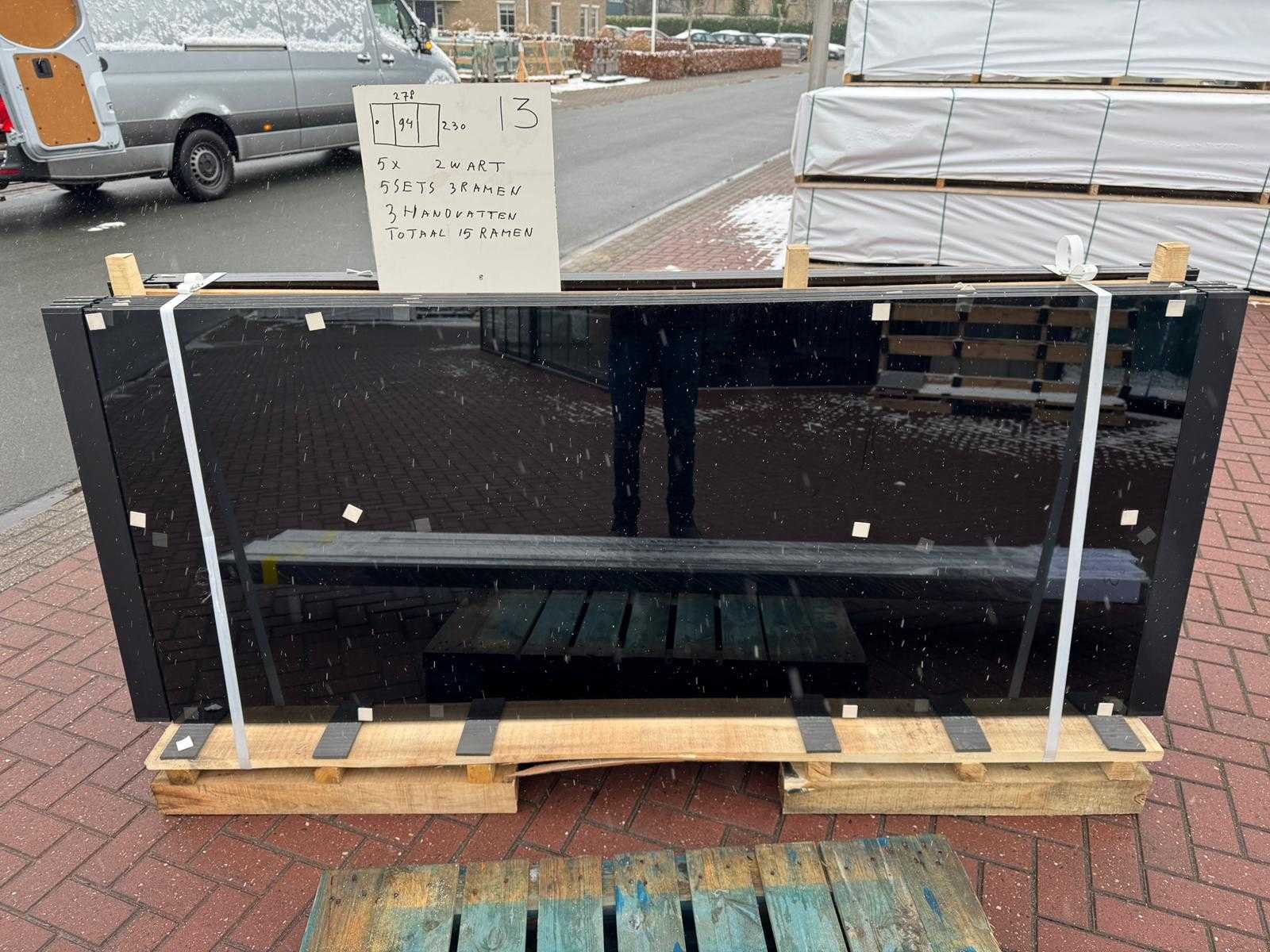 5 sets van 3 schuiframen – 94 cm x 230 cm, getint glas • Afmetingen per raam: breedte 94 cm, hoogte (dagmaat) 230 cm • Maximale breedte complete set: 278 cm • Totaal: 15 ramen (5 sets van 3 stuks) • Materiaal & kleur: zwart aluminium frame, getint glas • Inclusief: 5 boven- en 5 onder-rails met 3 sporen • 3 handgrepen • Conditie: partijhandel – kan lichte strepen of vegen bevatten • Verpakking: op pallet met glas • Opmerking: foto van overkapping is ter illustratie • Heftruck is aanwezig voor het afhalen Nee