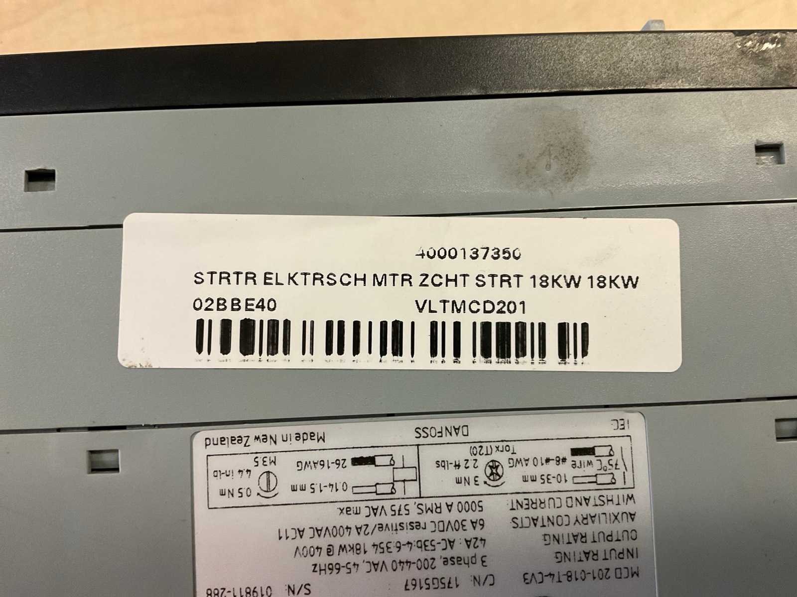 In: 3x380V Nee Merk: Danfoss Product type: VLT Compact Starter MCD 201 Digitaal: true Vermogen (kW): 18kW