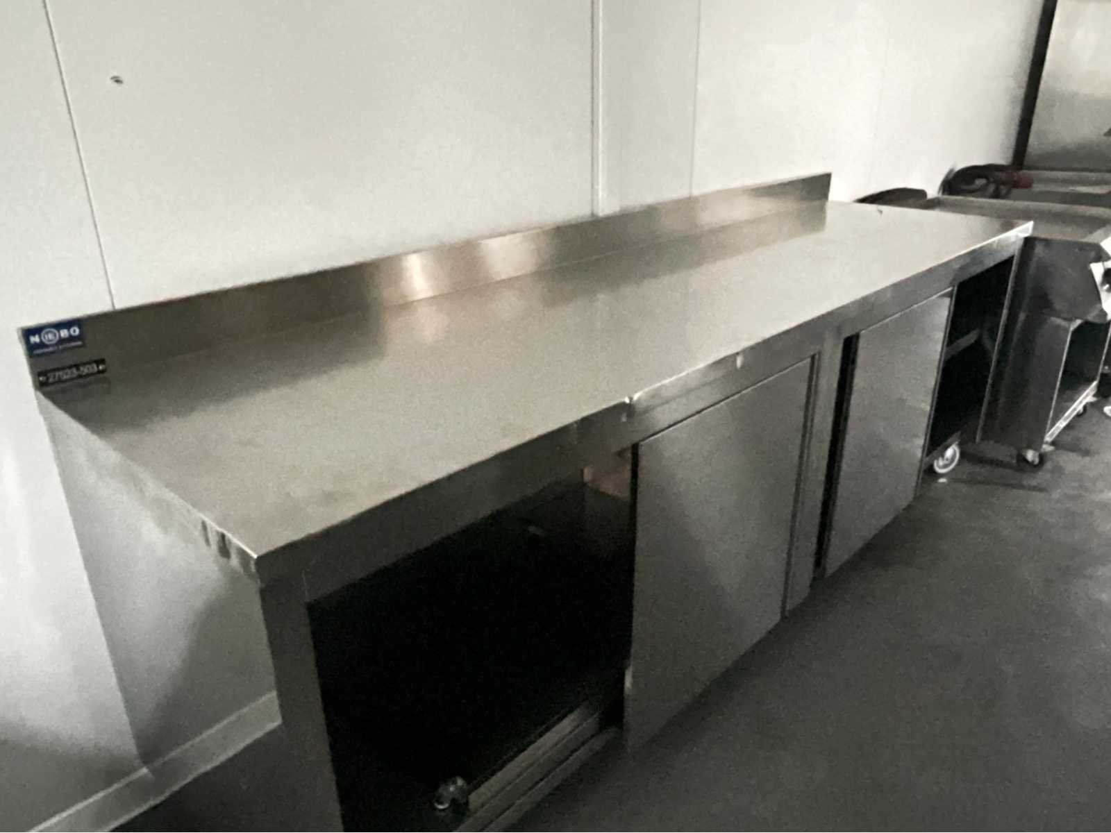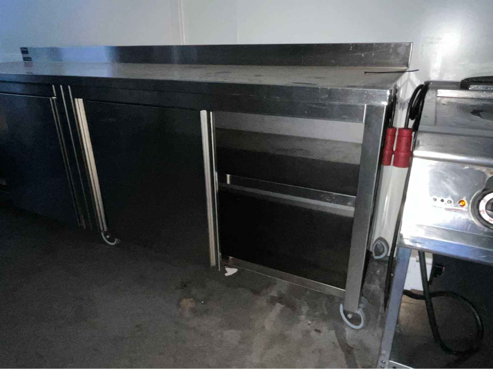Verrijdbaar; 2x onderkast voorzien van dubbele schuifdeur; waarvan 1 schuifdeur gedemonteerd; roestvast staal legborden; 6 zwenkwielen; Nee Merk: Emainox Bouwjaar: 2016 Totale afmeting L: 2600mm Totale afmeting Breedte: 700mm Totale afmeting Hoogte: 1050mm