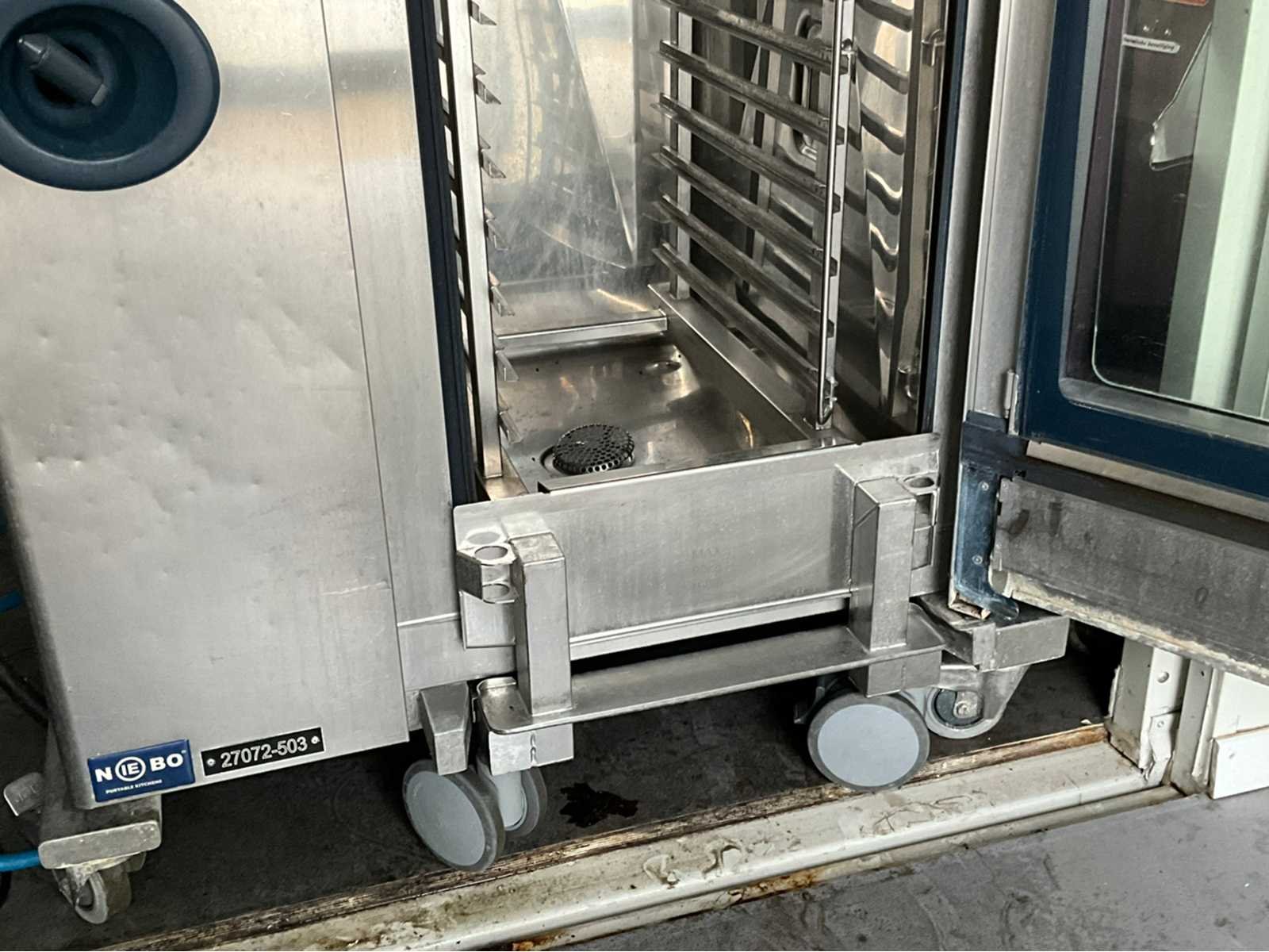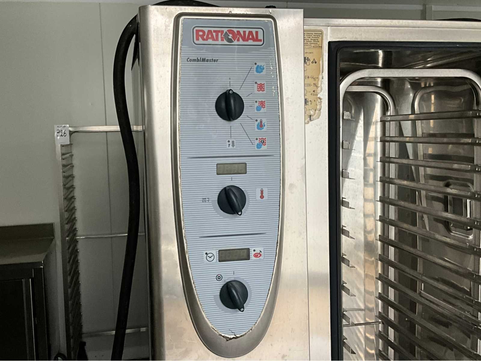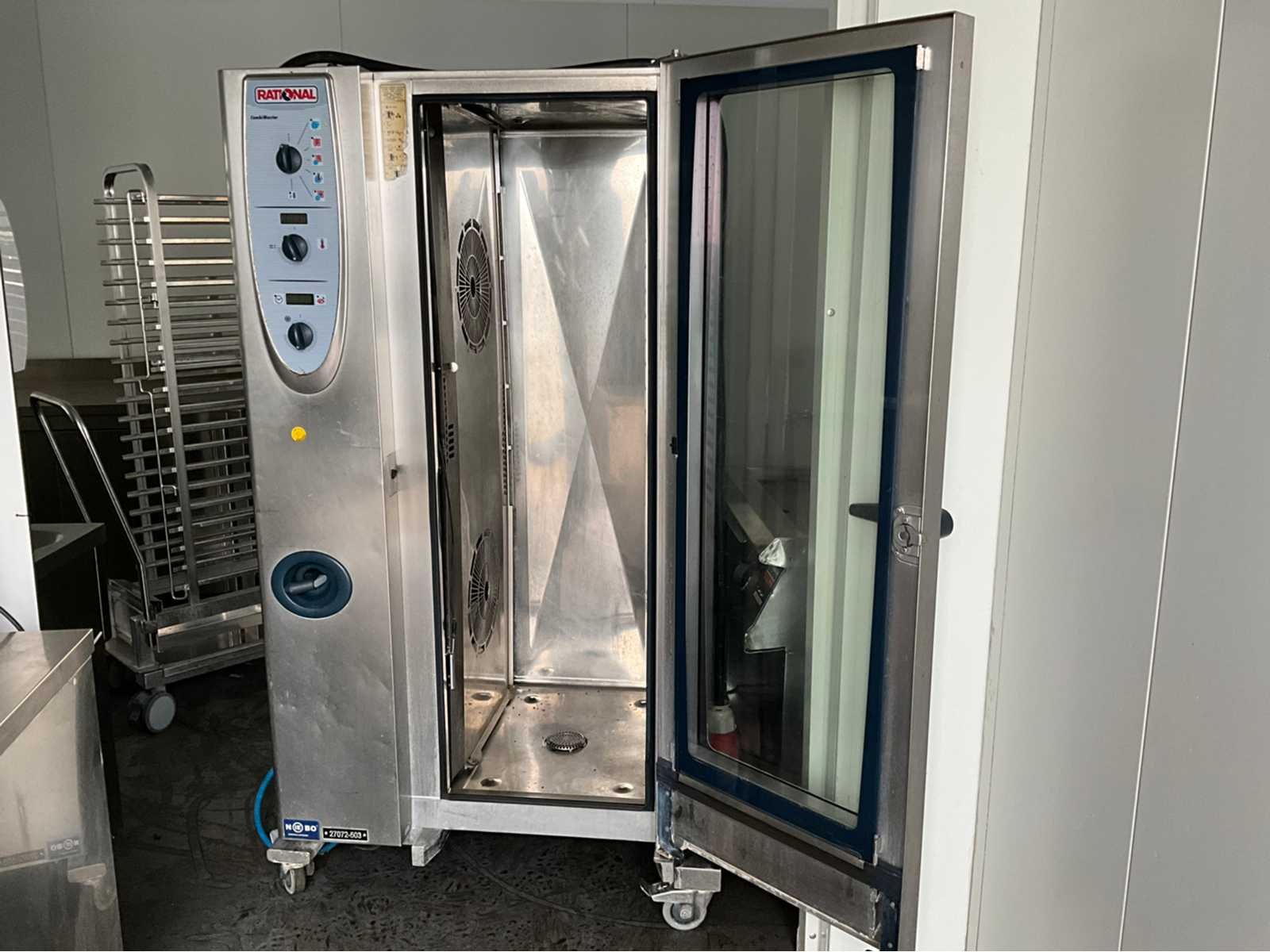 Verrijdbaar; inclusief 2x inrijwagen 20x niveau GN 1/1 waarvan 1 met afneembare duwbeugel; tiptoets bediening; spoeldouche; kern temperatuurmeting; afmeting 1050x860x1850 mm; working condition Nee Merk: Rational Bouwjaar: 2012 Type: Combimaster CM 201 Aantal niveau's: 20 Vermogen: 37000W Aansluiting: 400V Serienummer: E21MF06062066600 Elektrisch: true Rvs: true