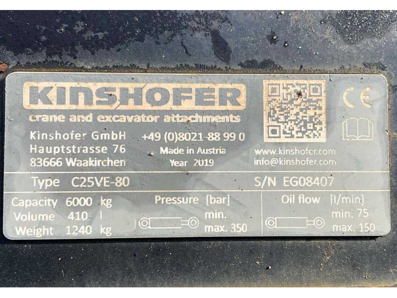 Inhoud 410 liter; rotator; SW21 aansluiting; working condition not verified; Nee Merk: Kinshofer Type: C25VE-80 Bouwjaar: 2019 Serienummer: EG08407 Eigen gewicht: 1240kg Totale afmeting L: 1900mm Totale afmeting Breedte: 800mm Totale afmeting Hoogte: 2700mm