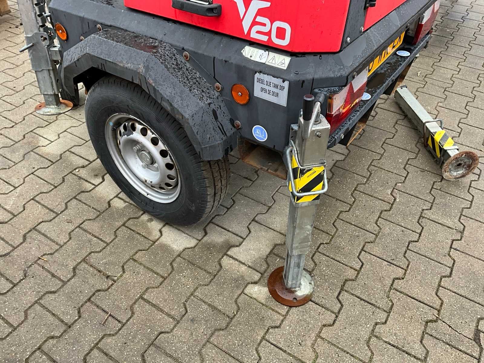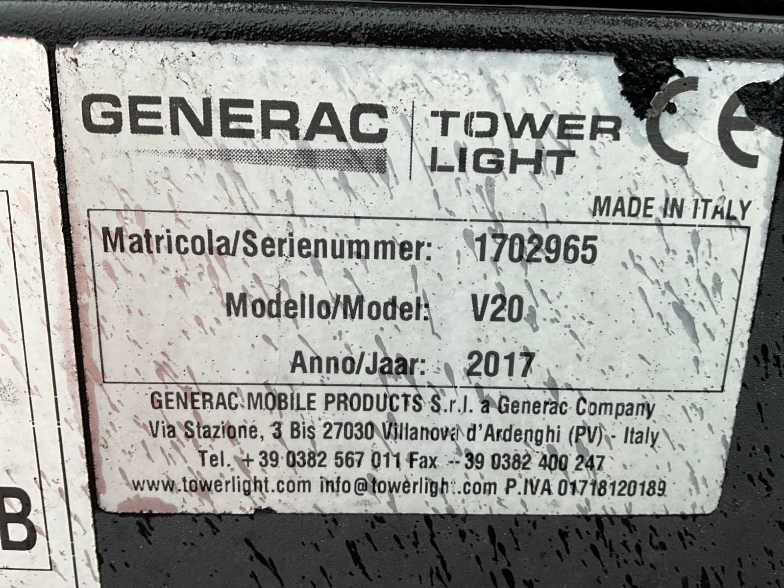 Laadvermogen: 220 kg; eigen gewicht: 980 kg; lengte 2200 mm; breedte 1450 mm; hoogte 2400 mm; hydraulische telescoopmast; maximale werkhoogte 8,5 meter; Kubota dieselmotor; Linz alternator; zonder sturing; 4x stempelvoeten; urenstand niet afleesbaar; ingebouwde brandstoftank; 230 Volt; heftruck vorksleuven; neuswiel; oplooprem; working condition; (de koper dient bij transport over de weg zelf te voorzien in een geldig kenteken; een 13 polige aansluitstekker of verloopstuk met kabel (verlengsnoer kan ter plaatse tegen betaling aangekocht worden); eventueel extra lichtbalk; Nederlandse kentekenpapieren; zonder gelijkvormigheidsattest; Nee Merk: Generac Mobile Products Type: VB9 V20 Bouwjaar: 2017 Chassisnummer: ZNEVB9D0017000415 + 1702965 Aantal assen: 1 Ledig gewicht: 980kg Laadvermogen: 220kg Datum eerste toelating: 2017-07-14 Datum eerste toelating (NL): 2017-07-14 Kenteken: 20-WR-LX Nationaliteit documenten: Nederlands