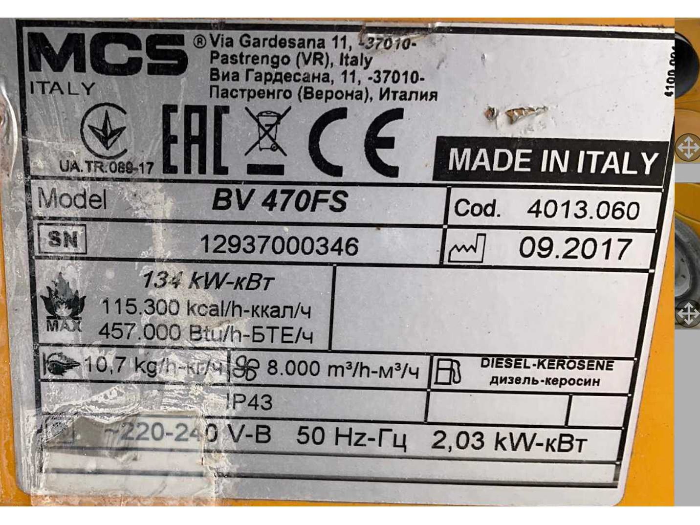 Verrijdbaar; diesel gestookt; brander Riello; volumestroom 8000 m3 / uur; 230 Volt; 8,8 Ampère; 2 kW; 4x luchtuitlaat diameter 270 mm; rookgasafvoer; brandstofleiding; working condition; Nee Merk: MCS Type: Master Air-Bus BV 470 FS Bouwjaar: 2017 Serienummer: 12937000346 Vermogen: 134kW Ventilator: true Totale afmeting L: 1700mm Totale afmeting Breedte: 900mm Totale afmeting Hoogte: 1650mm Aansluiting: 230V