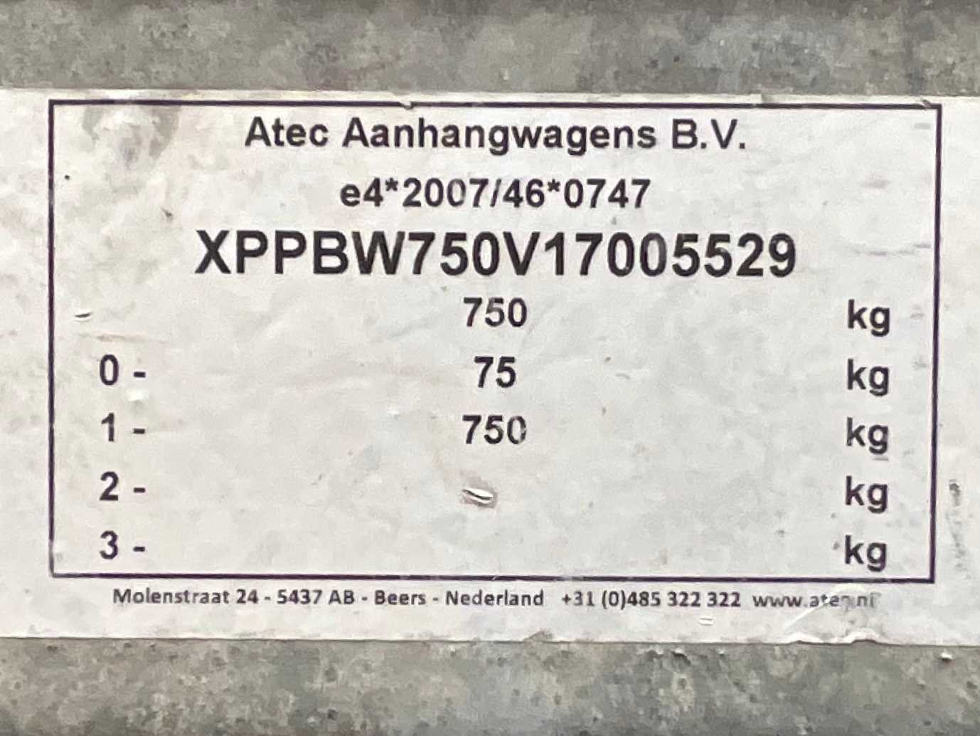 Lengte 3900 mm; breedte 1800 mm; hoogte 1500 mm; gegalvaniseerd staal frame; hout schotten; koprek; neuswiel; achterlicht te herstellen; (de koper dient bij transport over de weg zelf te voorzien in een geldig kenteken; een 7 of 9 polige aansluitstekker of verloopstuk met kabel (verlengsnoer kan ter plaatse tegen betaling aangekocht worden); eventueel extra lichtbalk; Duitse kentekenpapieren; gelijkvormigheidsattest; (VIE-YC979) Nee Merk: Atec Type: EO1300 Bouwjaar: 2017 Chassisnummer: XPPBW750V17005529 Aantal assen: 1 Laadbak afmeting l: 250cm Laadbak afmeting b: 130cm