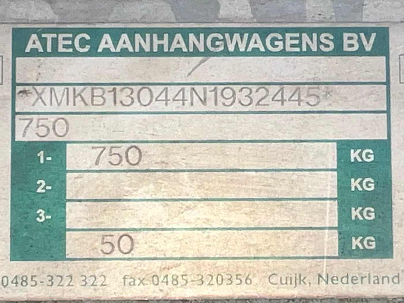 Lengte 3900 mm; breedte 1800 mm; hoogte 1500 mm; zonder huif; gegalvaniseerd staal frame; hout schotten; koprek; (de koper dient bij transport over de weg zelf te voorzien in een geldig kenteken; een 7 of 9 polige aansluitstekker of verloopstuk met kabel (verlengsnoer kan ter plaatse tegen betaling aangekocht worden); eventueel extra lichtbalk; zonder kentekenpapieren; zonder gelijkvormigheidsattest; Nee Merk: Atec Type: EO1300 Bouwjaar: 2009 Chassisnummer: XMKB13044N1932445 Aantal assen: 1 Laadbak afmeting l: 250cm Laadbak afmeting b: 130cm