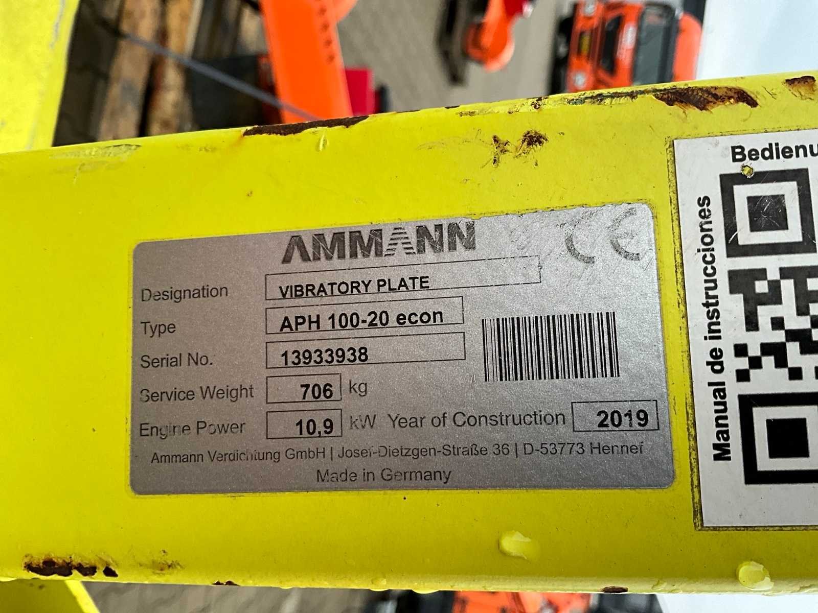 Bedieningsboom; hijsoog; working condition Nee Merk: Ammann Type: APH 100-20 Bouwjaar: 2019 Serienummer: 13933938 Grondplaat afm. l: 1000mm Grondplaat afm. b: 750mm Centrifugale kracht: 100kN Merk motor: Hatz Motorvermogen (kW): 10kW Brandstof: Diesel Eigen gewicht: 706kg Totale afmeting L: 1100mm Totale afmeting Breedte: 750mm Totale afmeting Hoogte: 1750mm