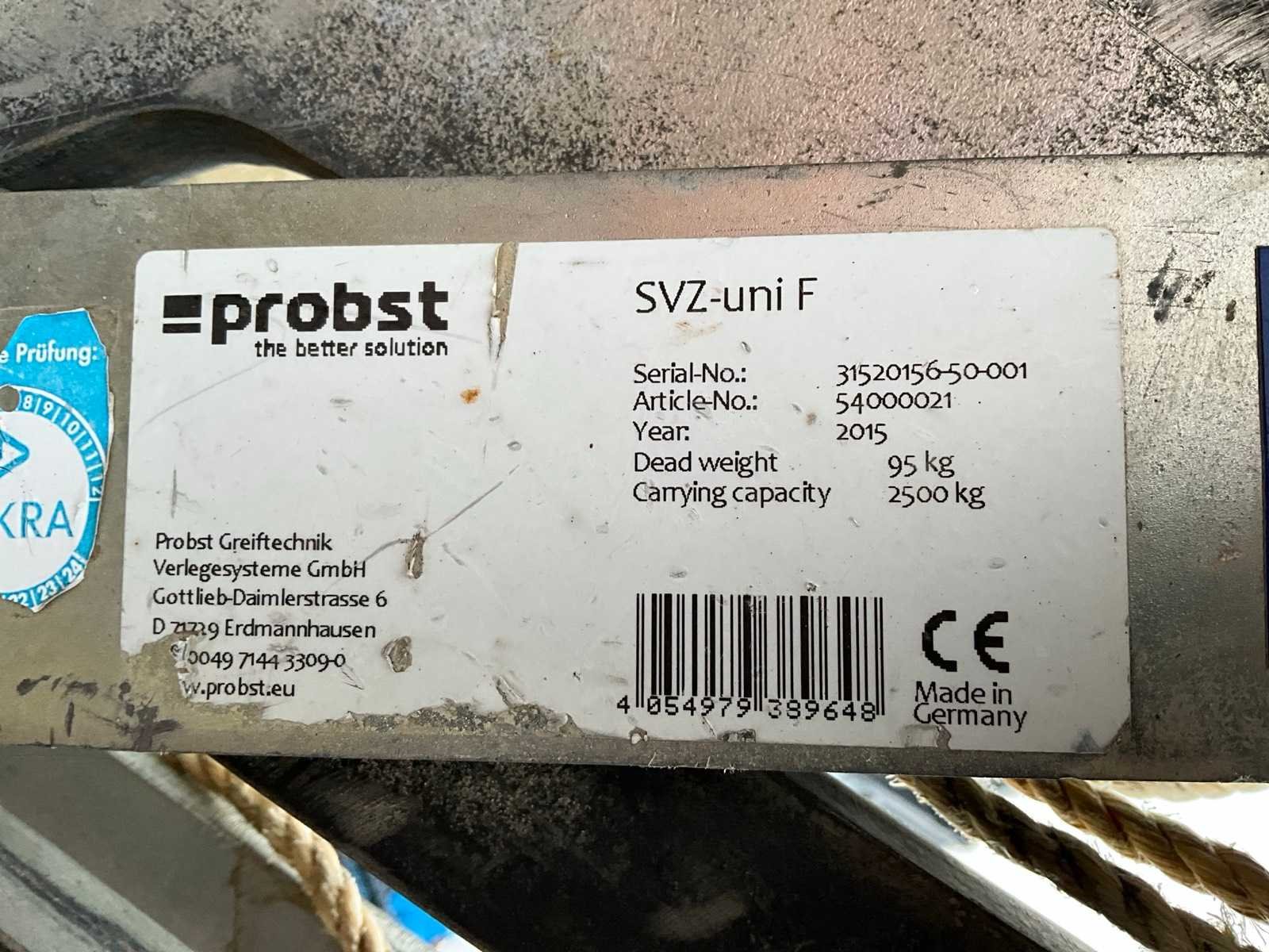 Instelbereik 625-1500 mm; working condition not verified; Nee Merk: Probst Type: SVZ-uni Bouwjaar: 2015 Serienummer: 31520156-50-001 Hijsvermogen: 2500kg Eigen gewicht: 95kg Totale afmeting L: 1100mm Totale afmeting Breedte: 1100mm Totale afmeting Hoogte: 1000mm